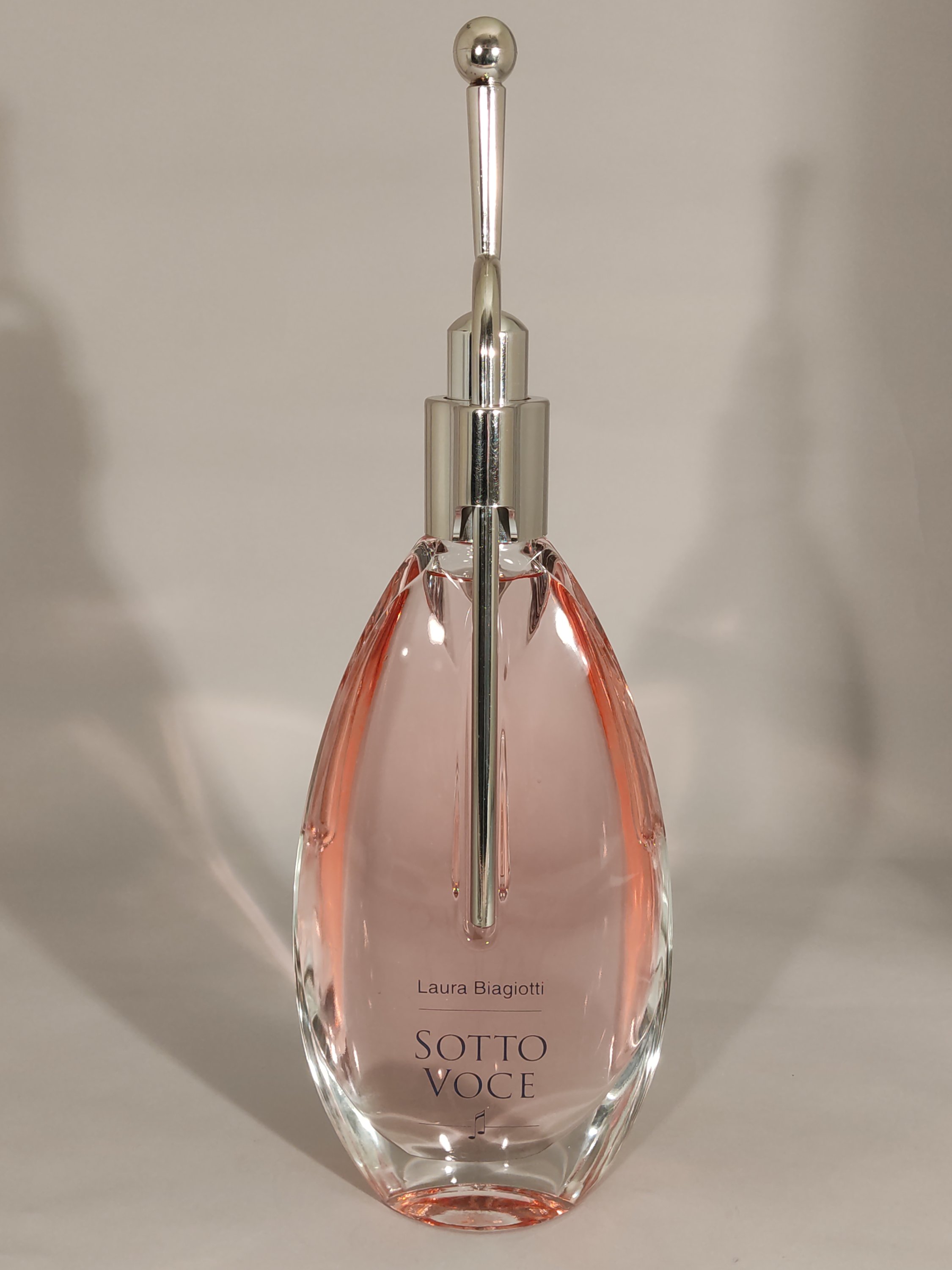 Imposant flacon publicitaire décoratif en verre incolore pressé moulé et Surlyn, sa panse galbée coiffée de son bouchon figurant un diapason.