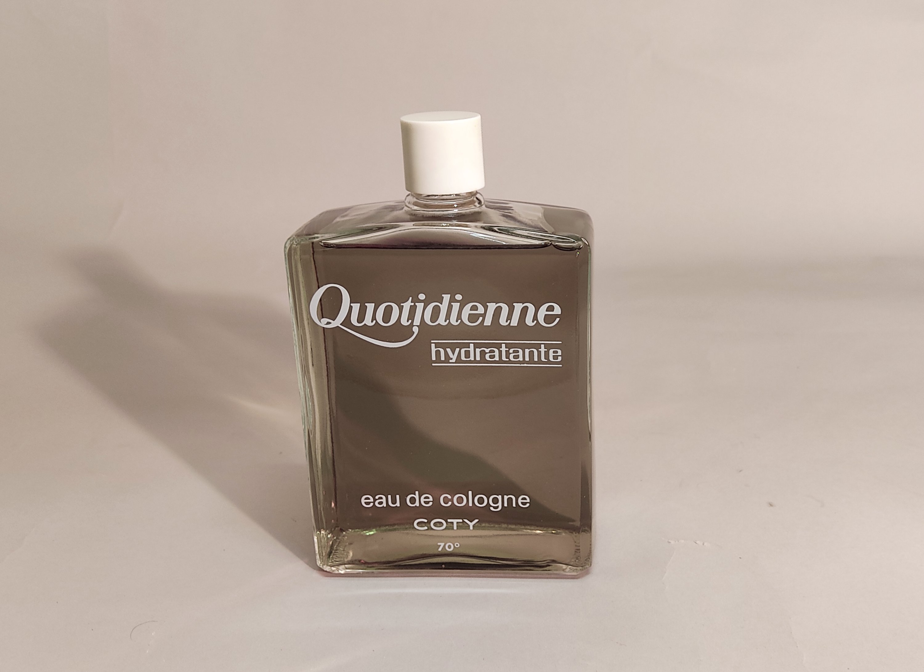 Flacon publicitaire décoratif en verre incolore pressé moulé, titré, avec capsule en résine blanche.