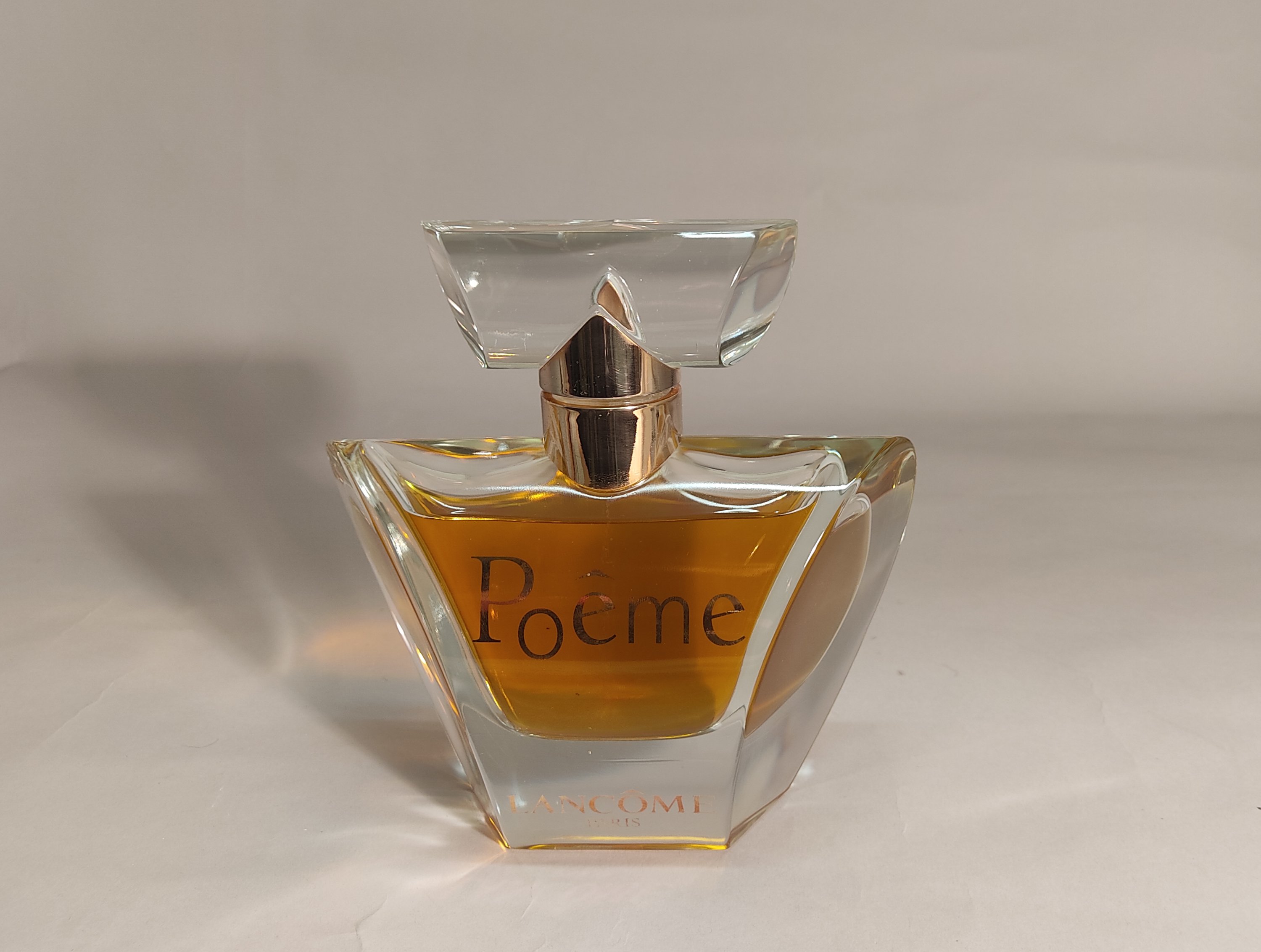 Flacon publicitaire décoratif en verre massif incolore pressé moulé et titré avec capsule en zamak.
