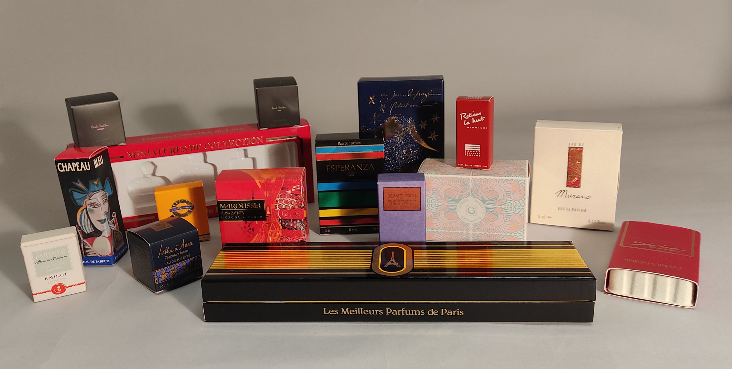 Assortiment de diminutifs parfums présentés dans leur coffret.