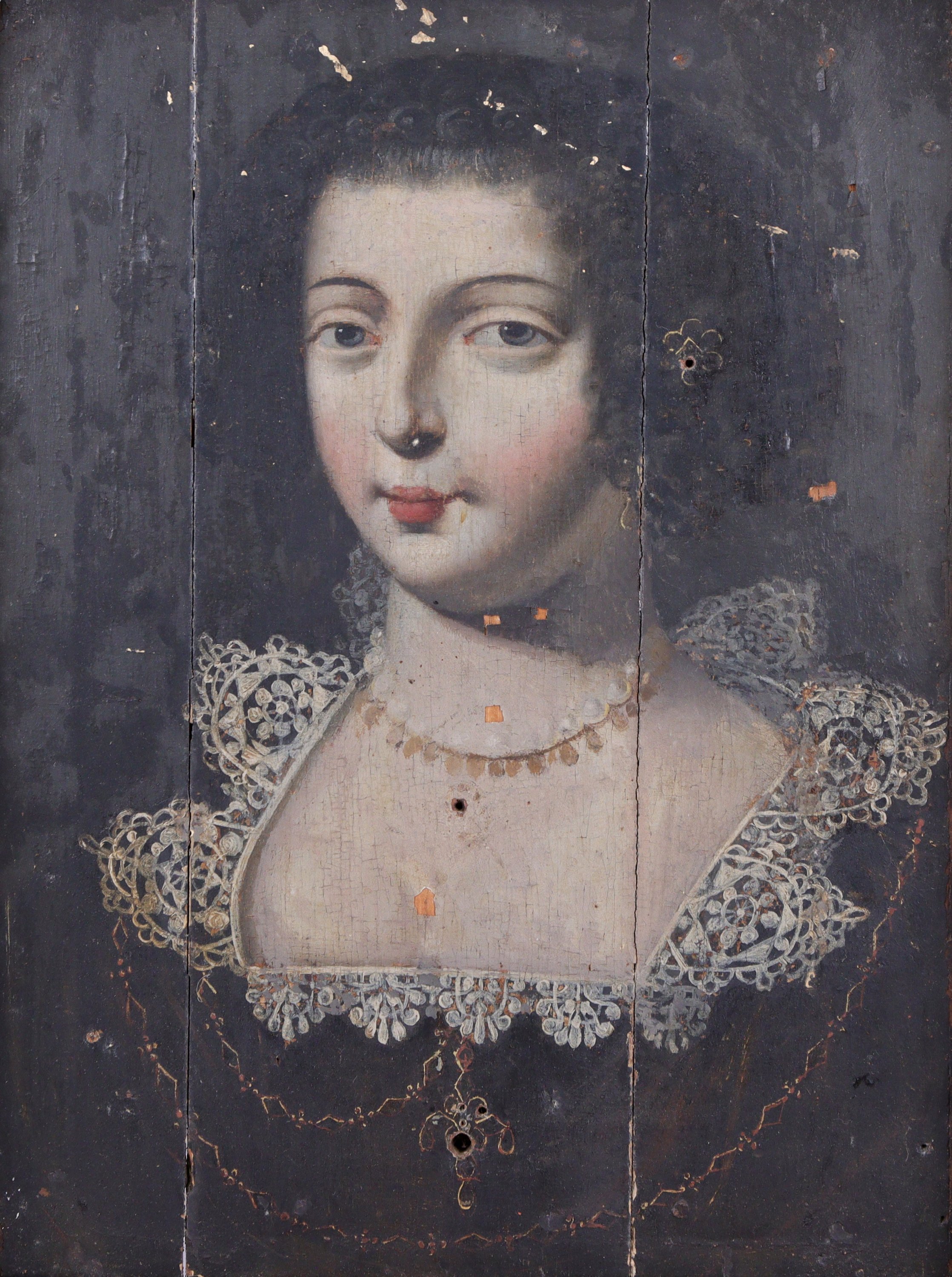Béatrix de Cusance, épouse en secondes noces le Duc de Lorraine Charles IV en 1637. Protectrice des arts, Van Dyck fera plusieurs portraits d'elle. Ce type de portraits était souvent habillé de pierreries; on en voit encore l'emplacement en certains