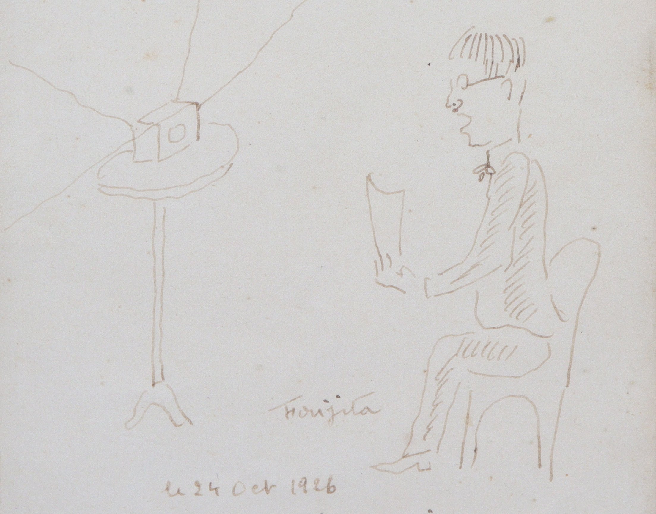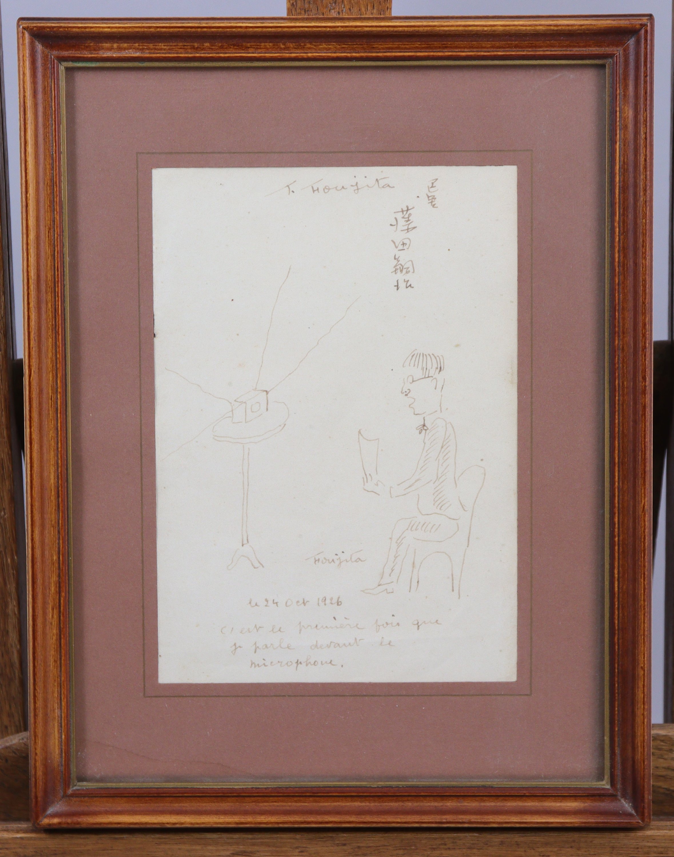 A l'occasion du Salon du Franc en octobre 1926, les artistes étrangers exposèrent au Palais Galliera, où participèrent entre autres Picasso et Foujita. Ce dernier réalisa l'affiche et dût répondre à la presse, tel que ce croquis le souligne.