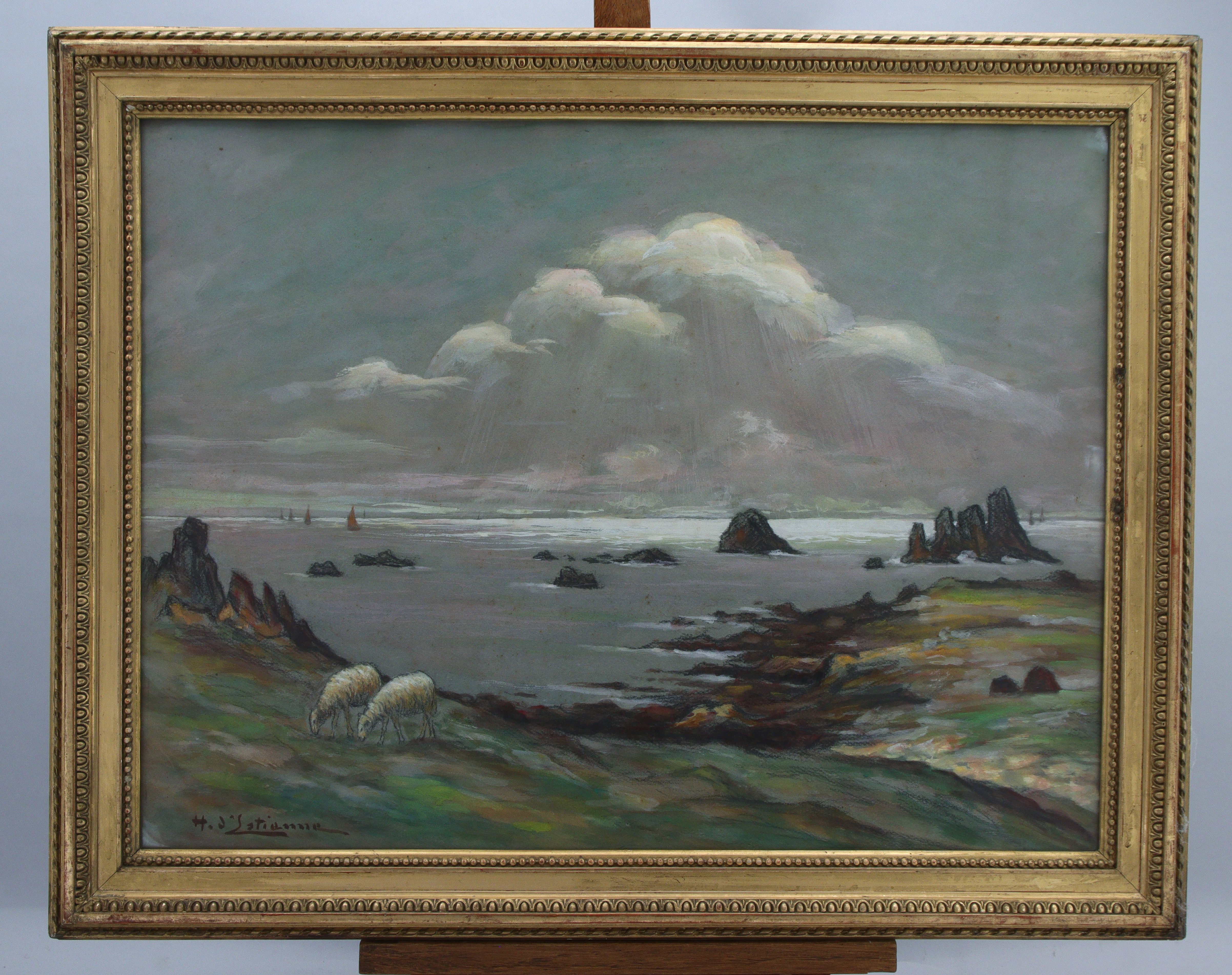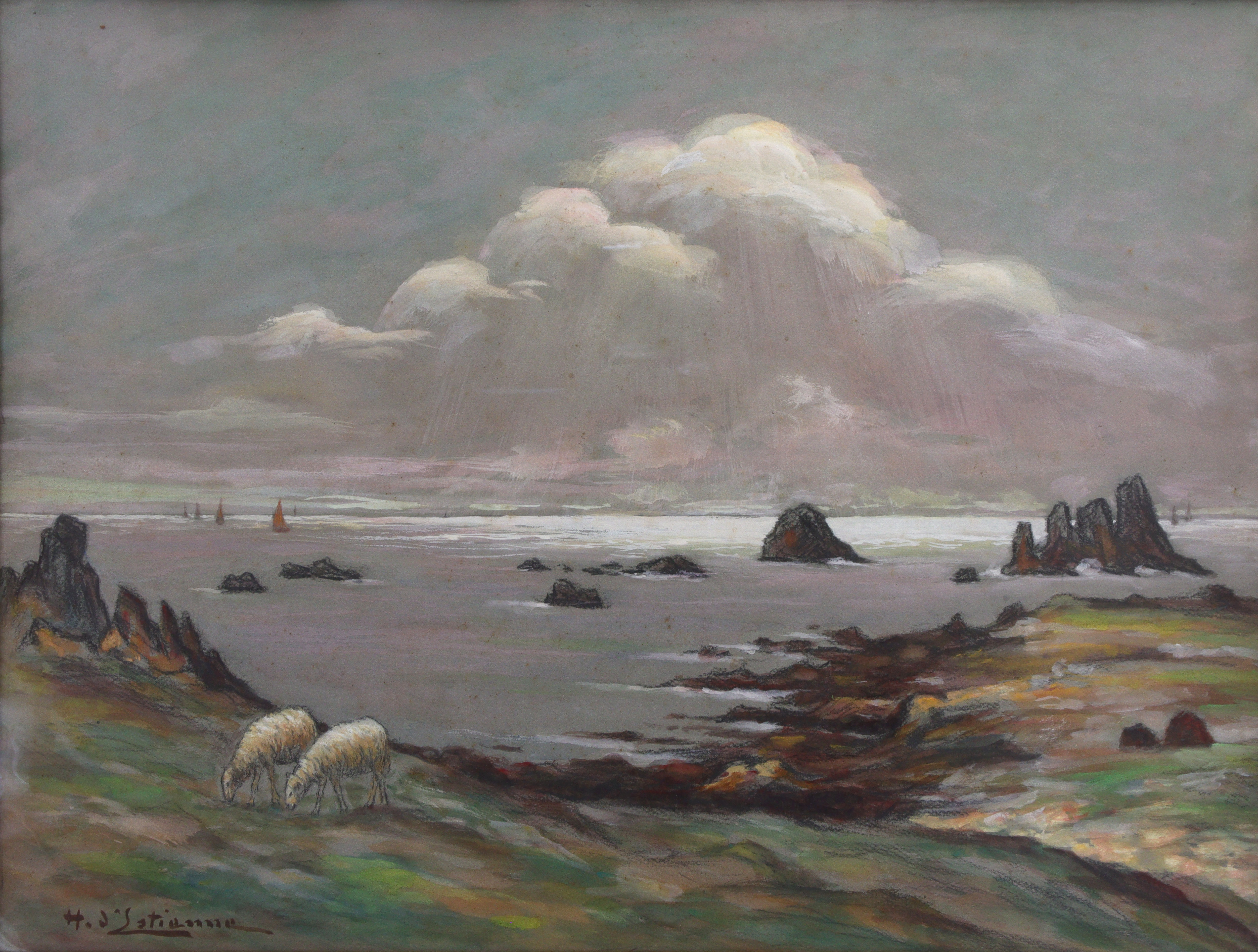 Joint: Henry d'Estienne (Français, 1872-1949) Moutons en bord de mer, gouache signée. Haut. 43 Larg. 57 cm.