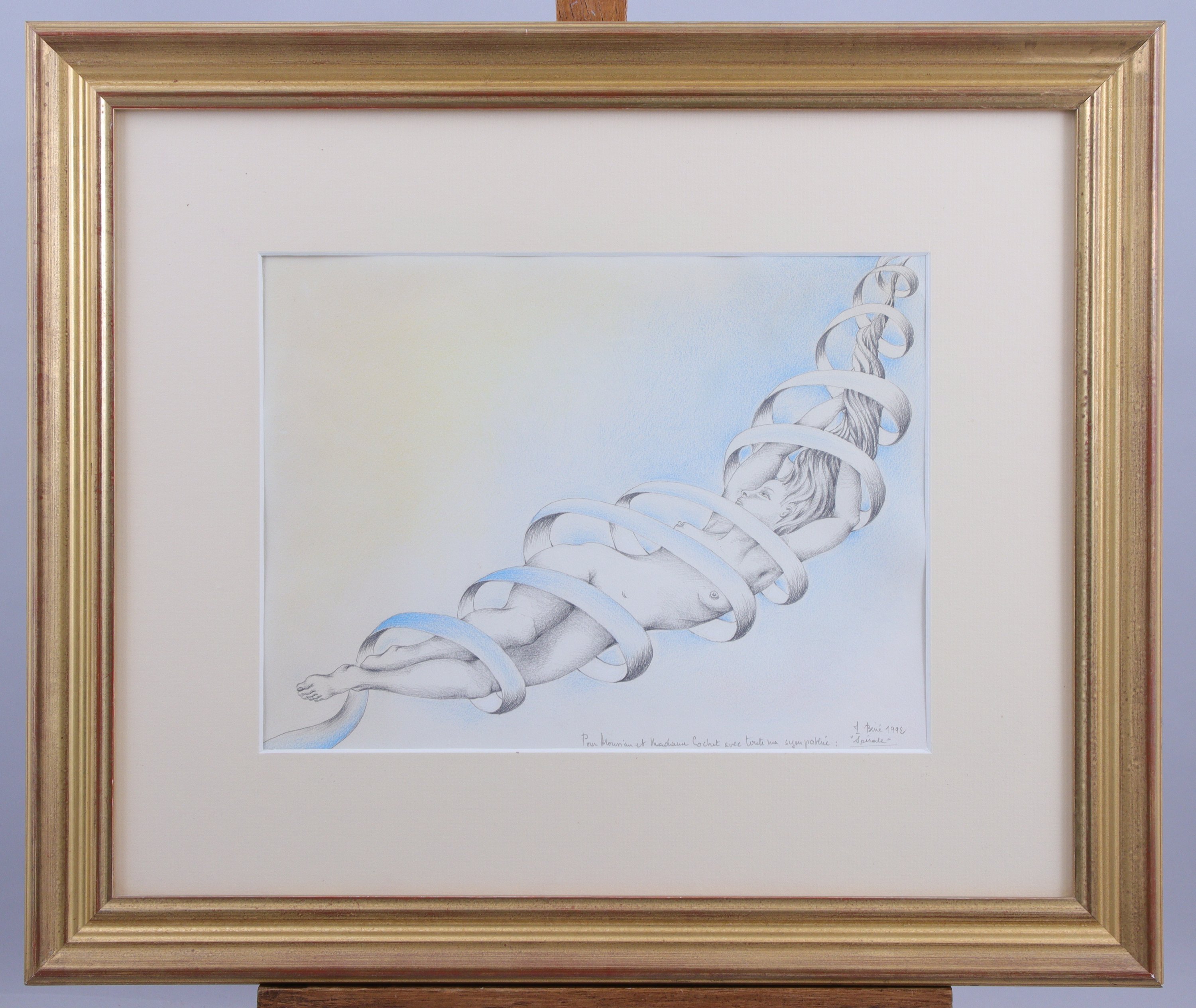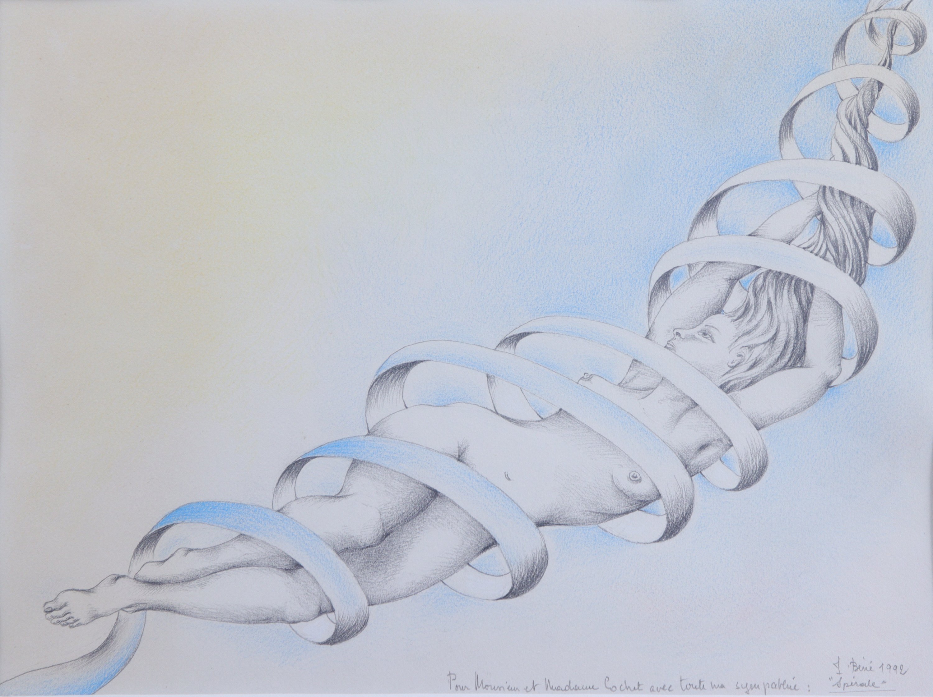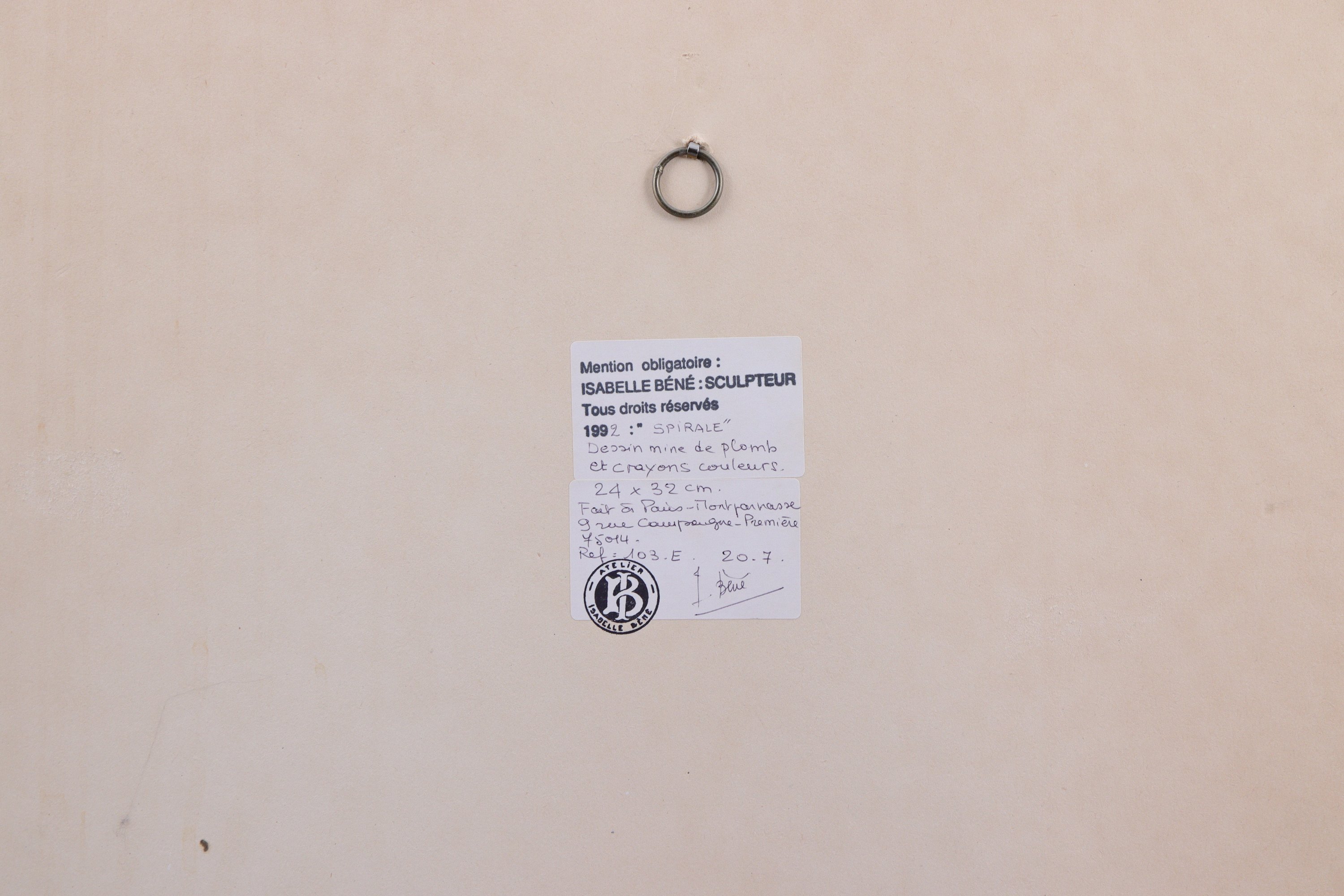 Joint: Isabelle Béné (Française). "Spirale", 1992. Crayon et crayons de couleurs sur papier signé et daté en bas à droite avec envoi. Haut. 22,5 Larg. 30,5 cm. (à vue)