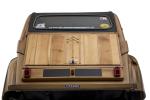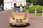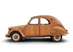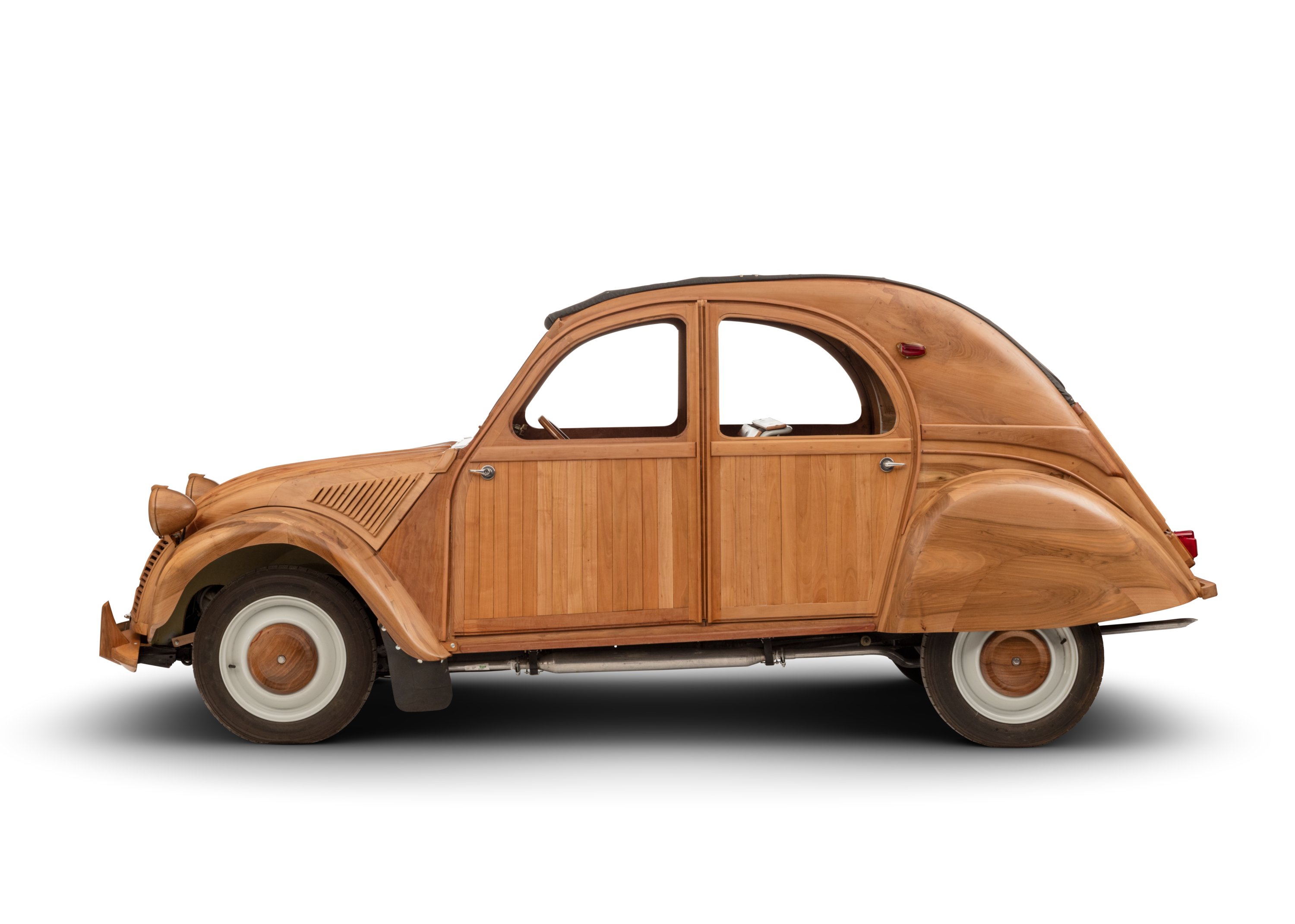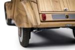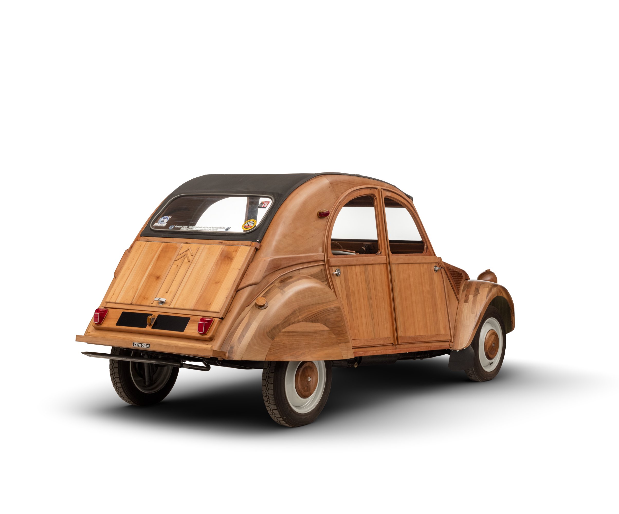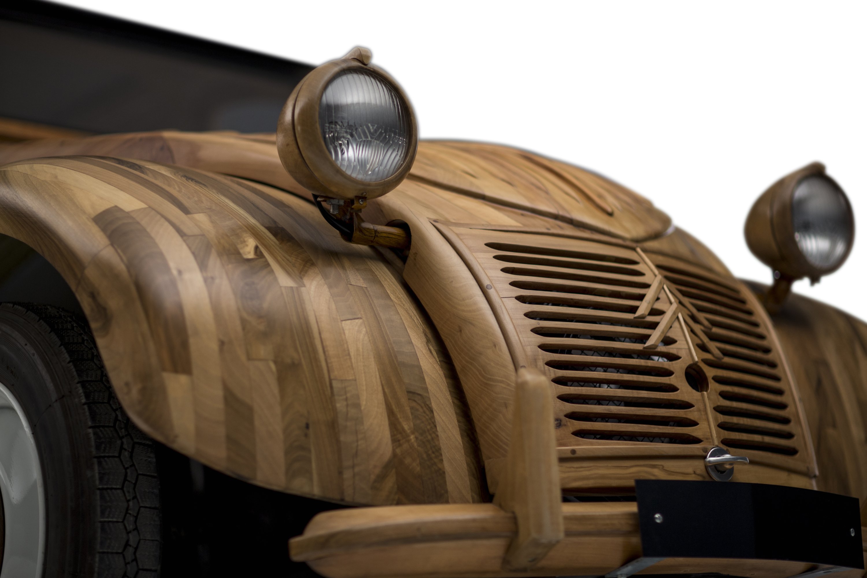 A fully functioning Citroen 2CV car with a wooden body by Michel Robillard. Alpaca sunroof cover, grey fabric interior.