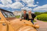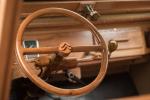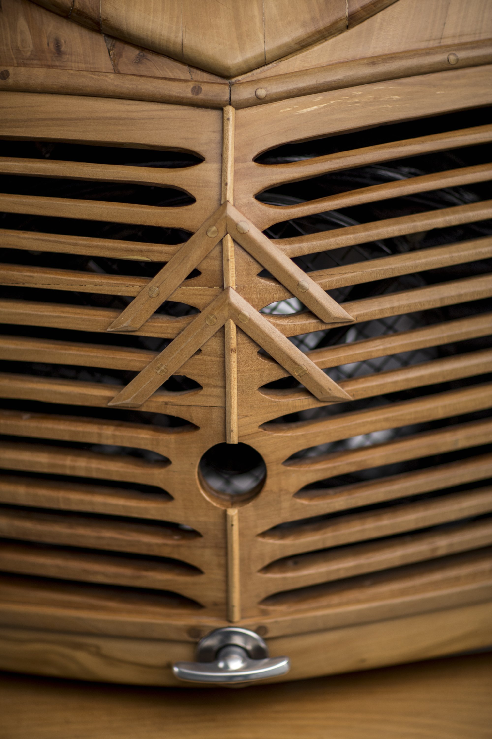 Automobile quatre places entièrement réalisée en bois fruitier: noyer pour les ailes avant et arrière, poirier et pommier pour la carrosserie, merisier pour le remplissage des portes et le coffre arrière, loupe d’orme pour le tableau de bord. Capote noire en alpaga. Sellerie en tissus gris.