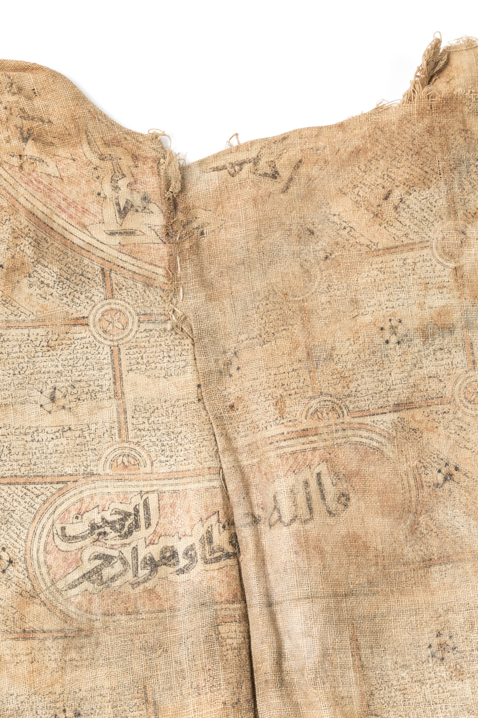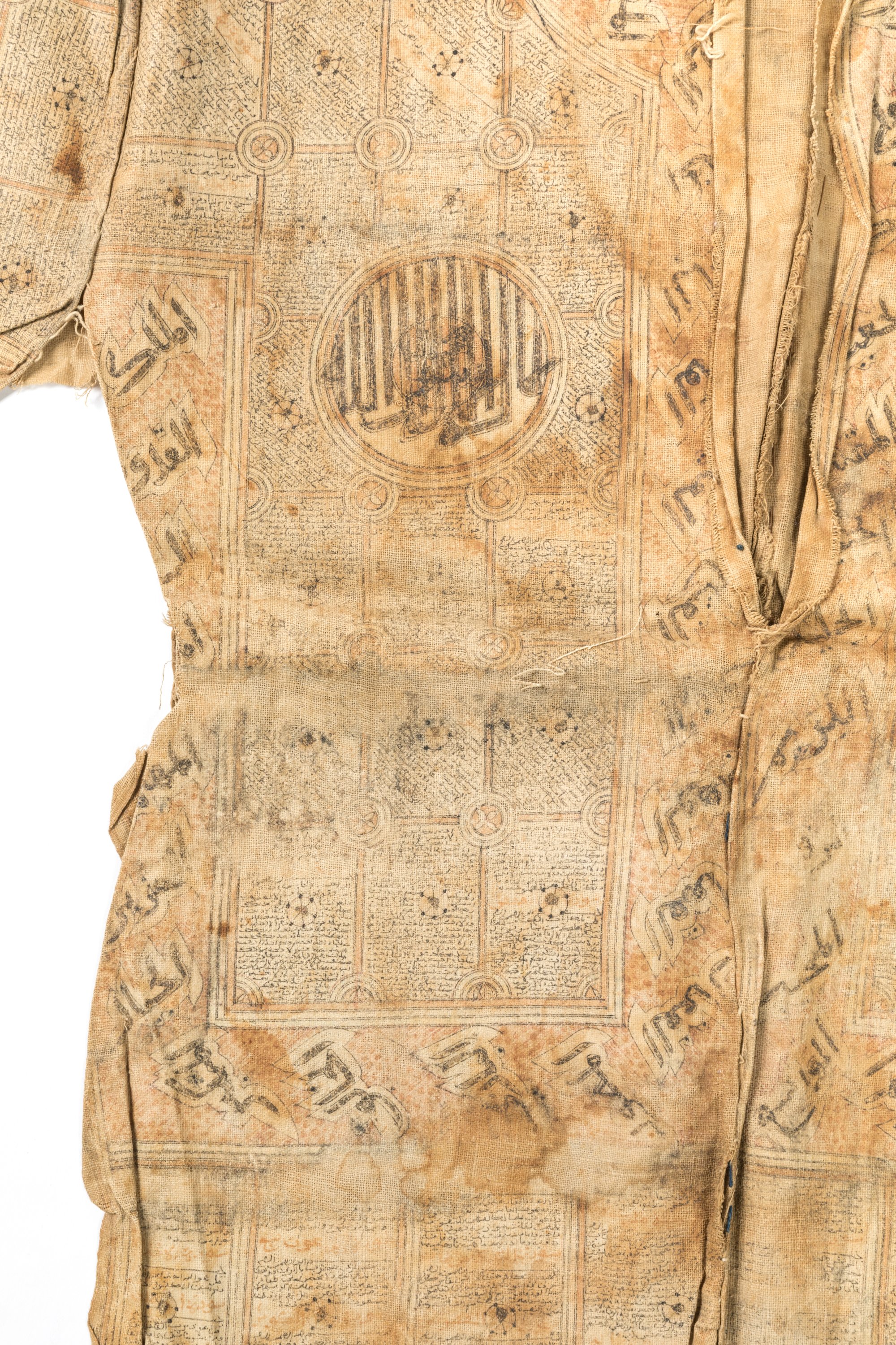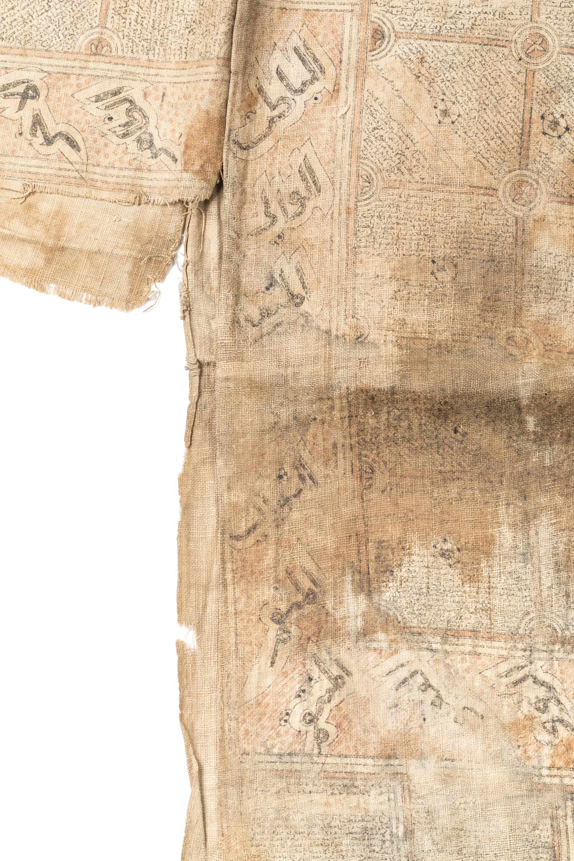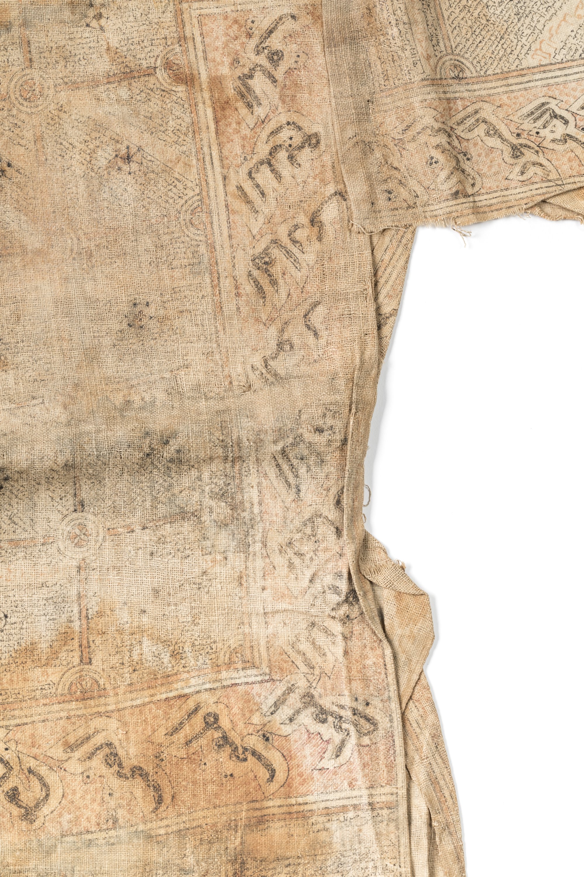 Mughal Indian, 17th century. A rare talismanic shirt comprised of six rectangular cotton pieces sewn together and covered with black, red and beige (formerly gold?) inscriptions: Qur'anic verses, the Shahadah, one verse of the Surah Yusuf (Chapter 12, 64) and the divine names of Allah.