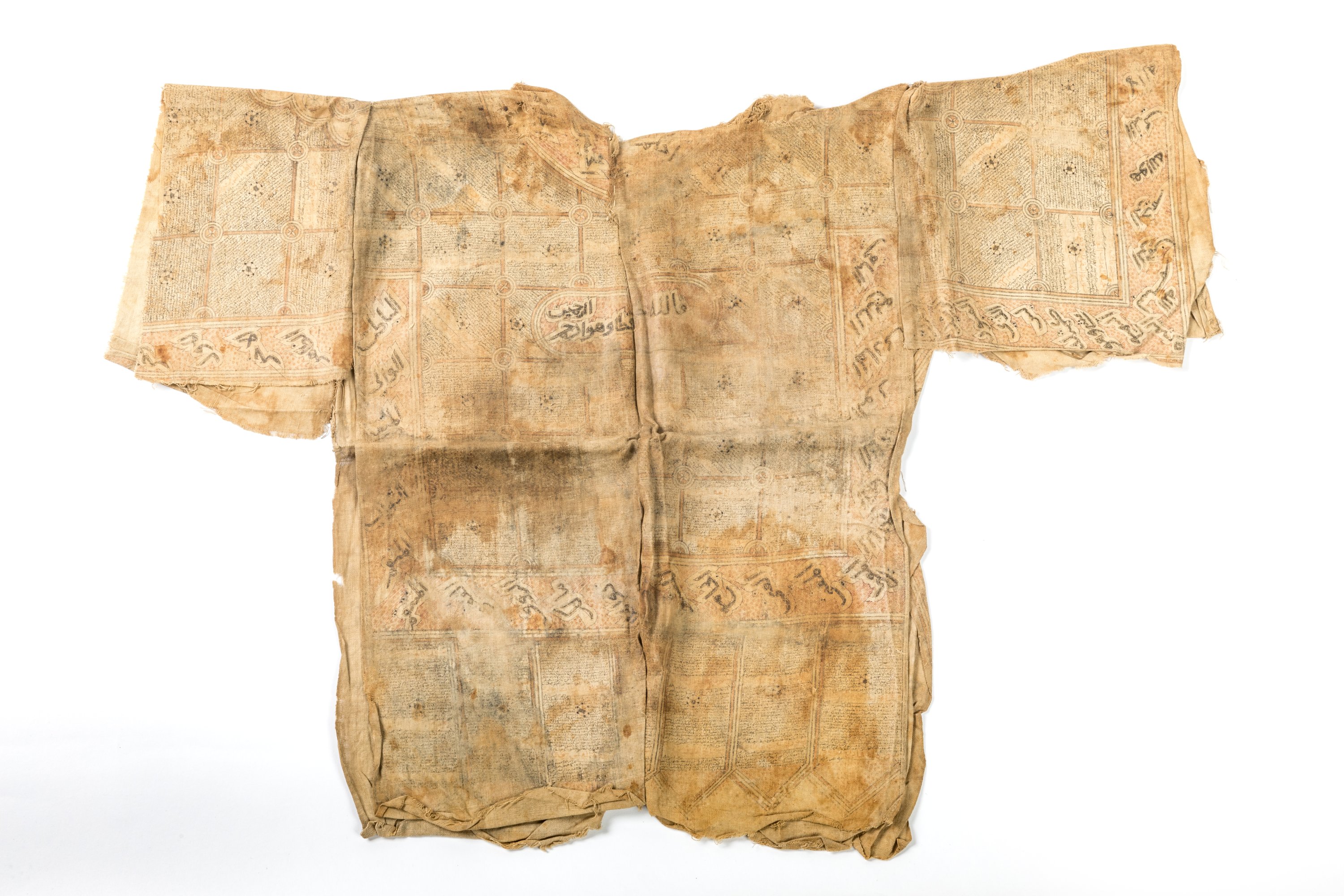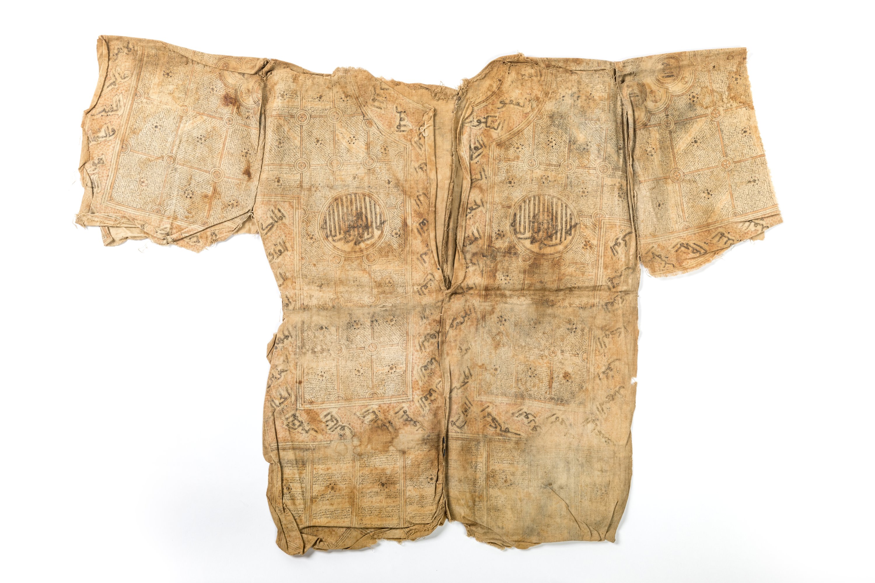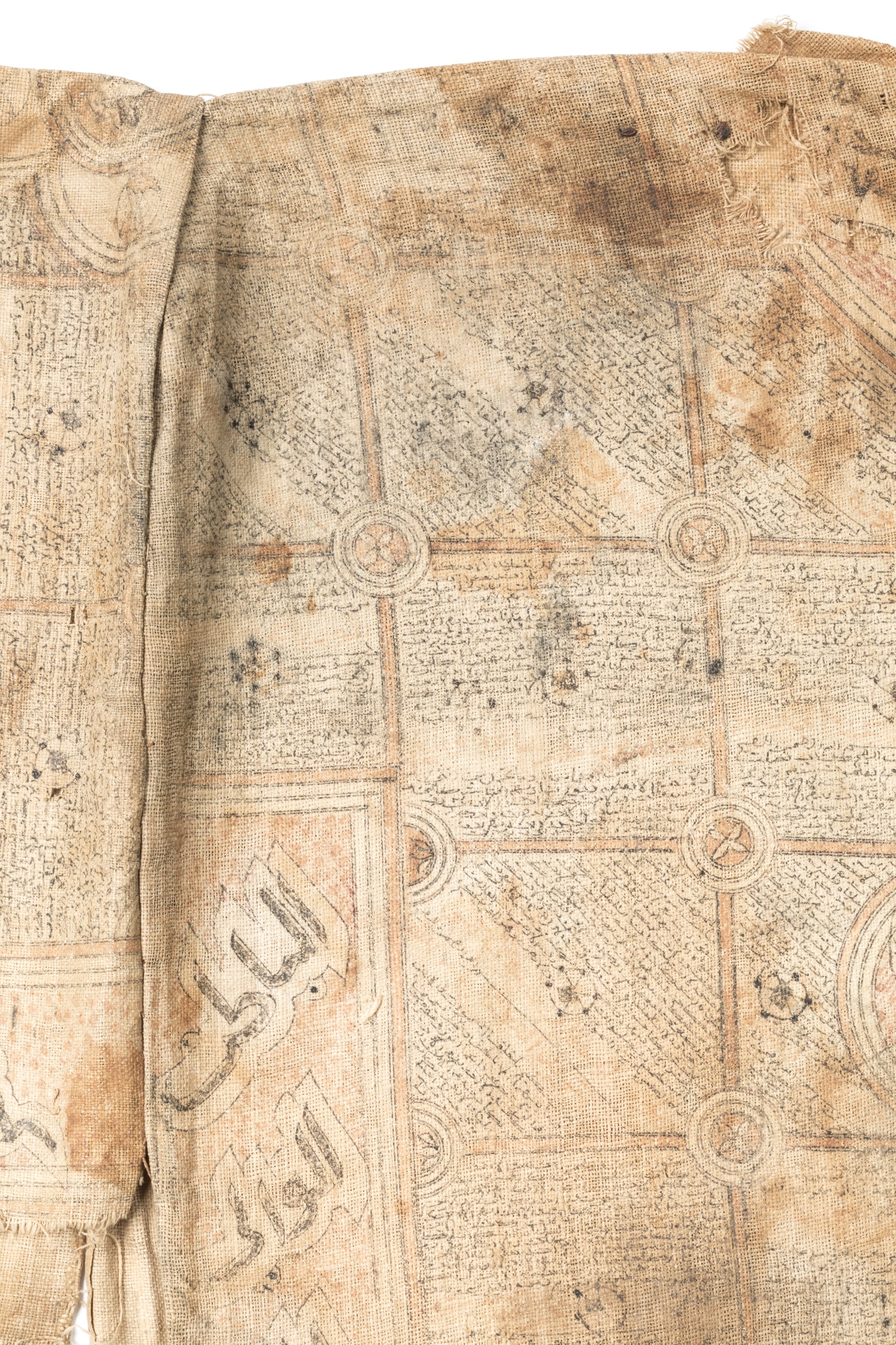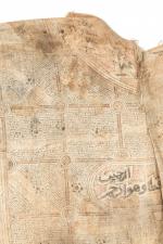 Mughal Indian, 17th century. A rare talismanic shirt comprised of six rectangular cotton pieces sewn together and covered with black, red and beige (formerly gold?) inscriptions: Qur'anic verses, the Shahadah, one verse of the Surah Yusuf (Chapter 12, 64) and the divine names of Allah.