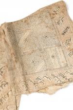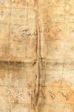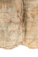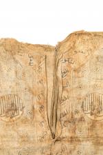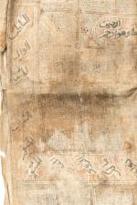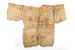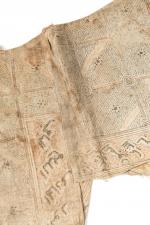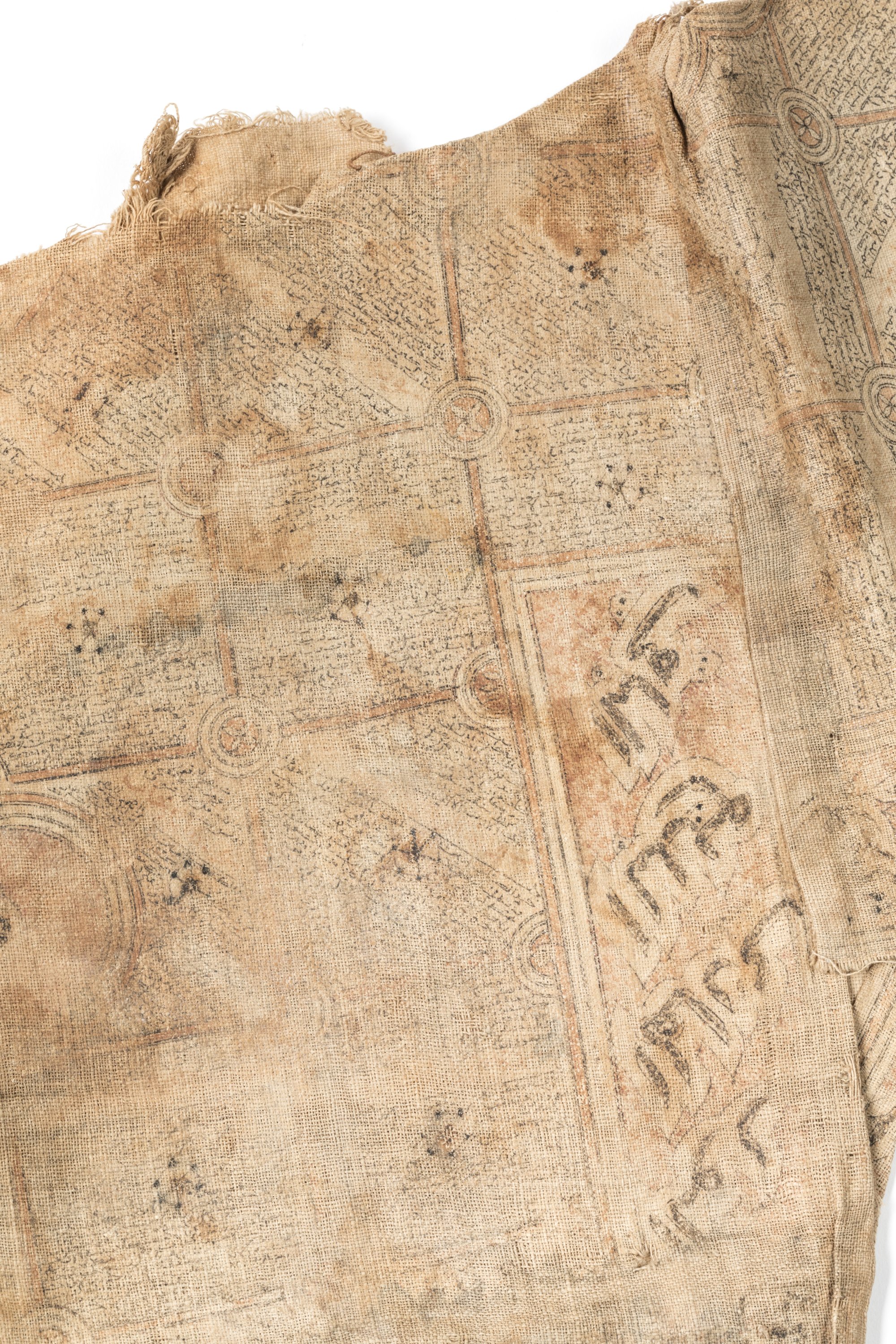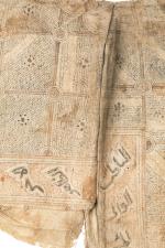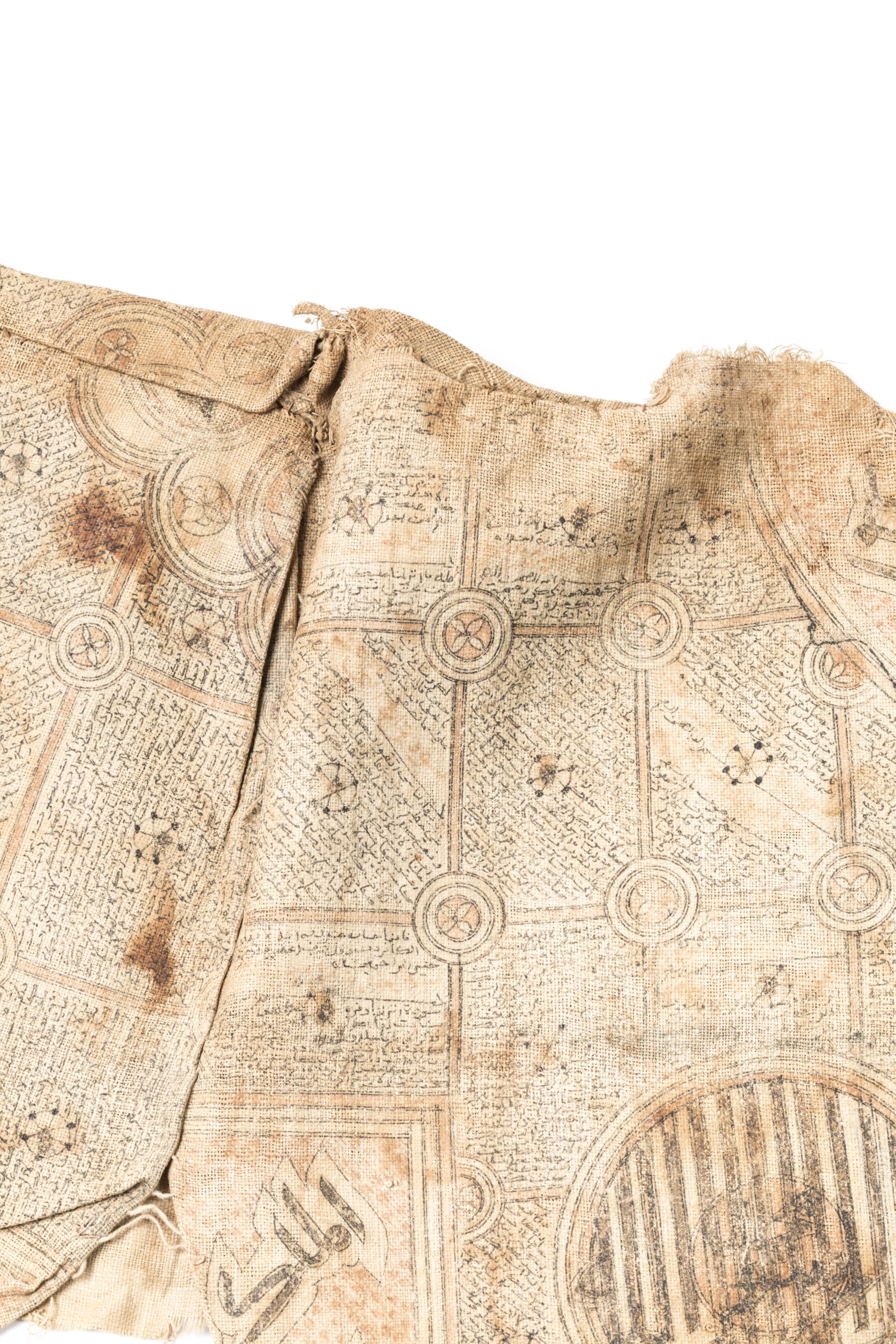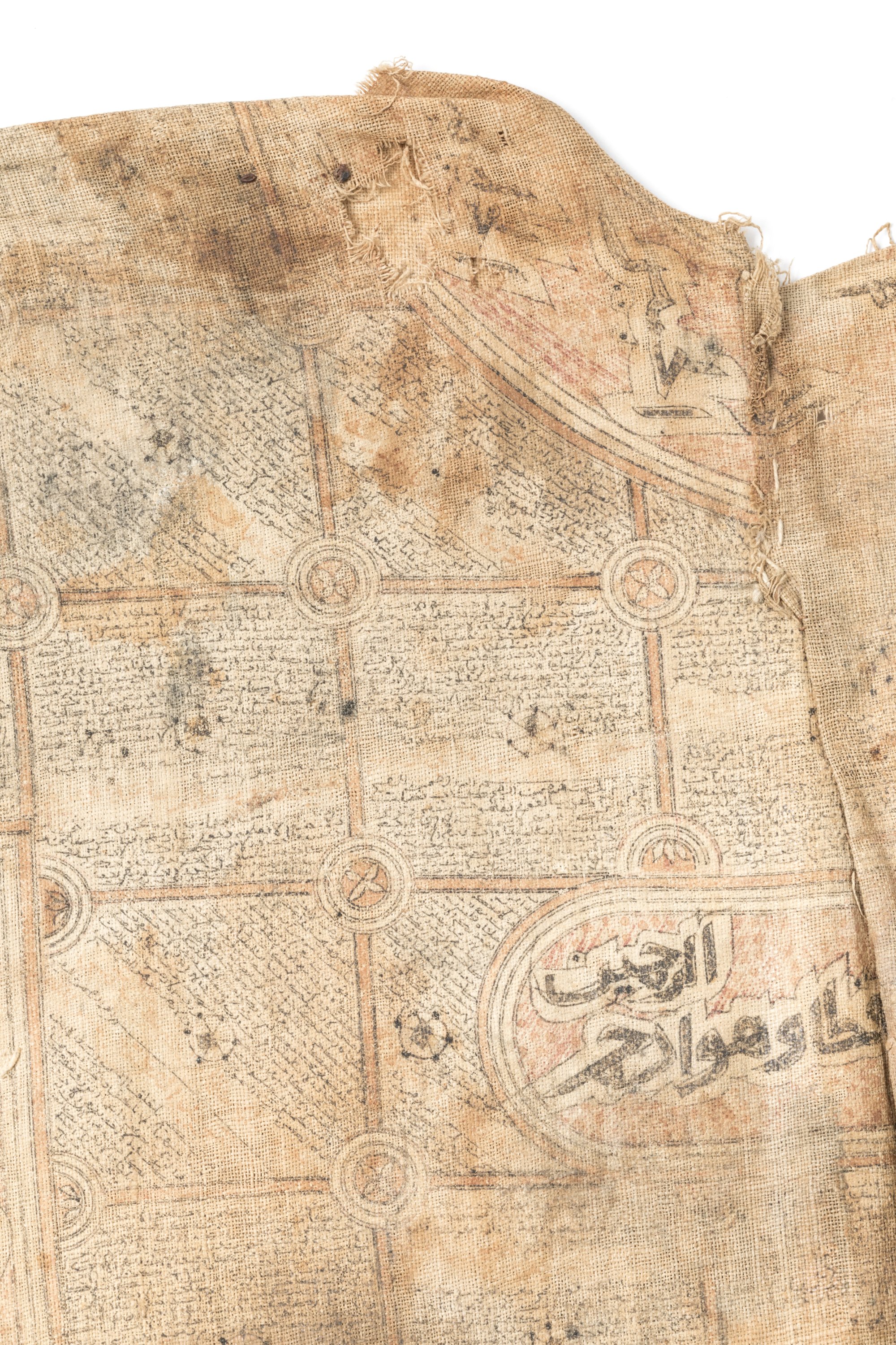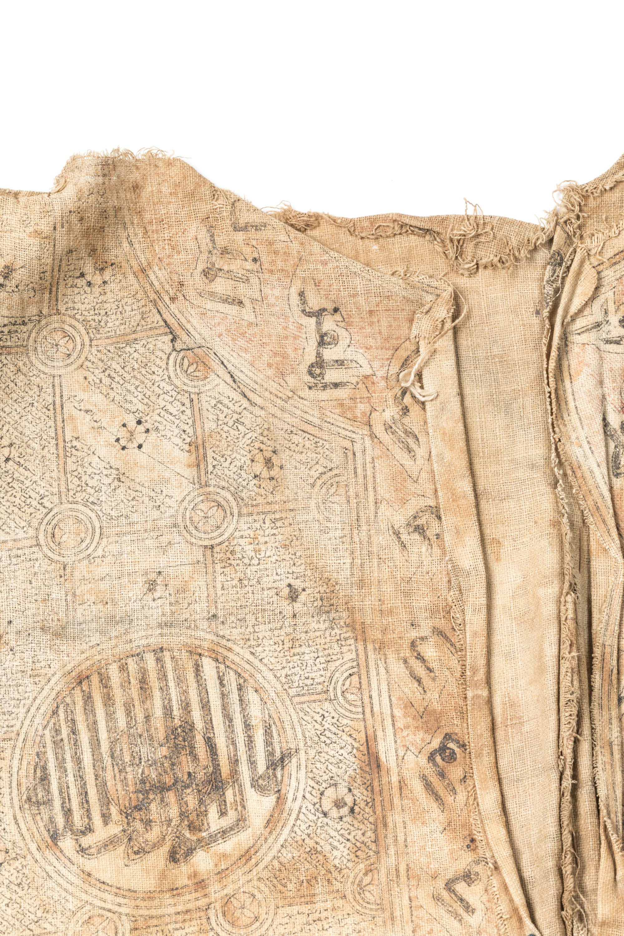 Mughal Indian, 17th century. A rare talismanic shirt comprised of six rectangular cotton pieces sewn together and covered with black, red and beige (formerly gold?) inscriptions: Qur'anic verses, the Shahadah, one verse of the Surah Yusuf (Chapter 12, 64) and the divine names of Allah.