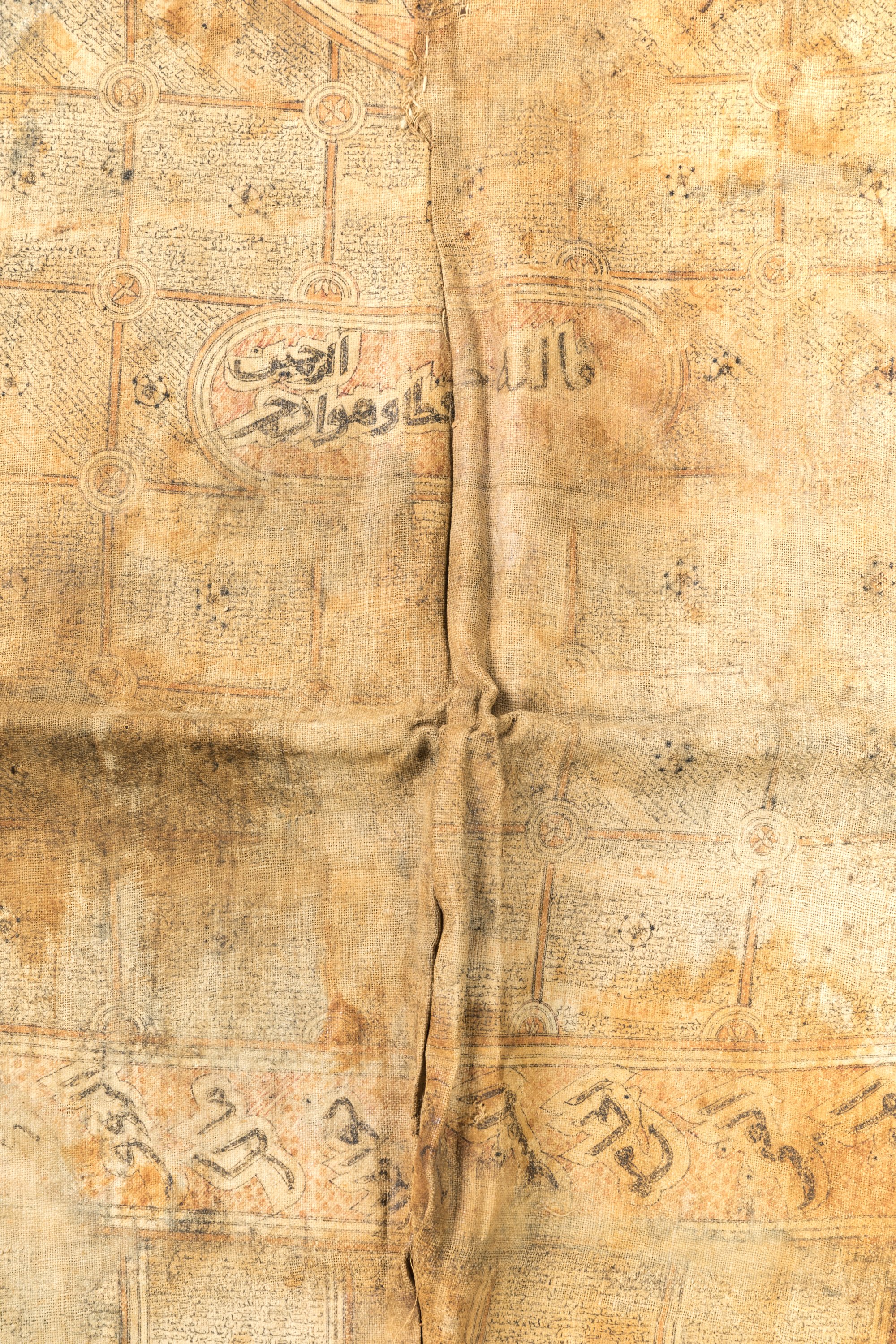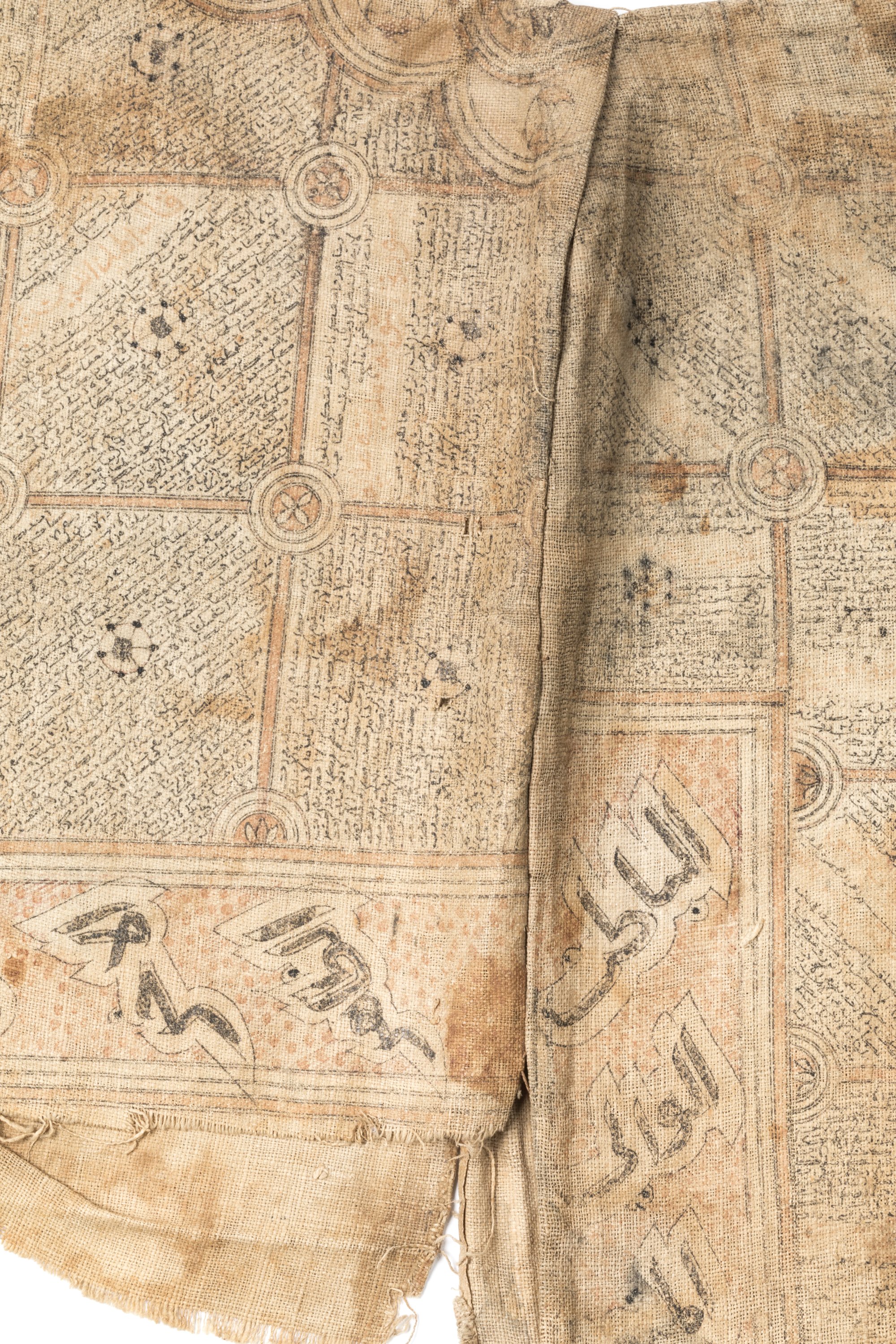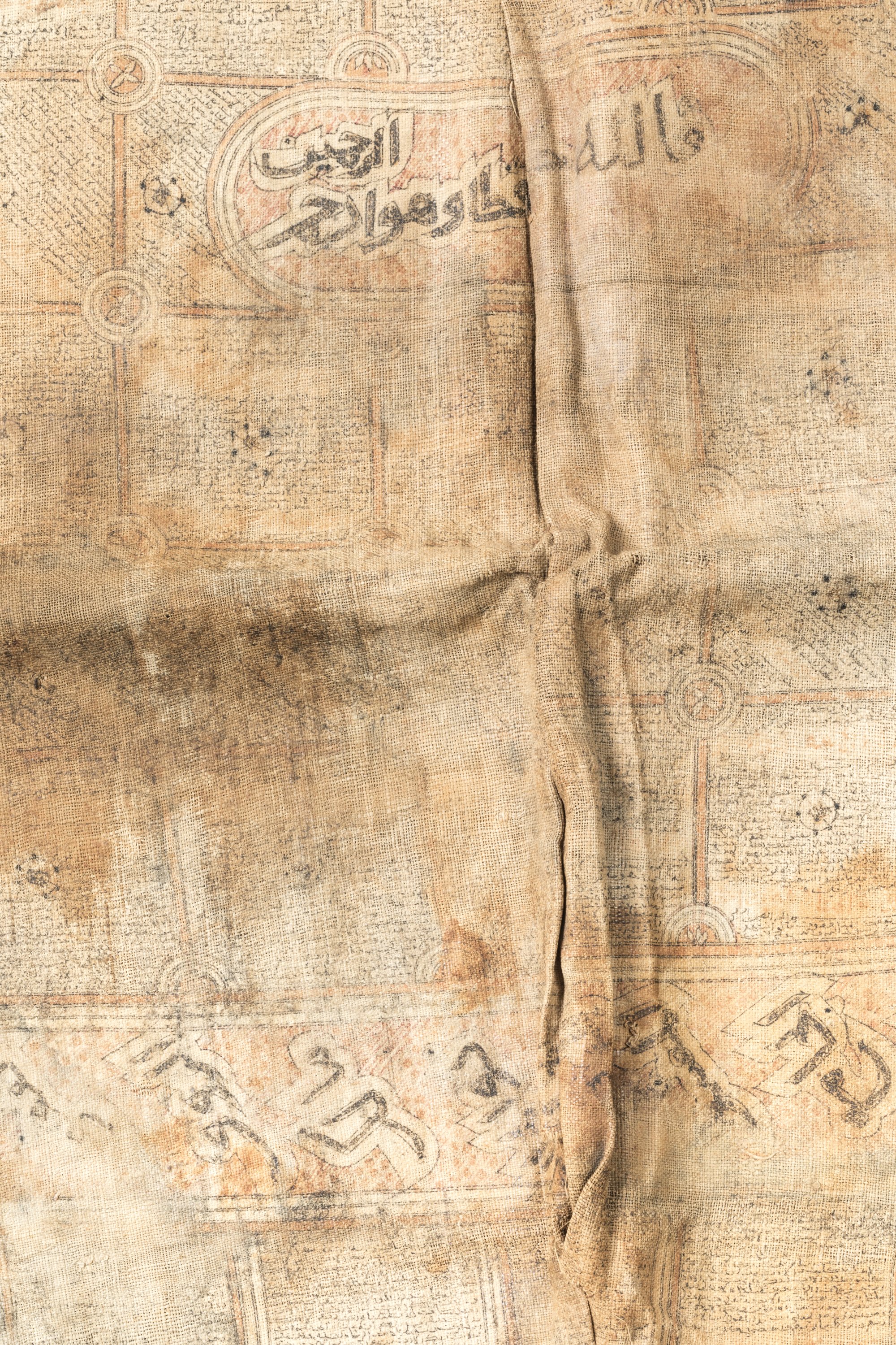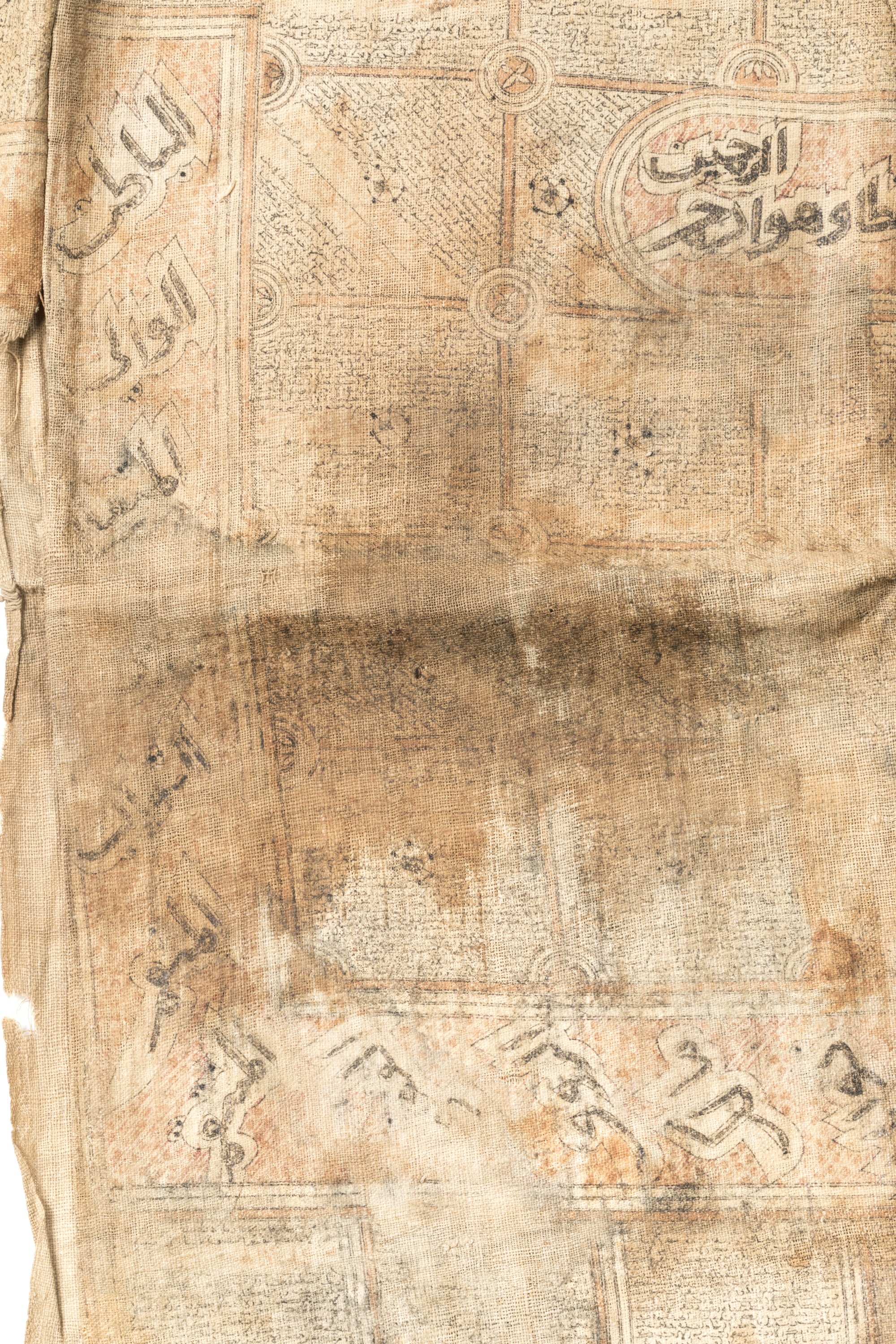 en coton épais composée de six parties rectangulaires cousues ensemble, finement inscrites à l’encre noire, rouge et beige (possiblement une trace de peinture à l’or) de versets coraniques dans des compartiments carrés, de la Shahada dans deux grands rondeaux sur le devant, un verset de la Sourate Yusuf (XII, 64) au revers, et la litanie des Noms Divins de Dieu (al-asma’ al-husna) écrits en bihârî sur la bordure.