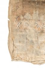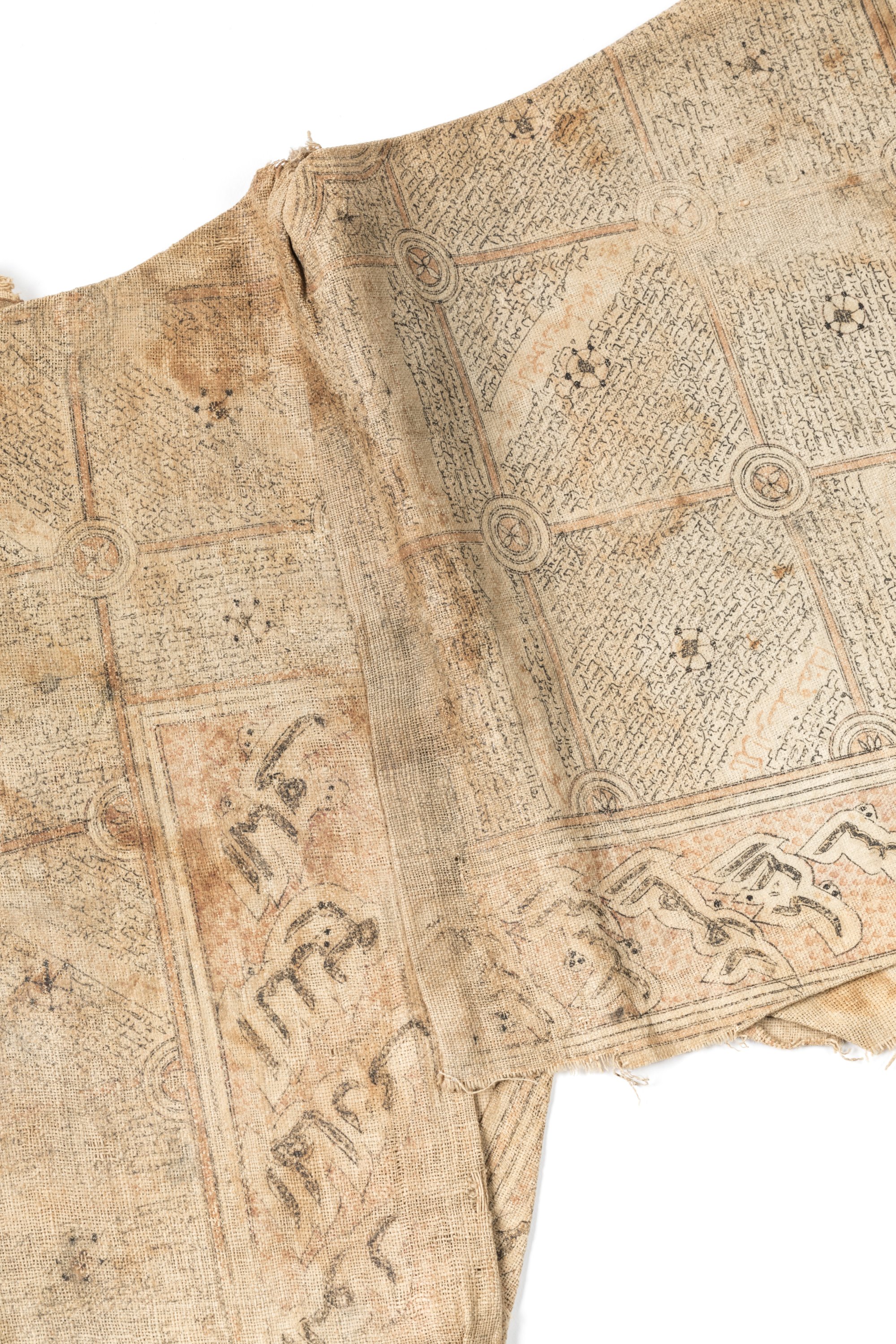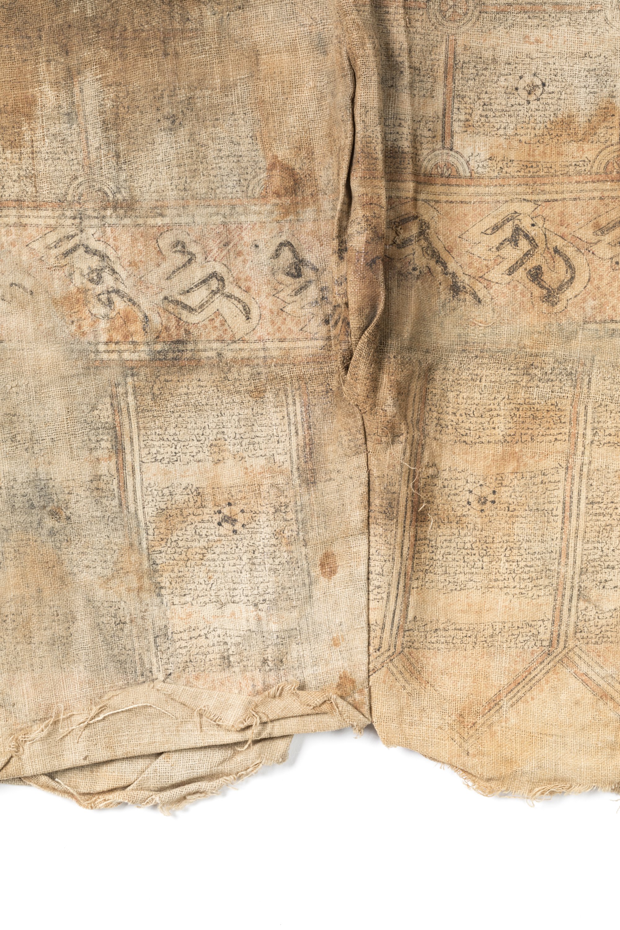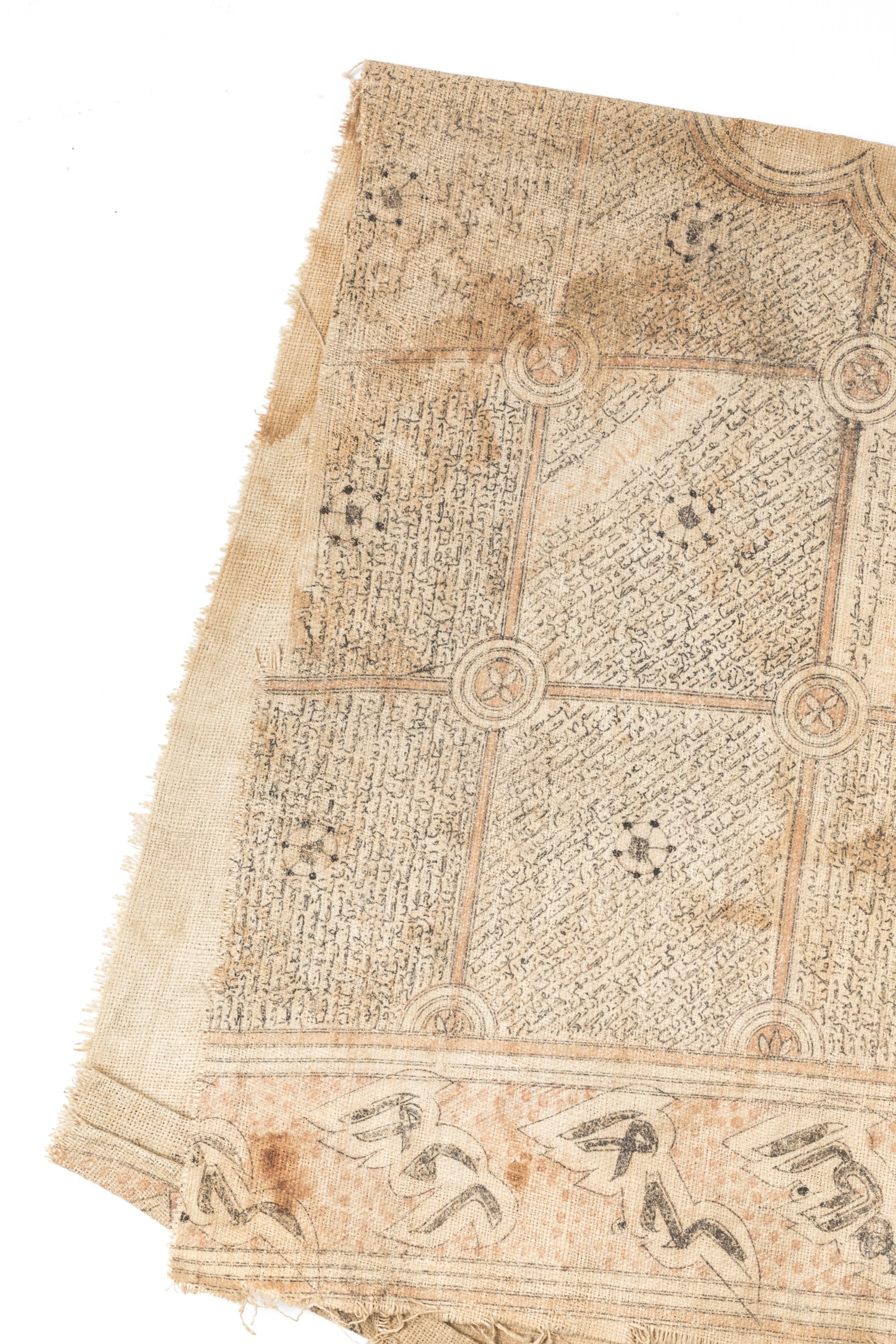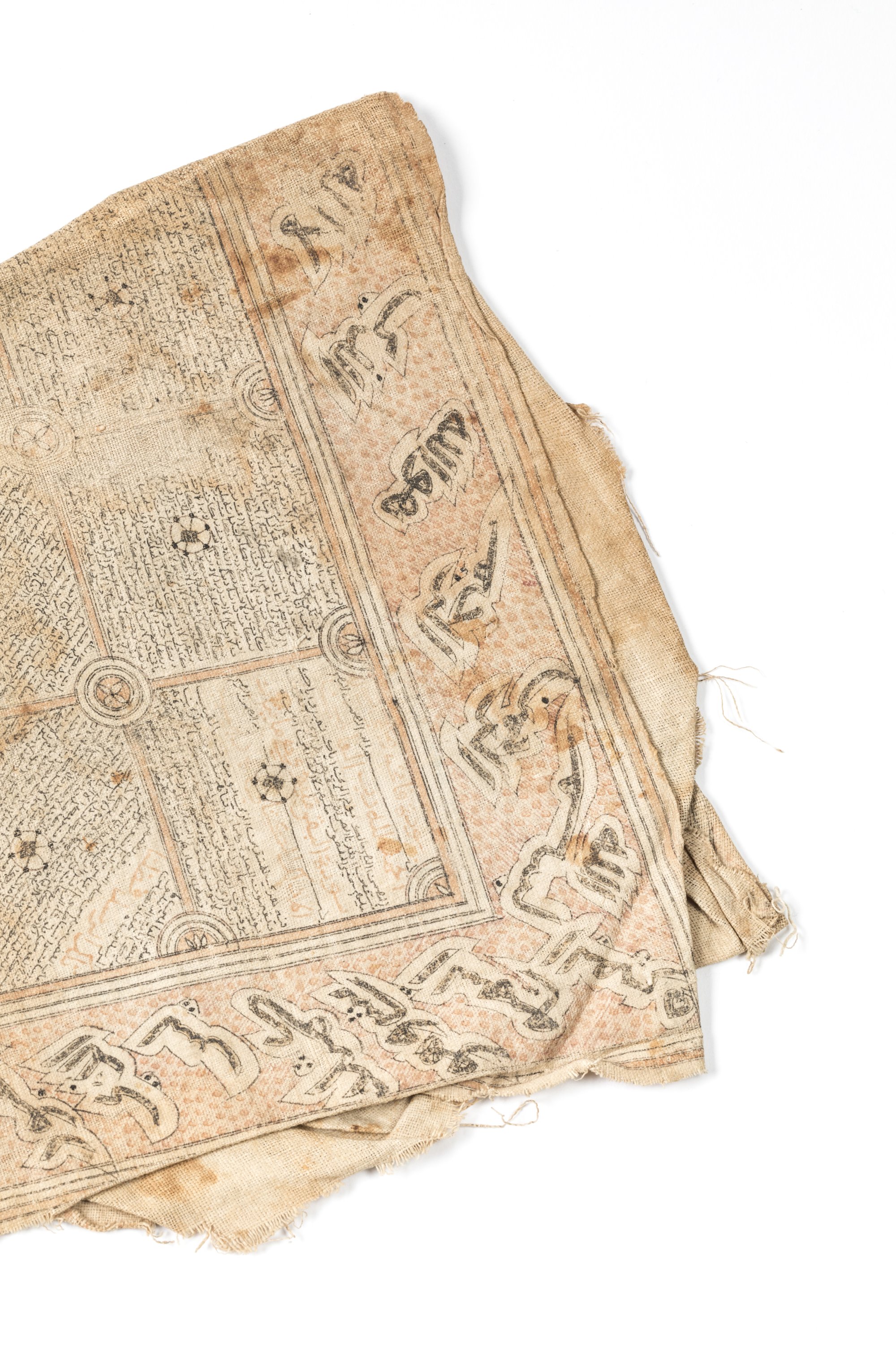 en coton épais composée de six parties rectangulaires cousues ensemble, finement inscrites à l’encre noire, rouge et beige (possiblement une trace de peinture à l’or) de versets coraniques dans des compartiments carrés, de la Shahada dans deux grands rondeaux sur le devant, un verset de la Sourate Yusuf (XII, 64) au revers, et la litanie des Noms Divins de Dieu (al-asma’ al-husna) écrits en bihârî sur la bordure.