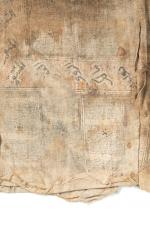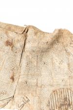 (usures, décor partiellement effacé, petites déchirures, coutures, manques - notamment une bande manquante sur la manche gauche - et taches).