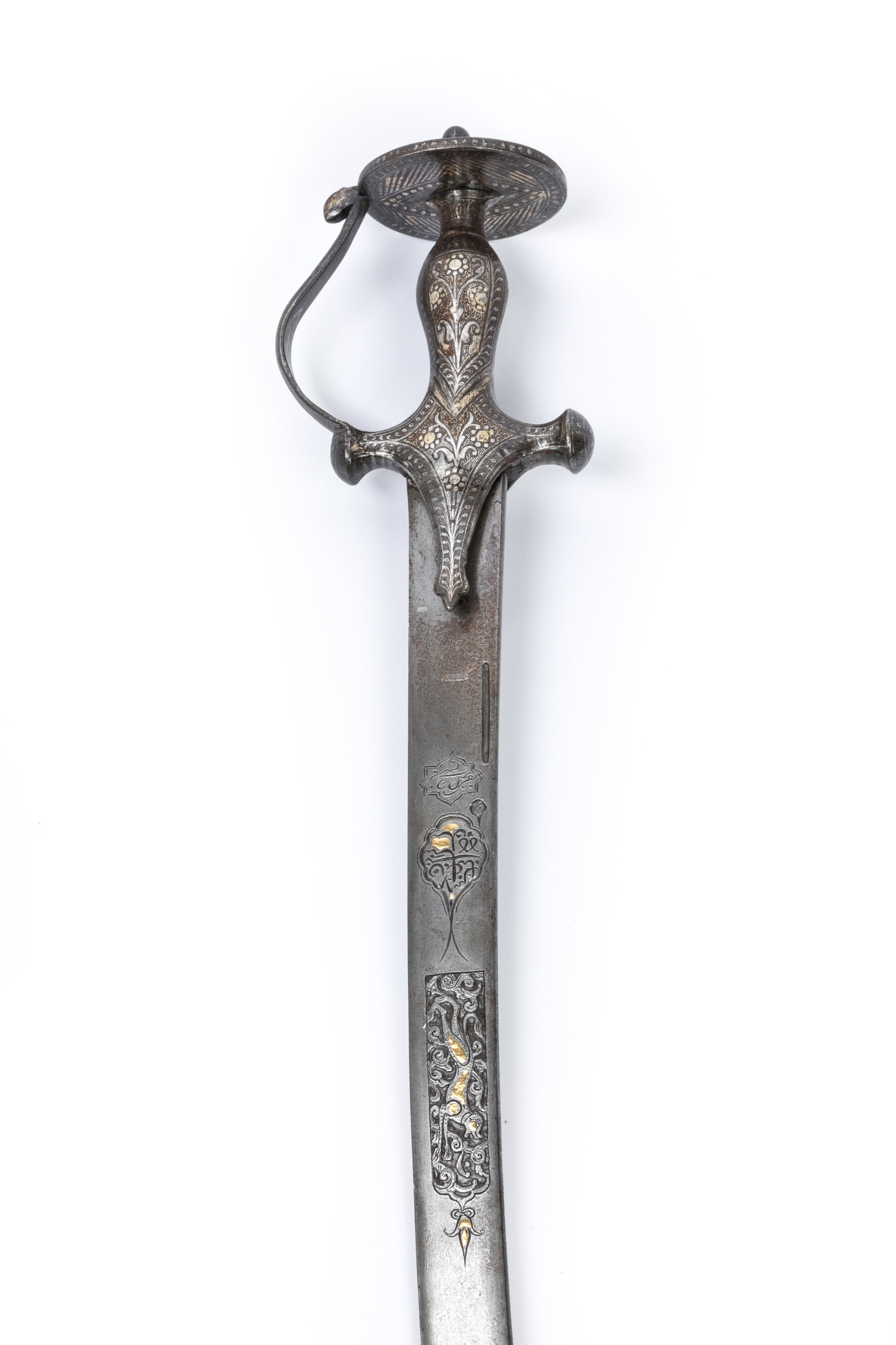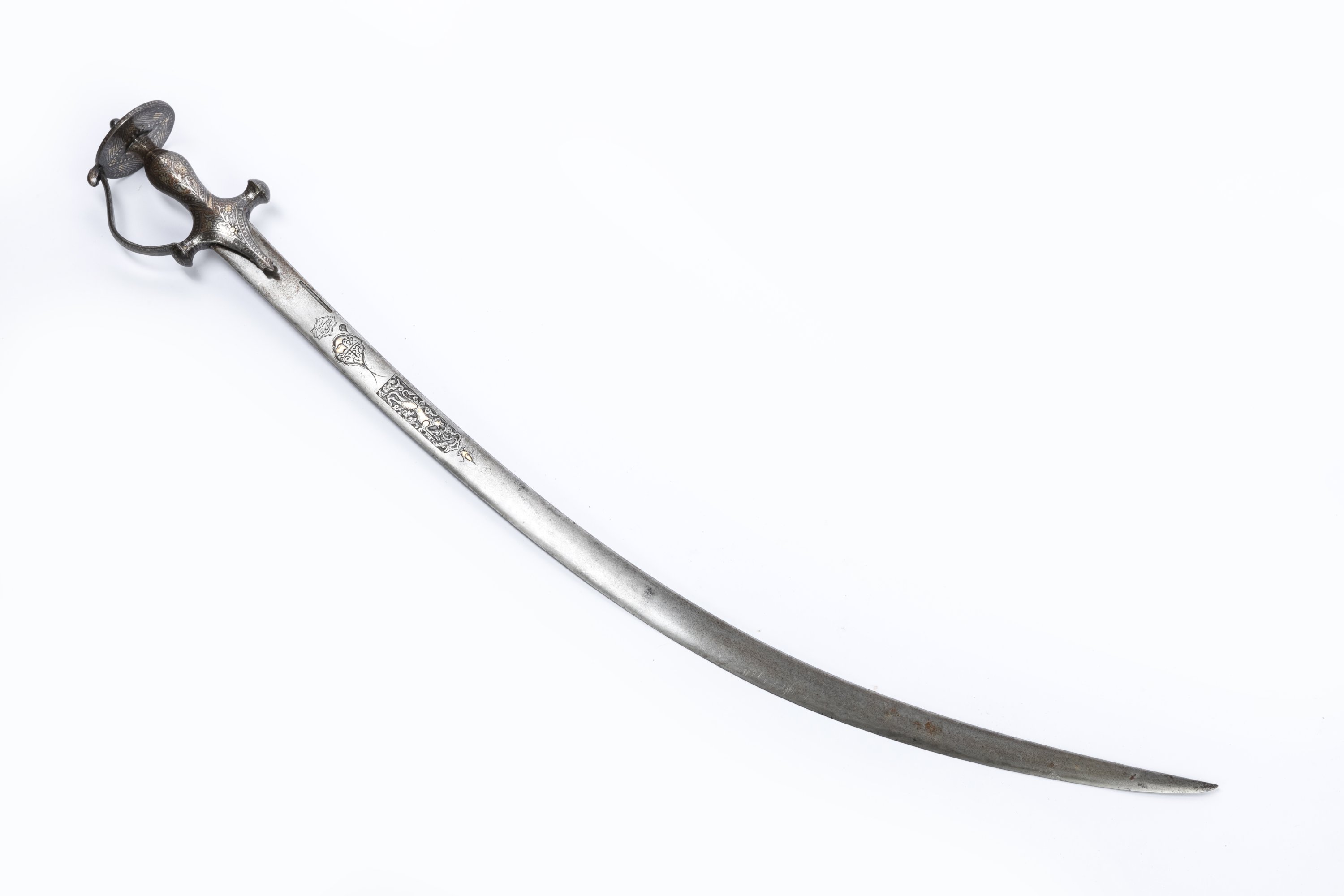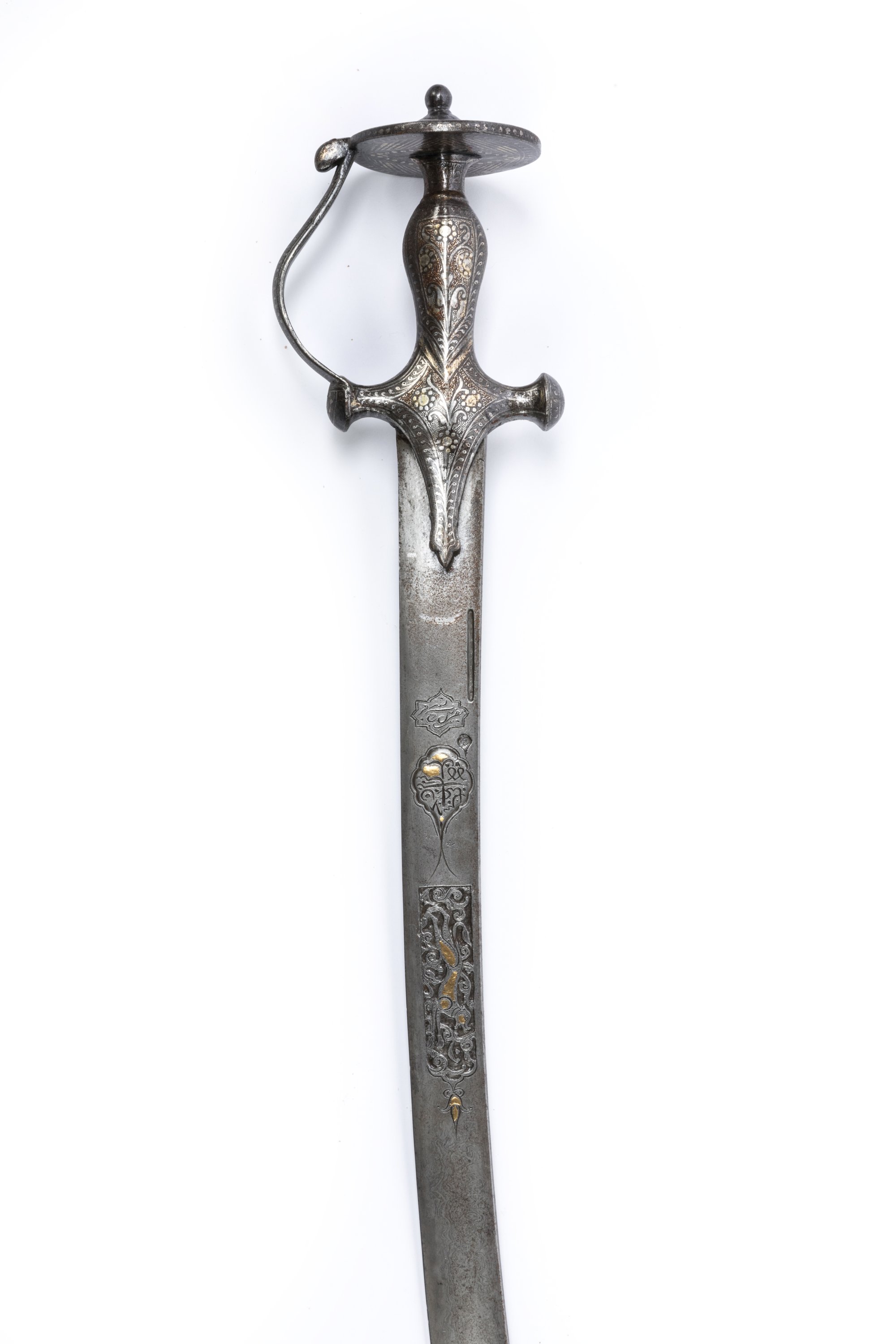 à lame damassée d'origine iranienne. Monture à décor floral damasquiné: fusée à balustre, grand pommeau discoïdal, coquille et garde à croisière. La lame est finement gravée sur les deux faces: d'un côté un tigre dans un cartouche rehaussé d'or, de l'autre un félin rehaussé d'or passant dans un cartouche et deux inscriptions: "Bande-ye Châh-e Velâyat Abbâs", l'autre en partie illisible. Deux poinçons d'arsenal.