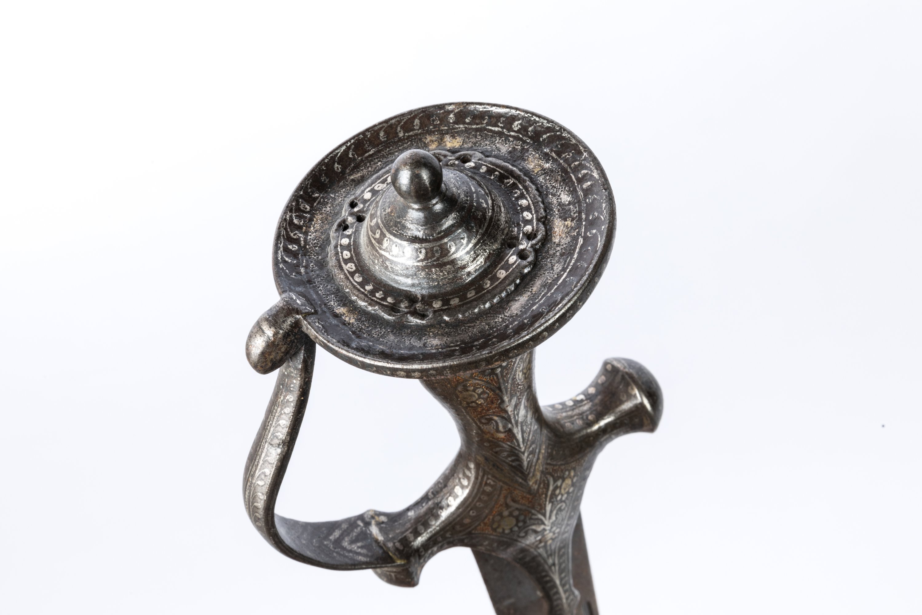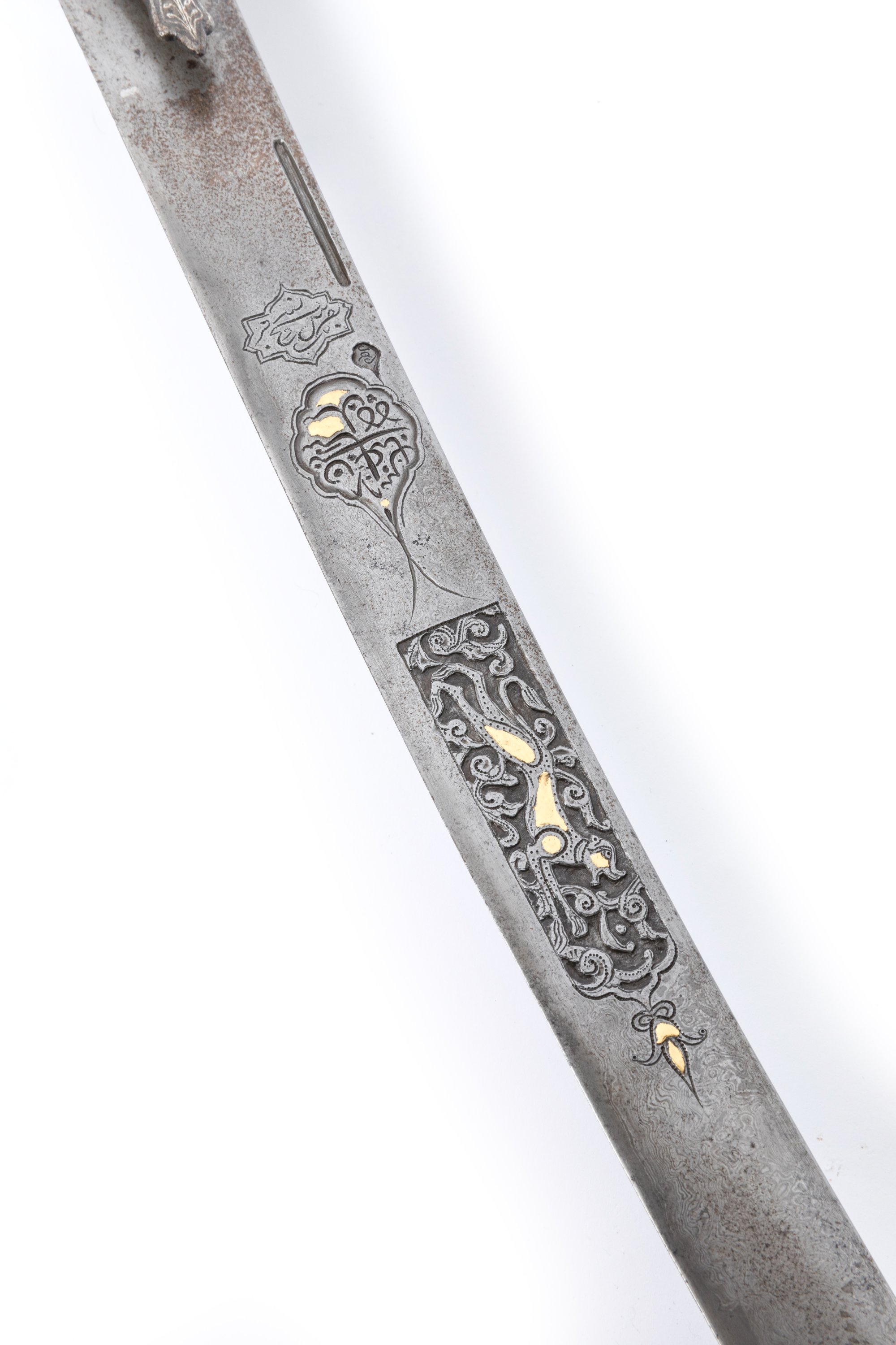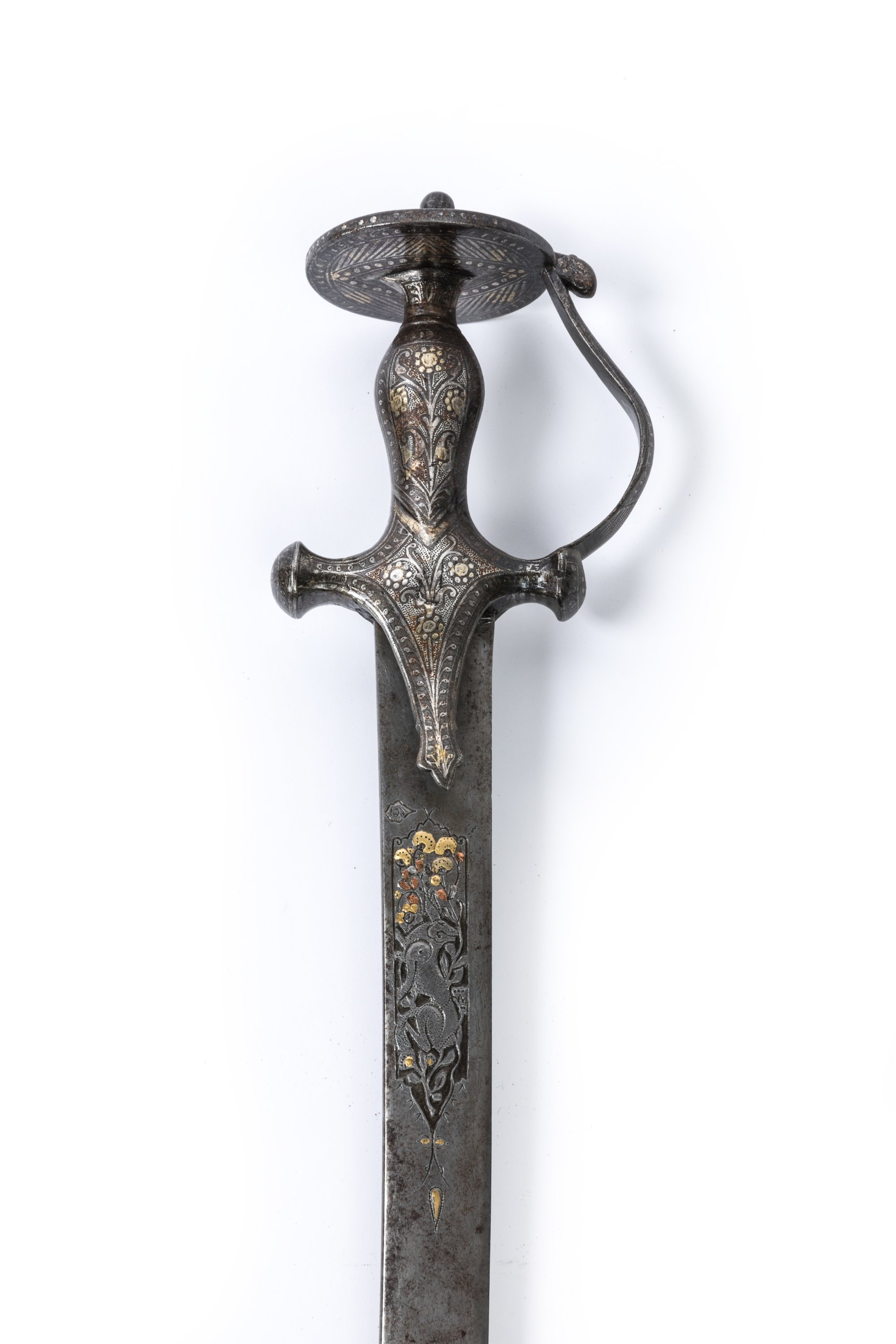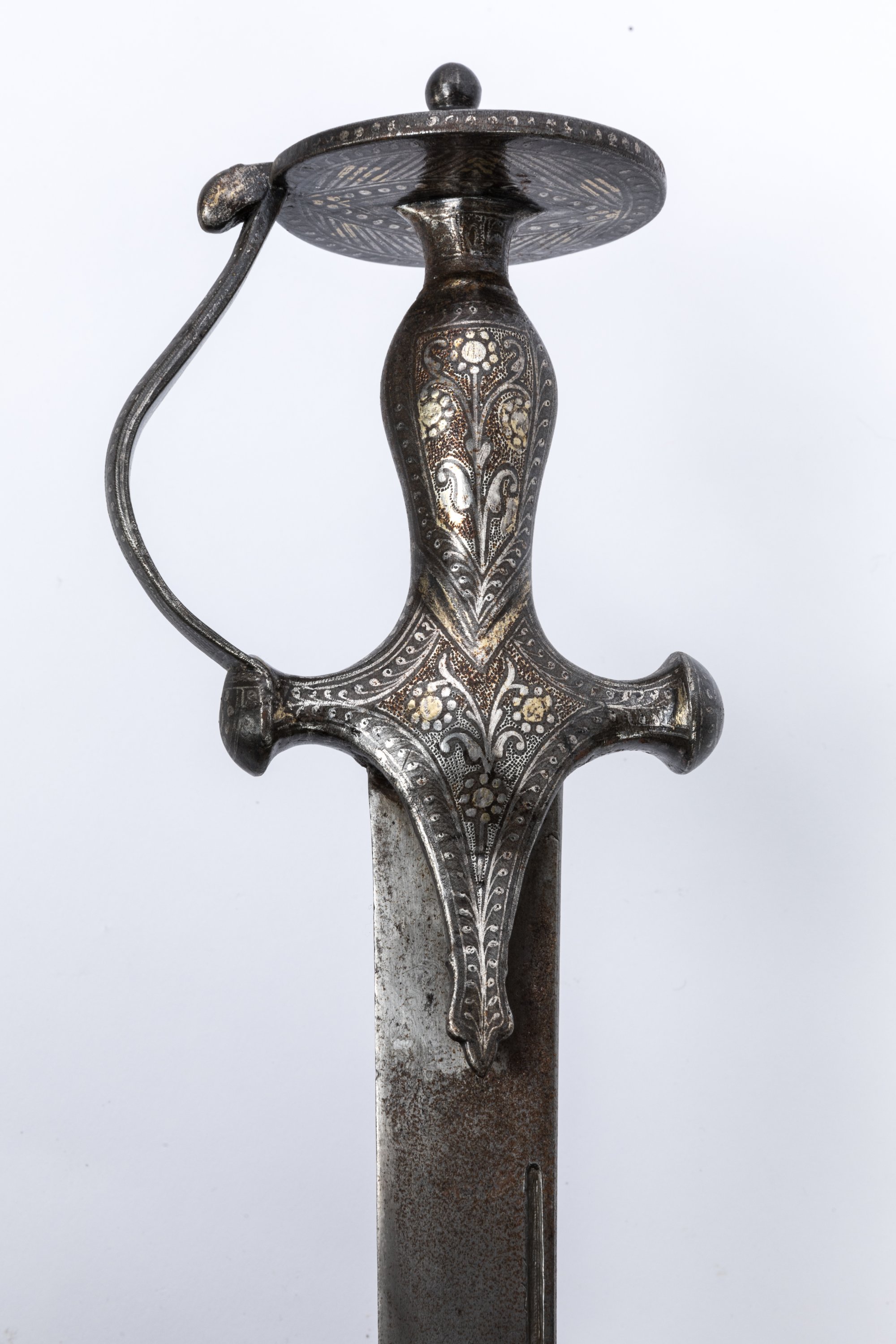 à lame damassée d'origine iranienne. Monture à décor floral damasquiné: fusée à balustre, grand pommeau discoïdal, coquille et garde à croisière. La lame est finement gravée sur les deux faces: d'un côté un tigre dans un cartouche rehaussé d'or, de l'autre un félin rehaussé d'or passant dans un cartouche et deux inscriptions: "Bande-ye Châh-e Velâyat Abbâs", l'autre en partie illisible. Deux poinçons d'arsenal.
