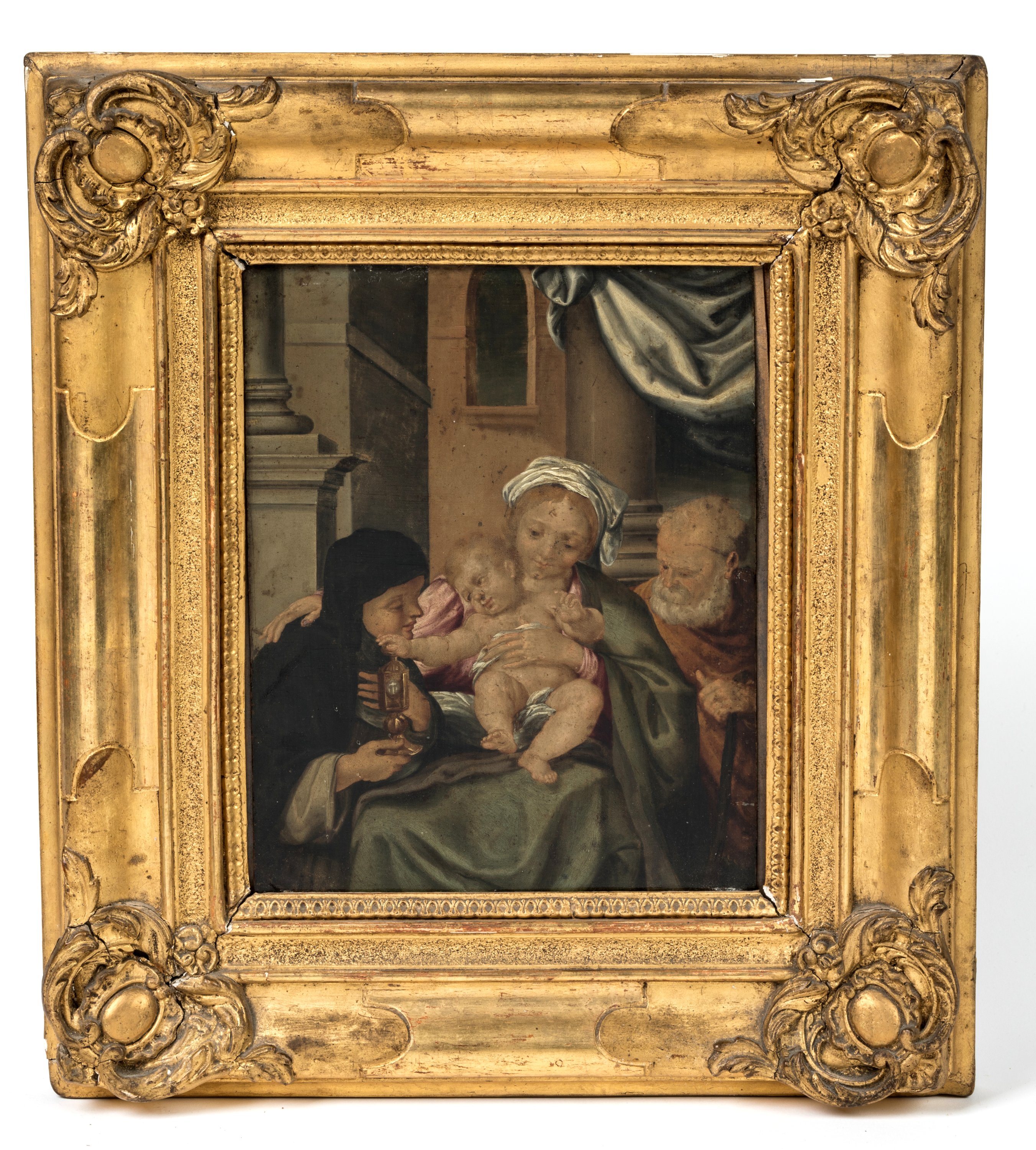 A painting by Annibal Carrache depicting the Holy Family and Saint Clare of Assissi. Copper plate. After an engraving by Francesco Cavazzoni.