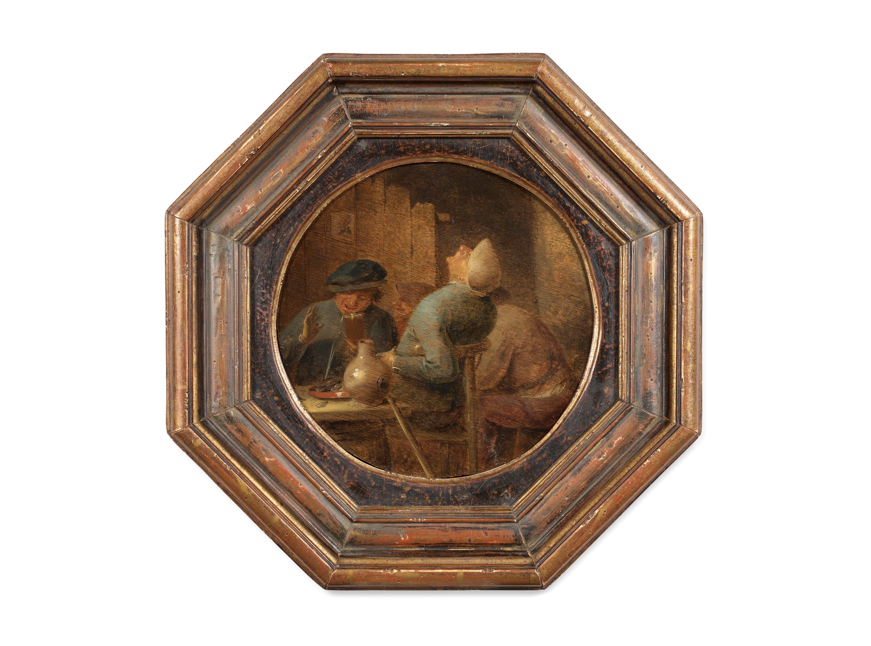 Flemish School, ca. 1630. A painting by the entourage of Adriaen Brouwer depicting the inside of a tavern. Circular oakwood panel in an octogonal frame.