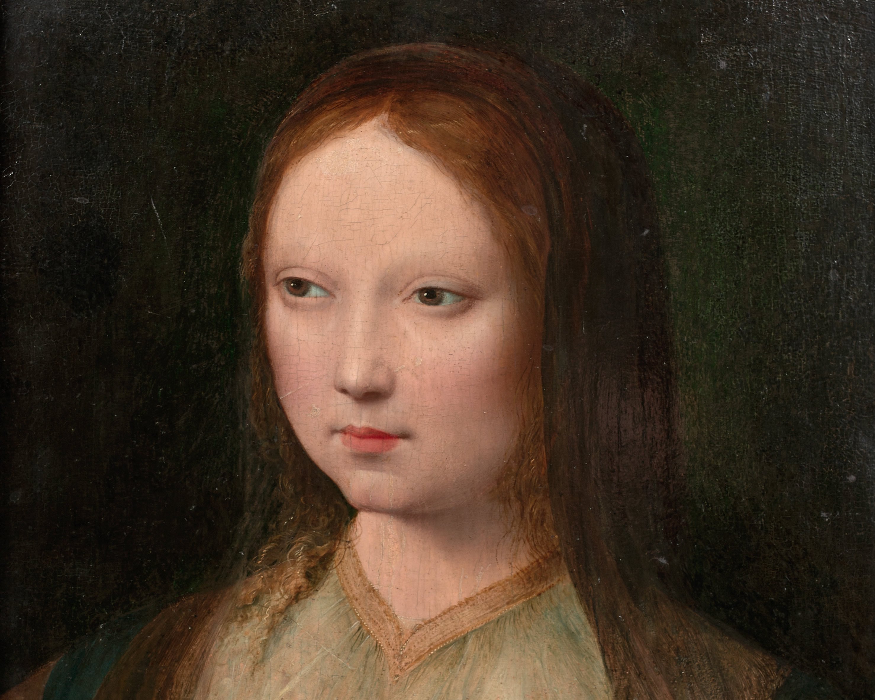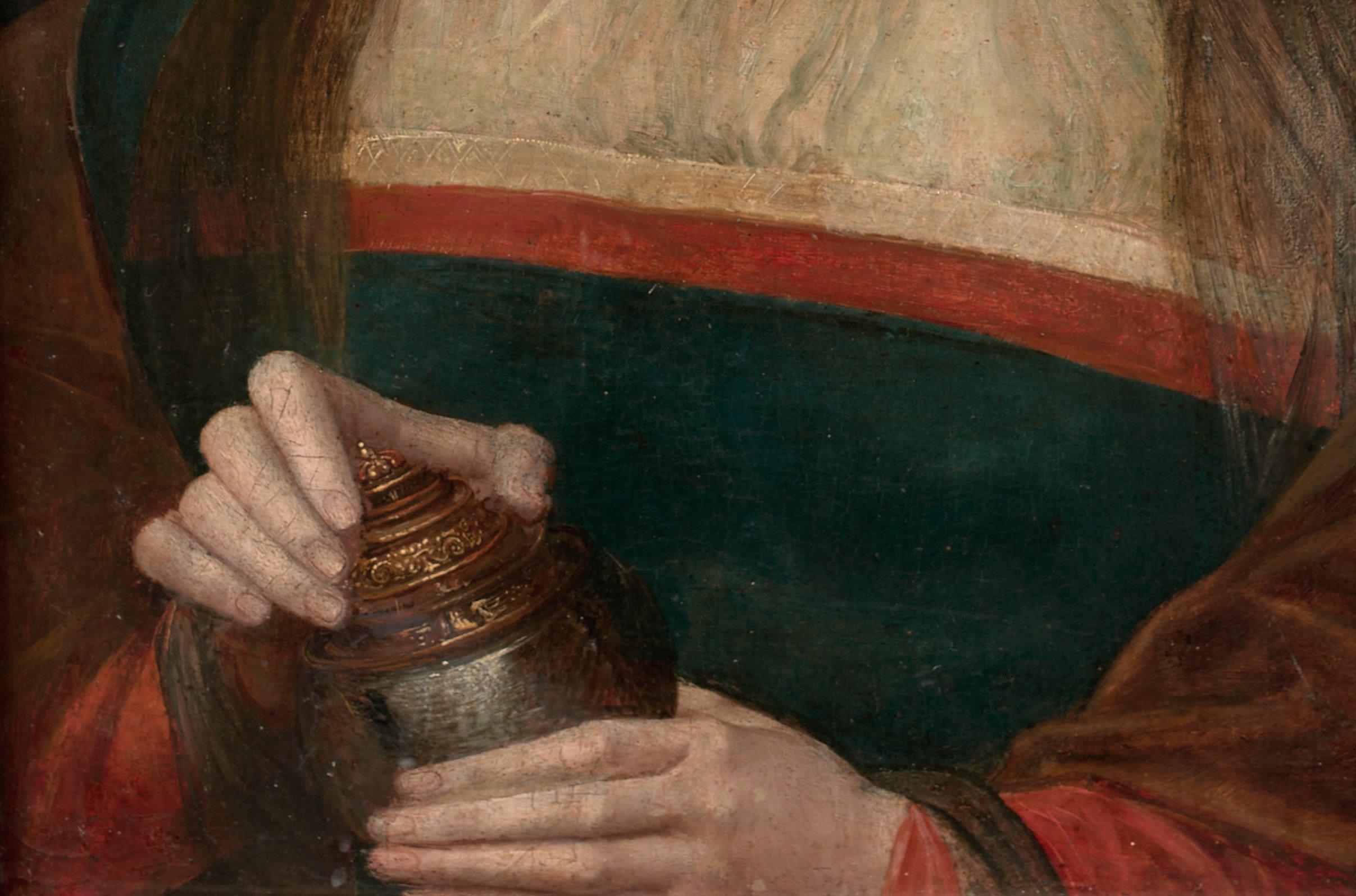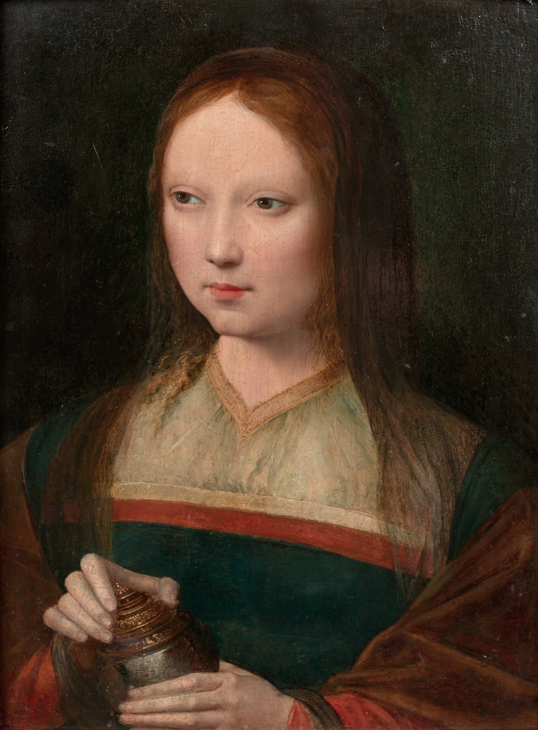 Notre tableau était attribué jusqu'à ce jour au Maître des demi-figures, un peintre "maniériste anversois" au style aisément identifiable, à qui l'on doit de nombreuses représentations de Marie-Madeleine à mi-corps (Expertise par G. Delestre et P. de Bayser en date du 29 octobre 1949). Cependant, le style pictural tout en courbes et ondulations, souvent un peu « sec », du maître des demi-figures, ne correspond pas à la force, à la géométrisation par masses ni à la douceur que l'on observe ici. On perçoit l'influence de Gérard David et de Jan Provost dans le rendu des détails, ce qui situe notre tableau à Bruges et non à Anvers, alors que l'ampleur spatiale est influencée par les portraits de la Haute-Renaissance du début du XVIe siècle (Léonard de Vinci, Raphaël).