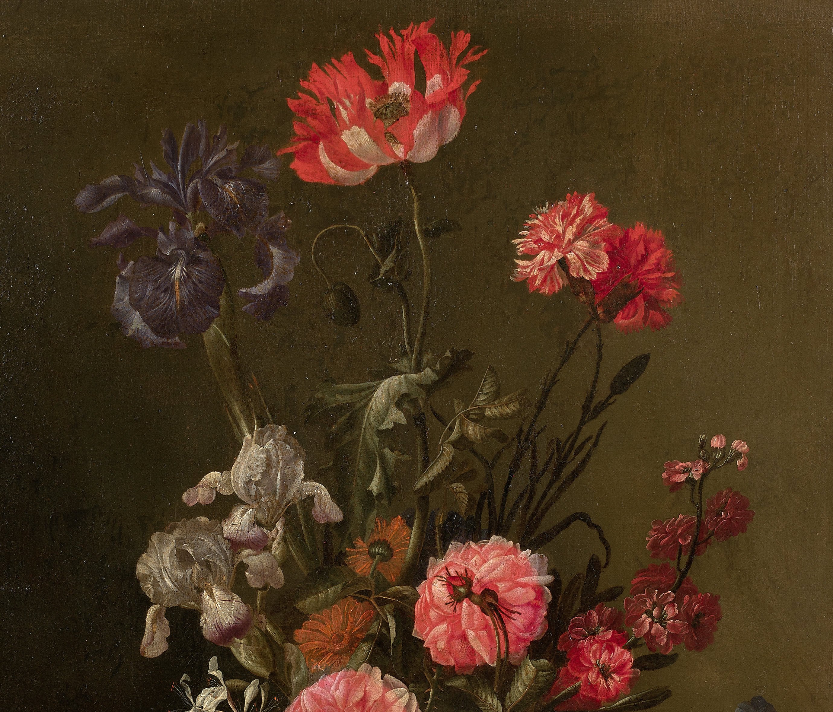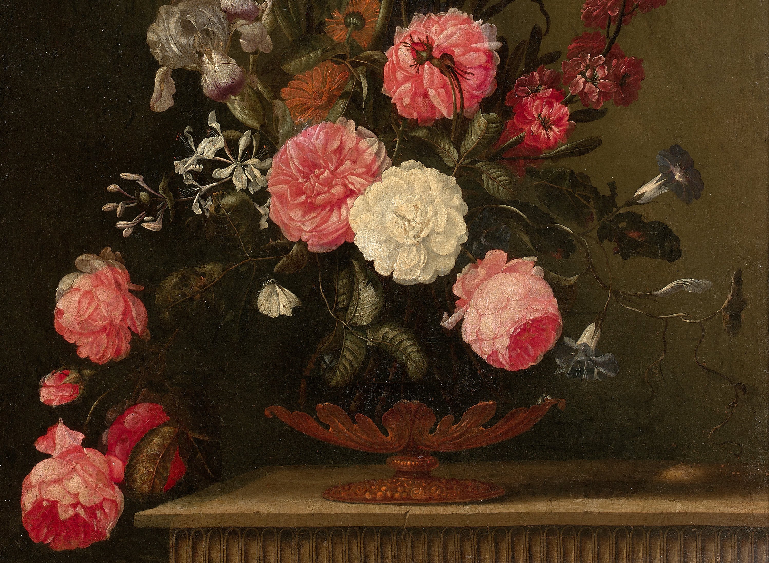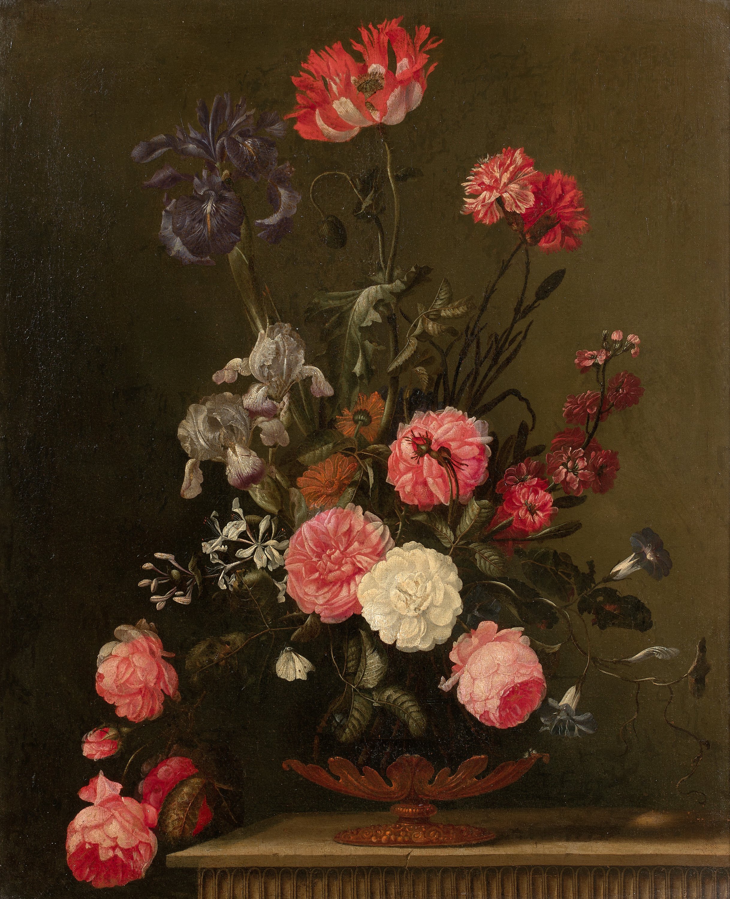 A painting by Jacques Samuel Bernard depicting flowers in a bronze vase. In a Louis XVI giltwood frame.