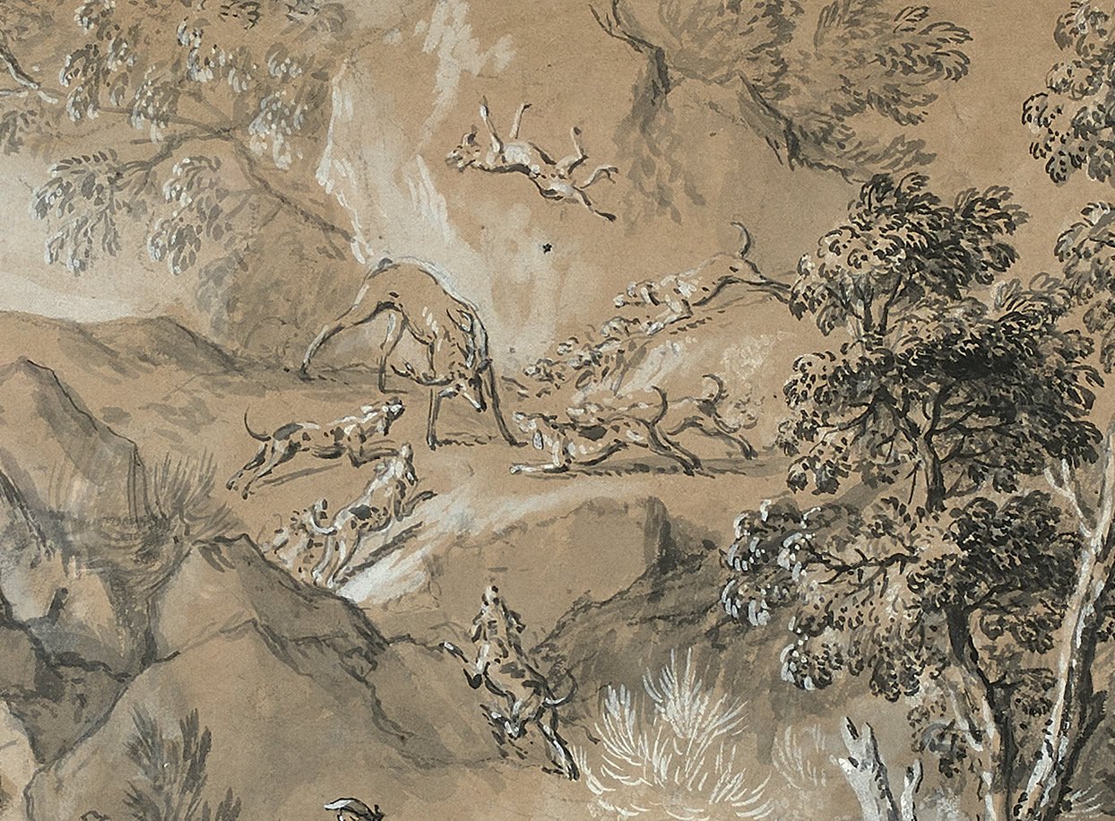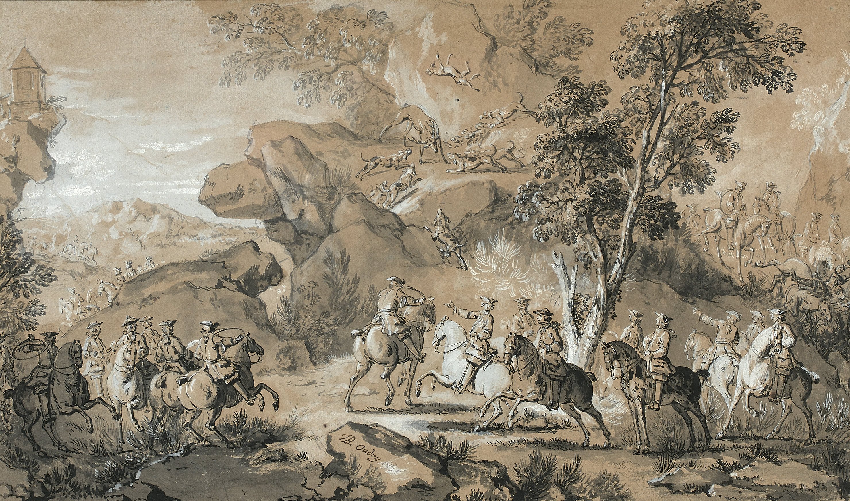 A 1733 drawing by Jean-Baptiste Oudry depicting a deer hunt in the Fontainebleau Forest. Ordered by Louis XV and presented to the King by the artist.