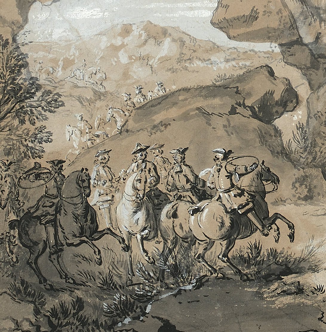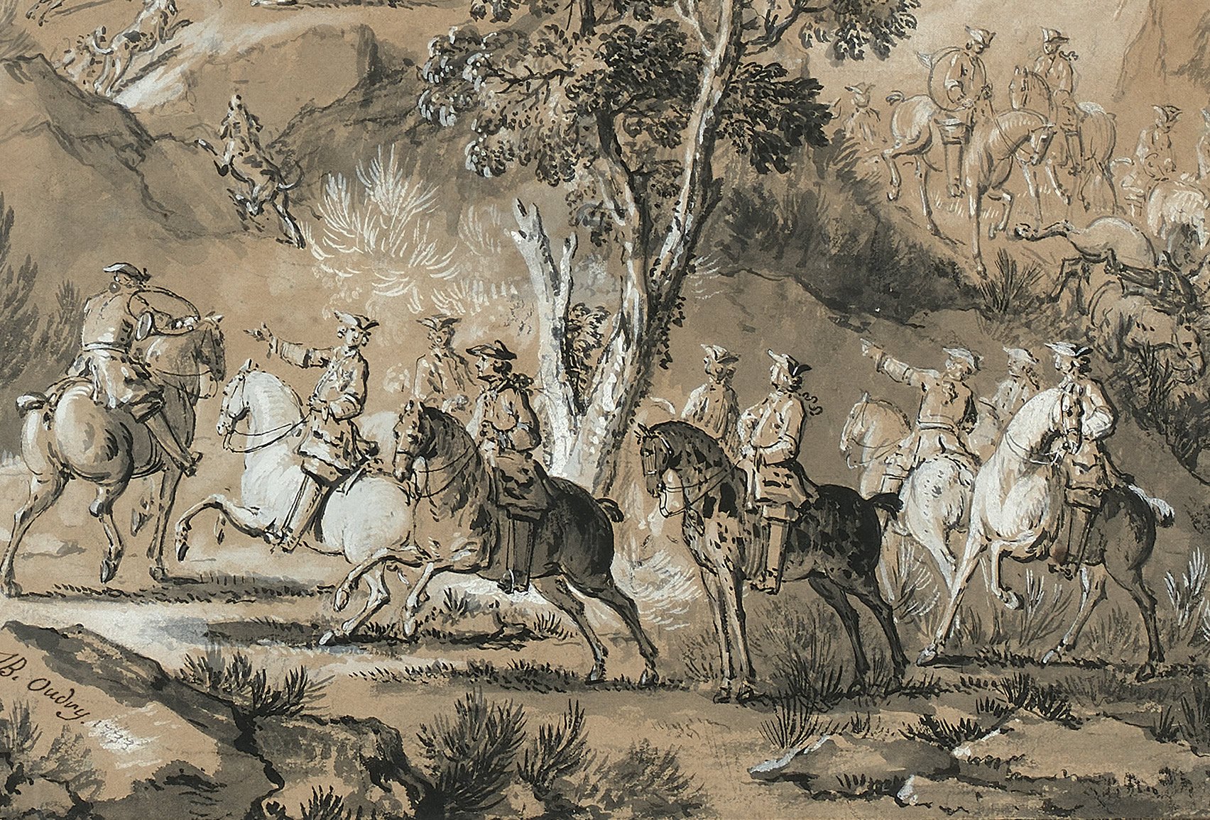 Ces dessins préparent les tentures des Chasses Royales de Louis XV: ensemble de neuf tapisseries conçues par Jean-Baptiste Oudry dans les années 1733-1738. Les tapisseries, tissées aux Gobelins, devaient orner la chambre du roi, son antichambre et le cabinet du conseil au château de Compiègne. Notre dessin fait partie du même groupe que "Louis XV chassant le Loup" conservé au Musée du Louvre (1728, 38 x 52 cm, Inv. 31493) et que "Louis XV tenant en laisse un limier" (1728, 33 x55 cm, vente Couturiers Nicolaÿ, expert de Bayser, Paris 17 mars 1989).
