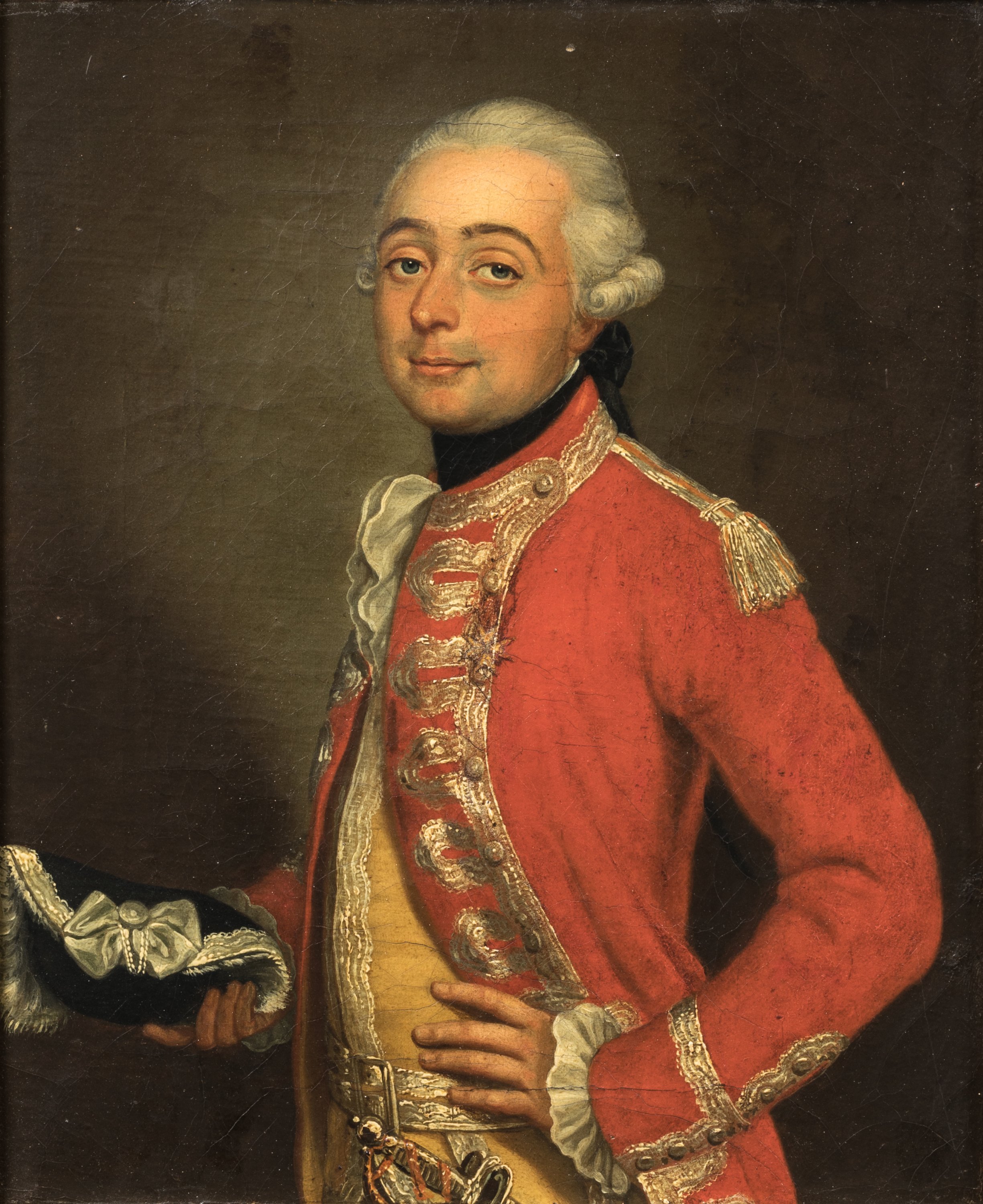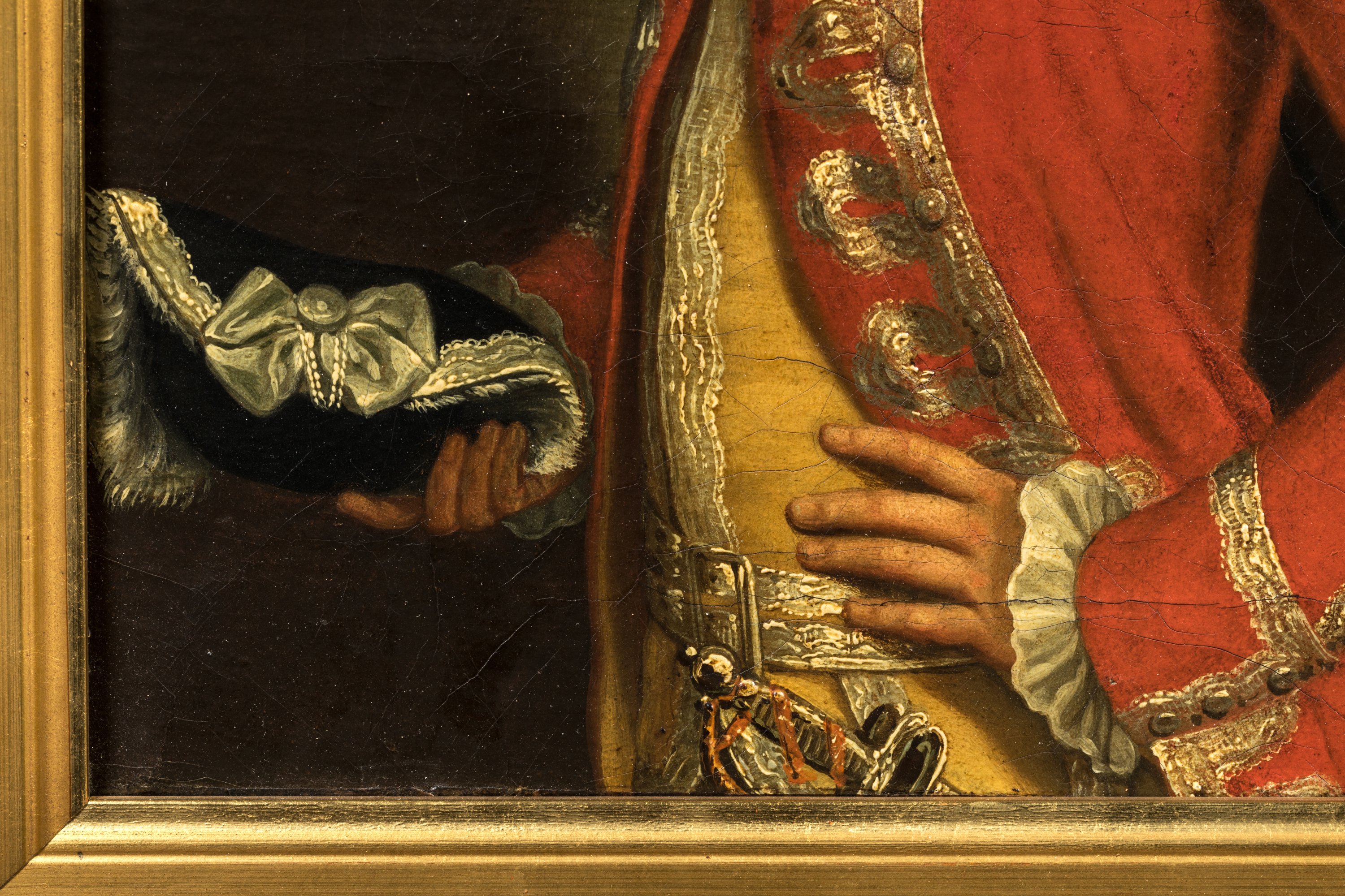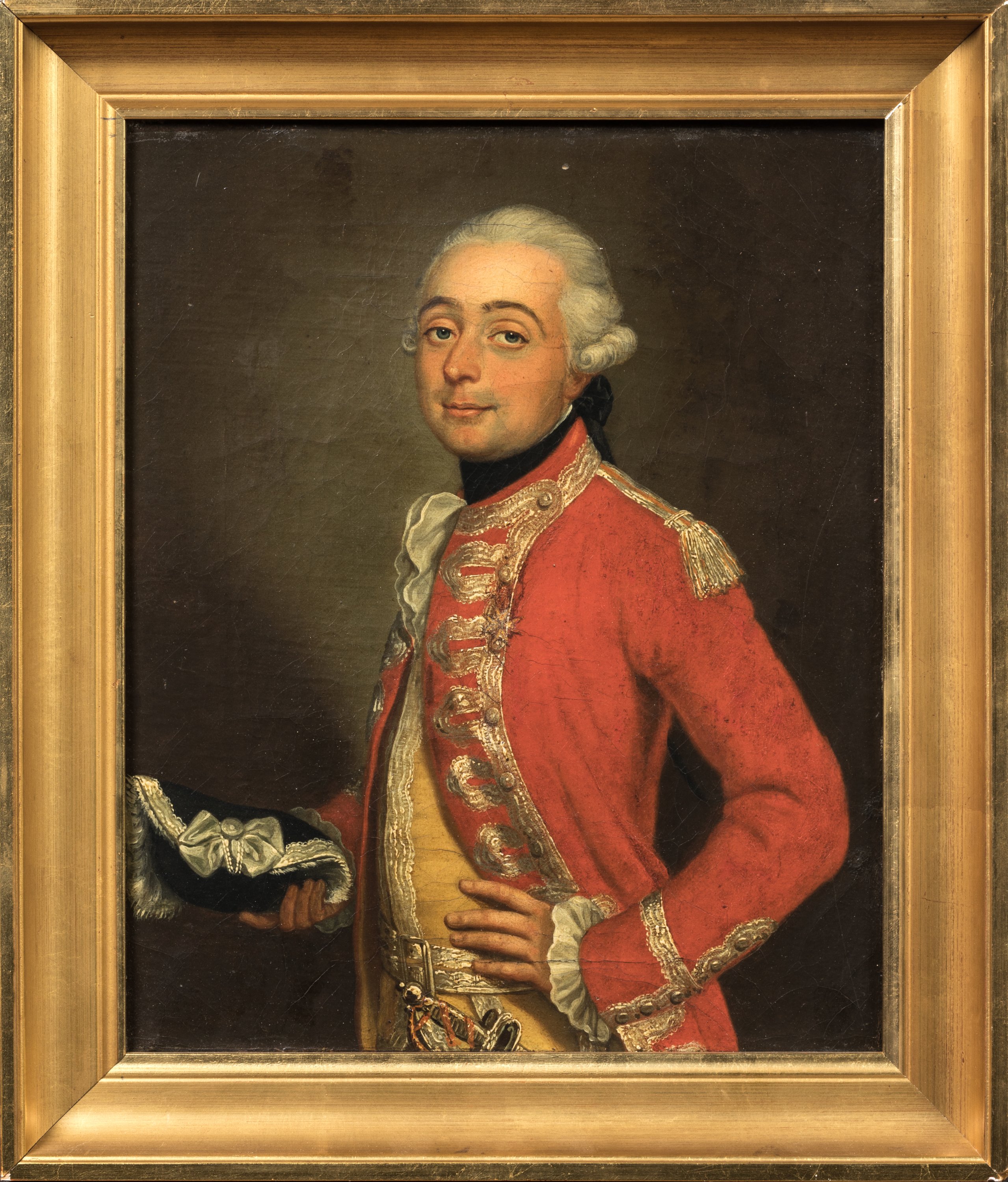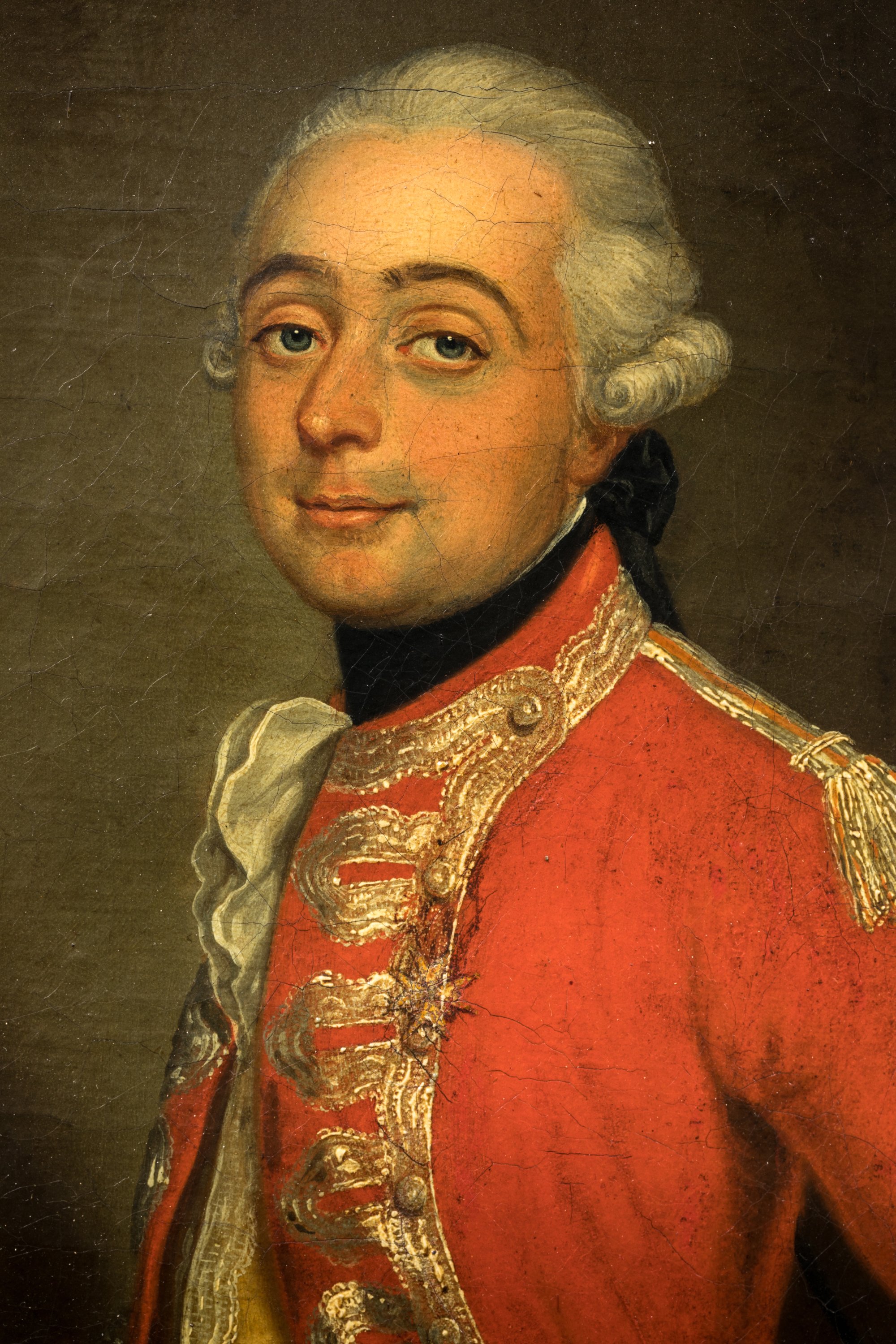 Jean-Baptiste Brossard de Lintrie pose dans son bel uniforme d’apparat écarlate d’officier du corps d’élite des gendarmes de France, appelé les « gendarmes rouges », orné de la croix de chevalier de l’ordre de Saint Louis. Au lendemain du rattachement en 1766 du royaume de Lorraine à celui de la France, Louis XV ordonne l’envoi, en garnison à Lunéville, de ce corps de cavalerie prestigieux, composé de 10 compagnies dont celle d’Orléans.