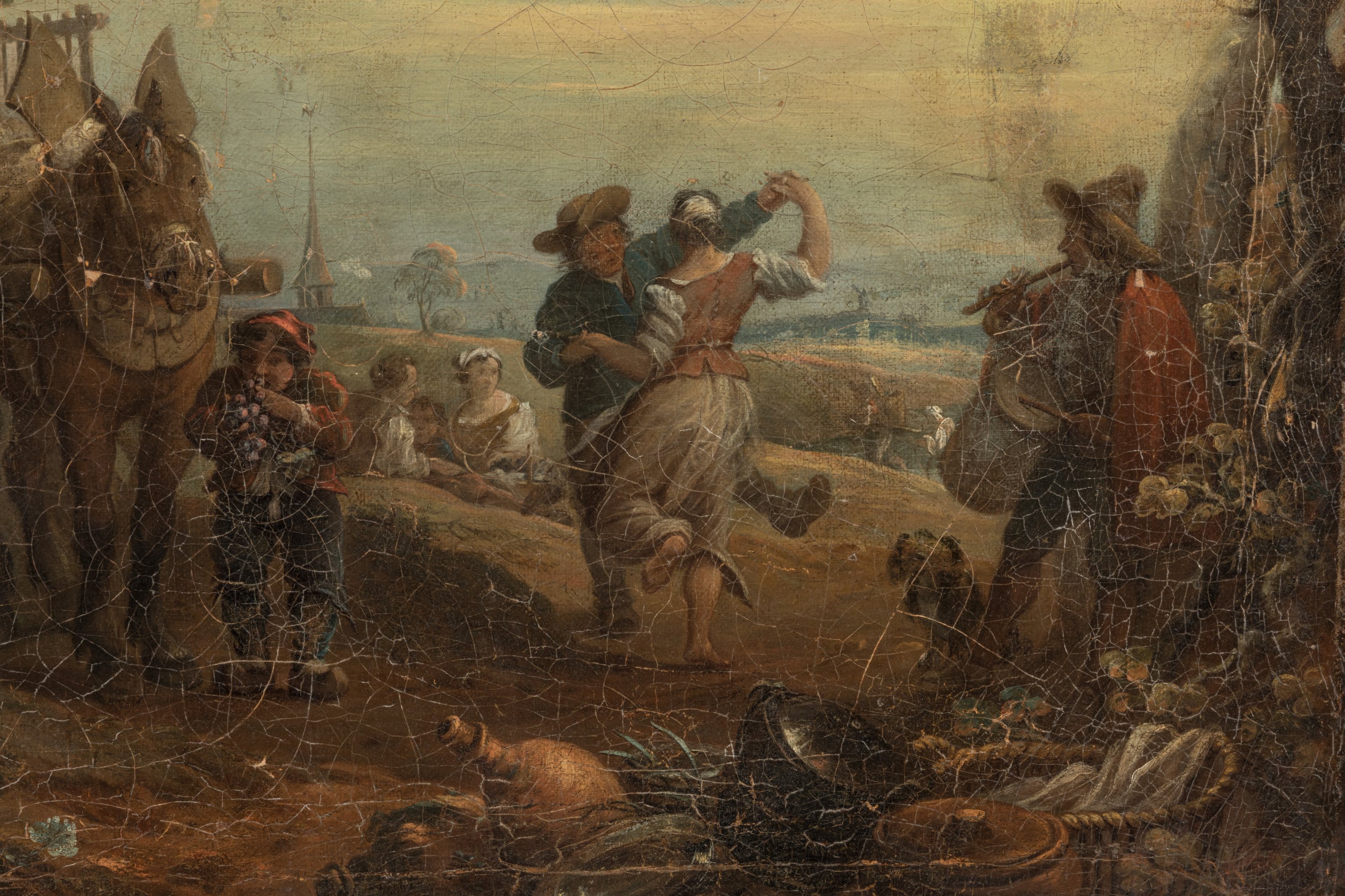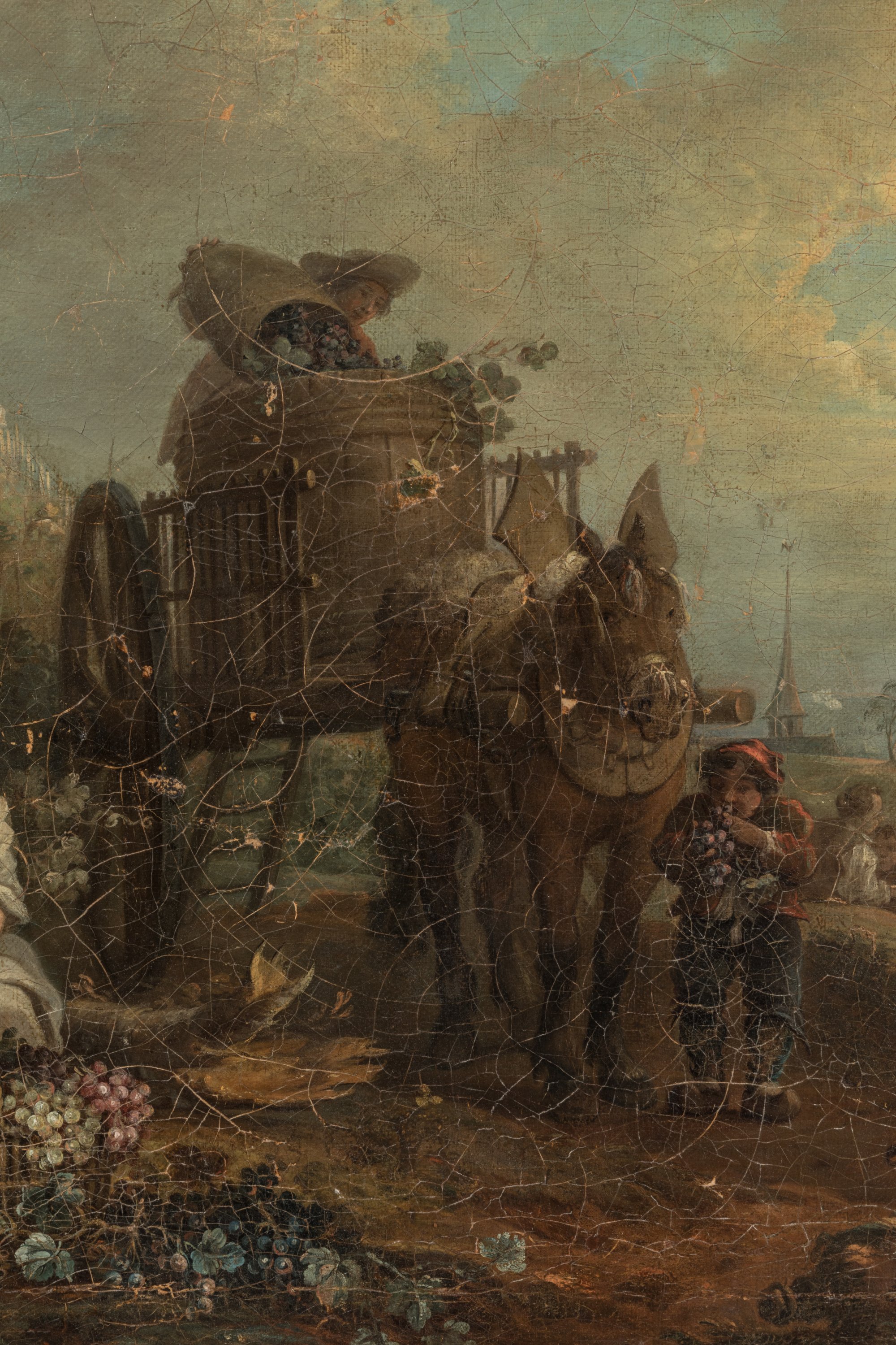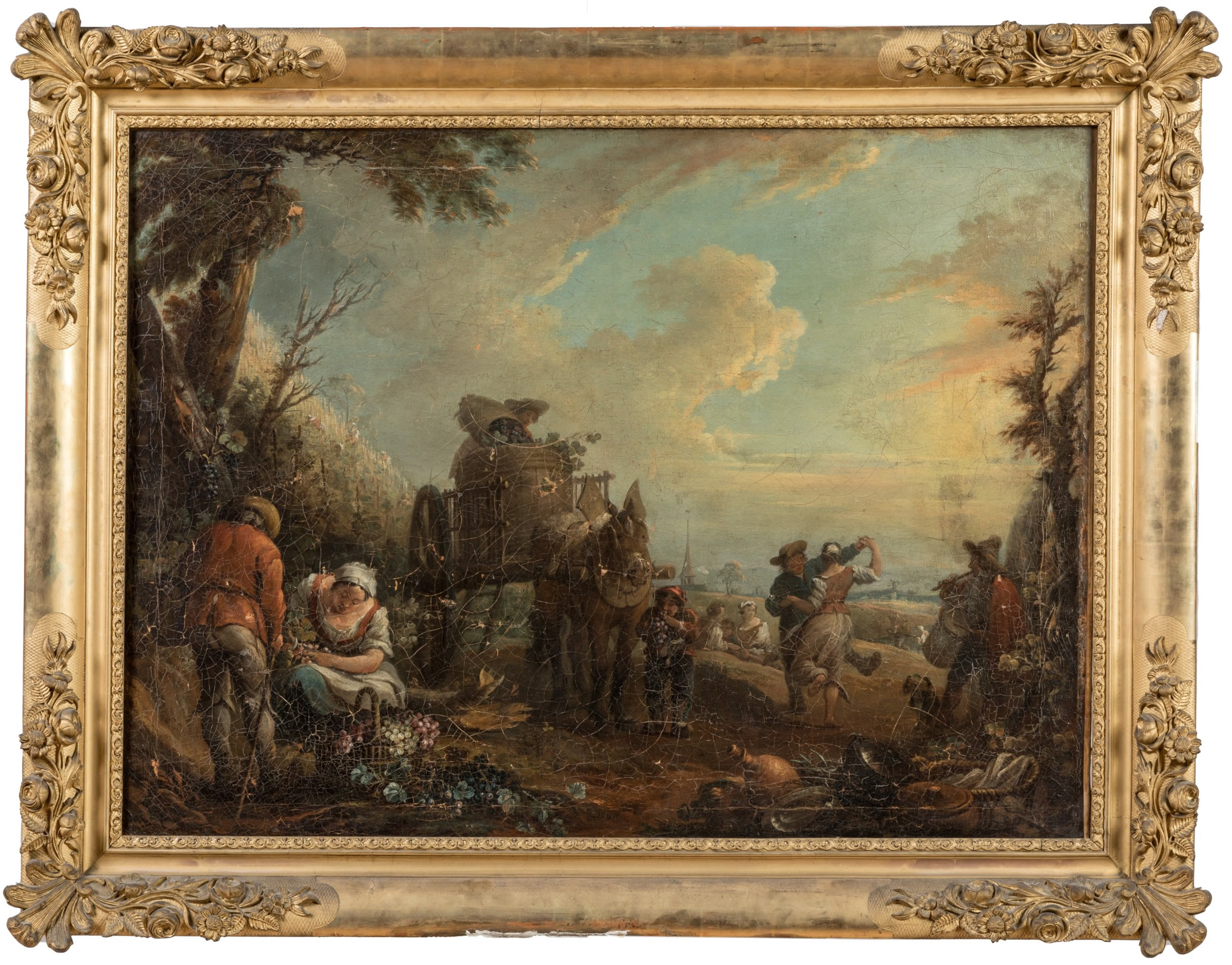 A painting attributed to Jan Antoon Garemyn depicting the grape harvest. Canvas on canvas.