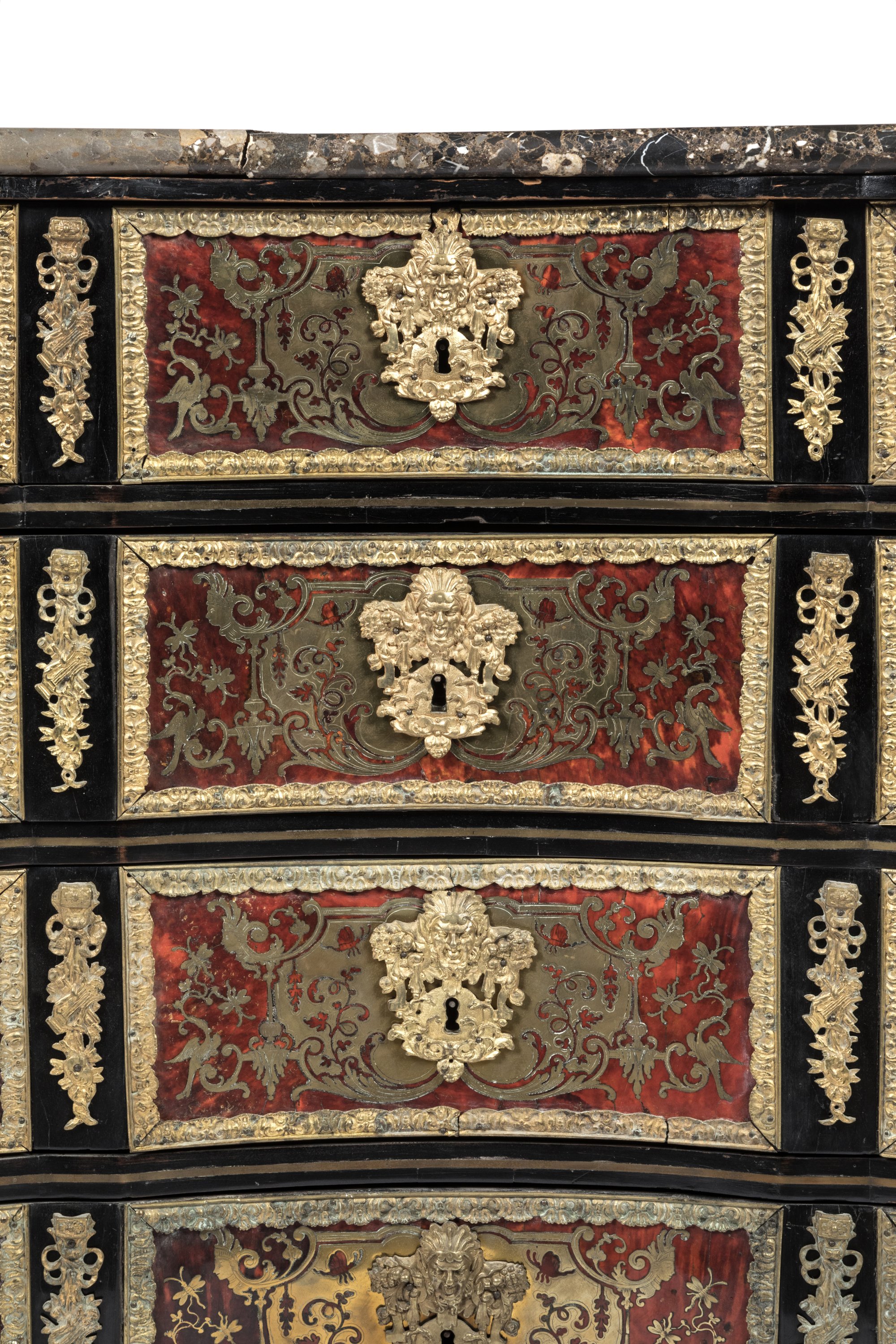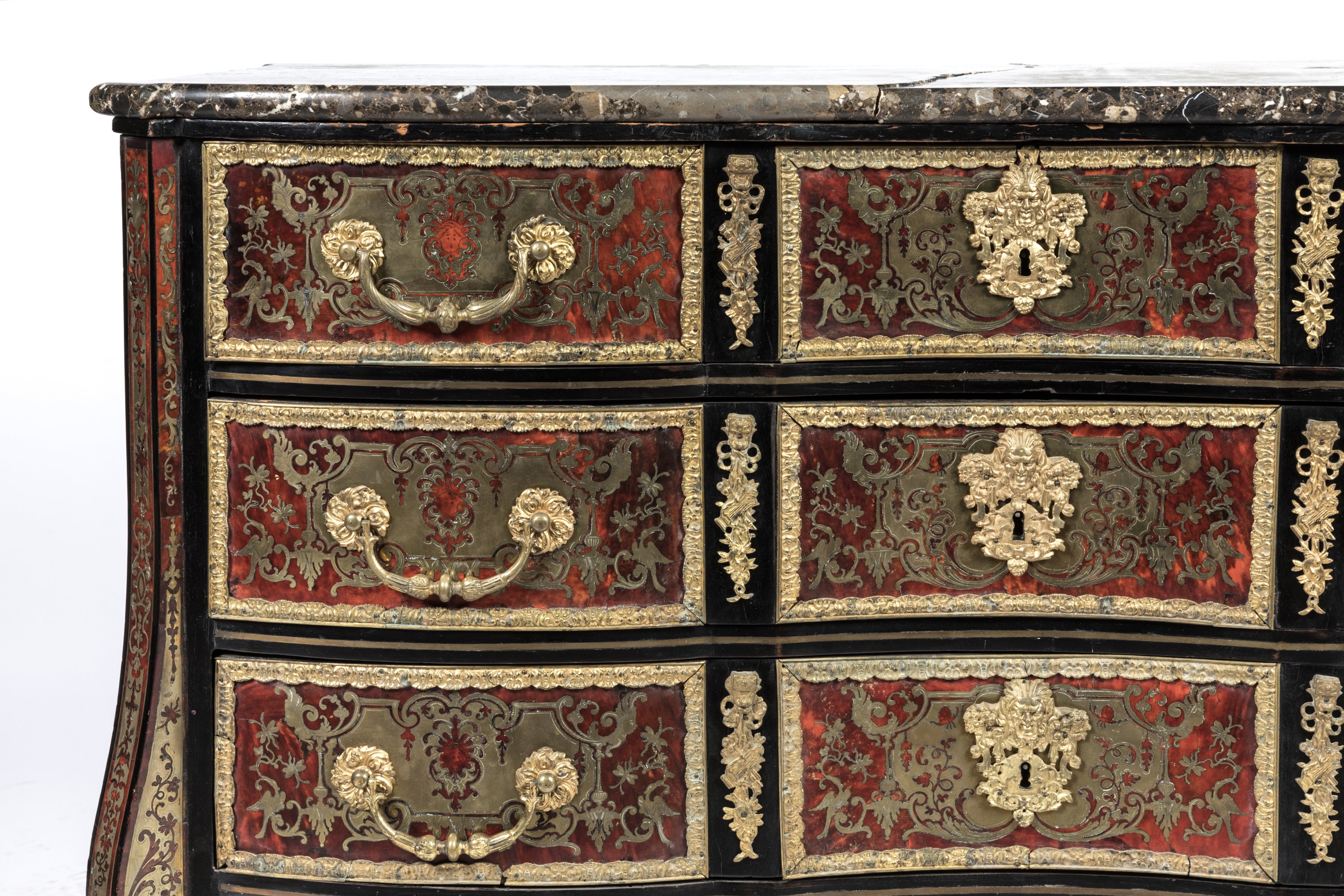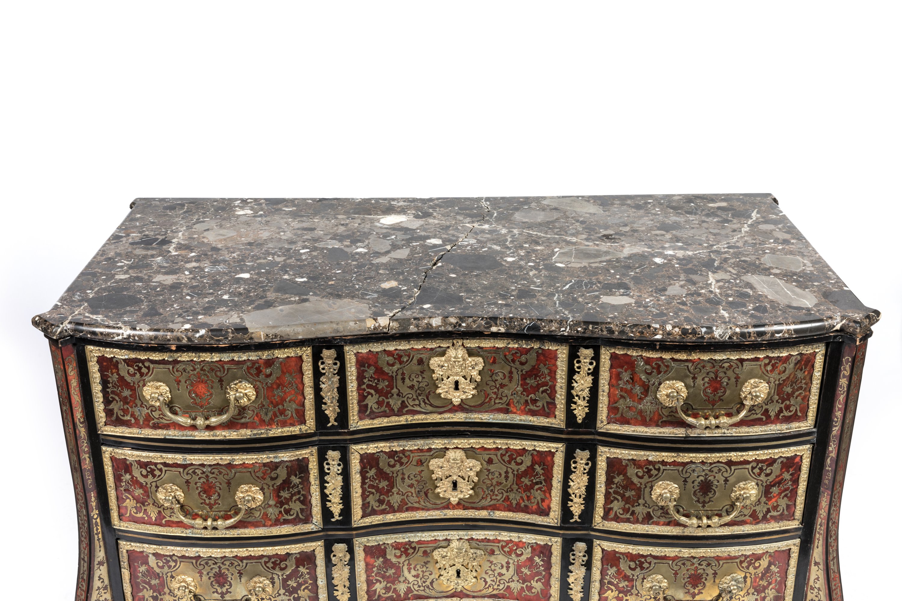 French, early 18th century. A so-called "Mazarine" commode with marquetry and red tortoiseshell inlaid with brass attributed to Nicolas Sageot. Gilt bronze ornaments, black marble top flecked with white veins and grey spots.