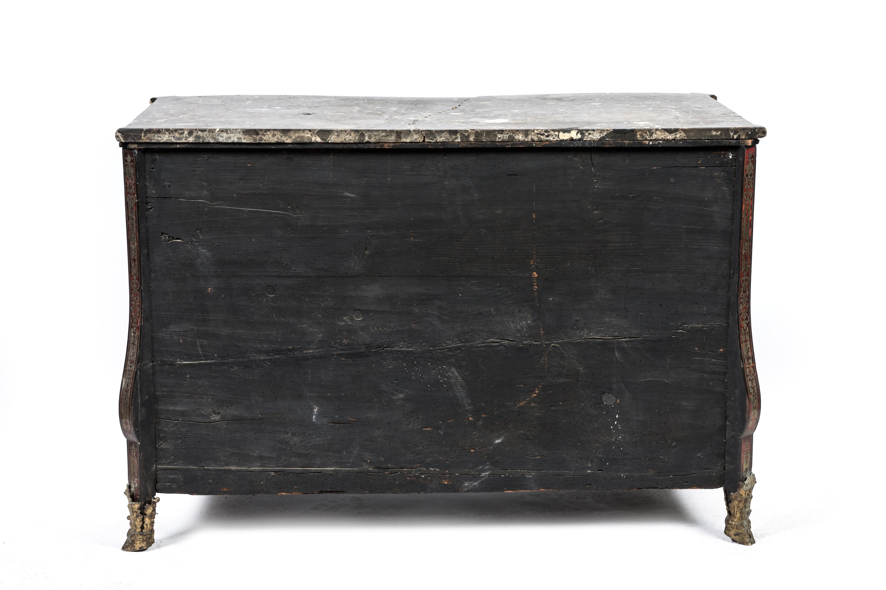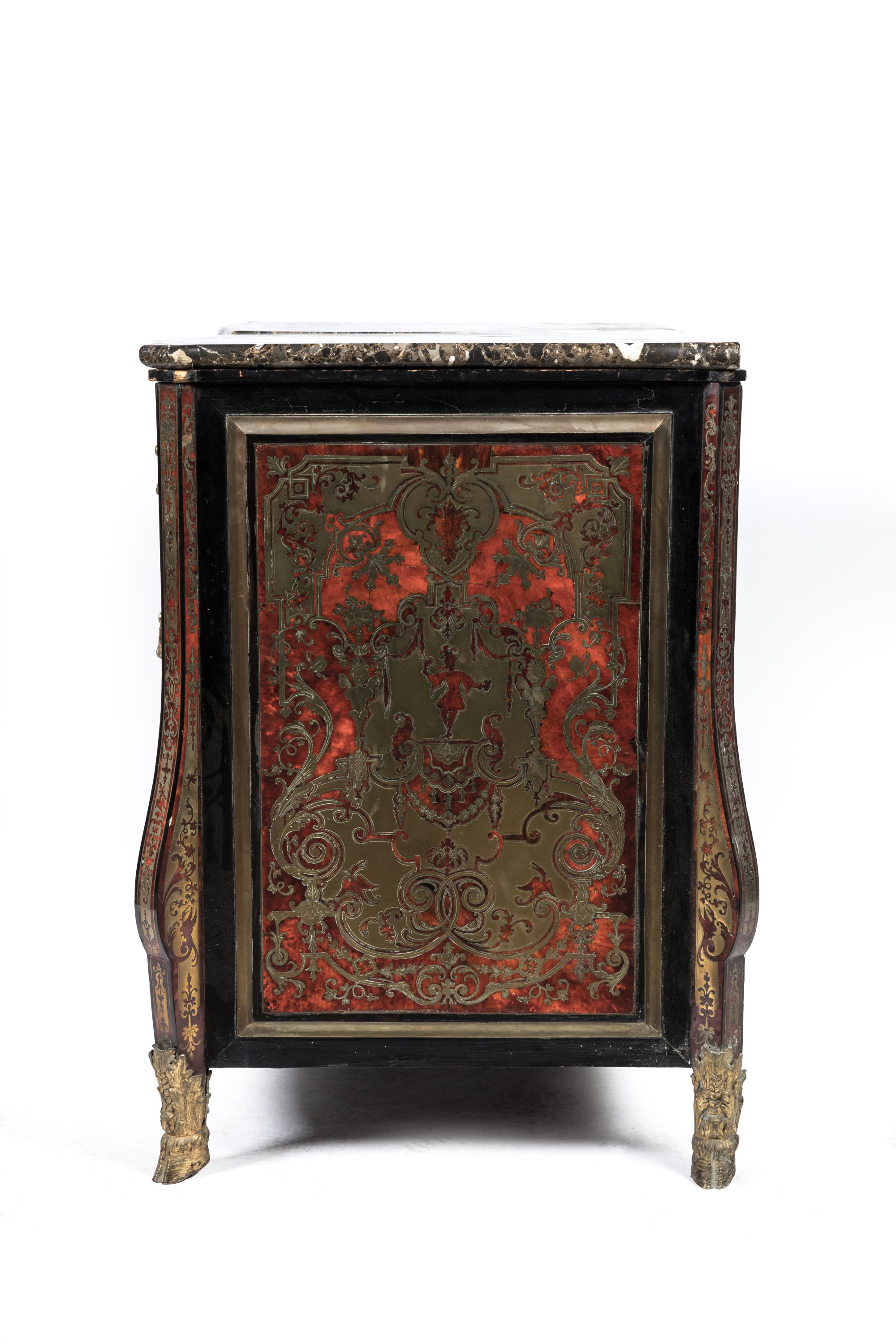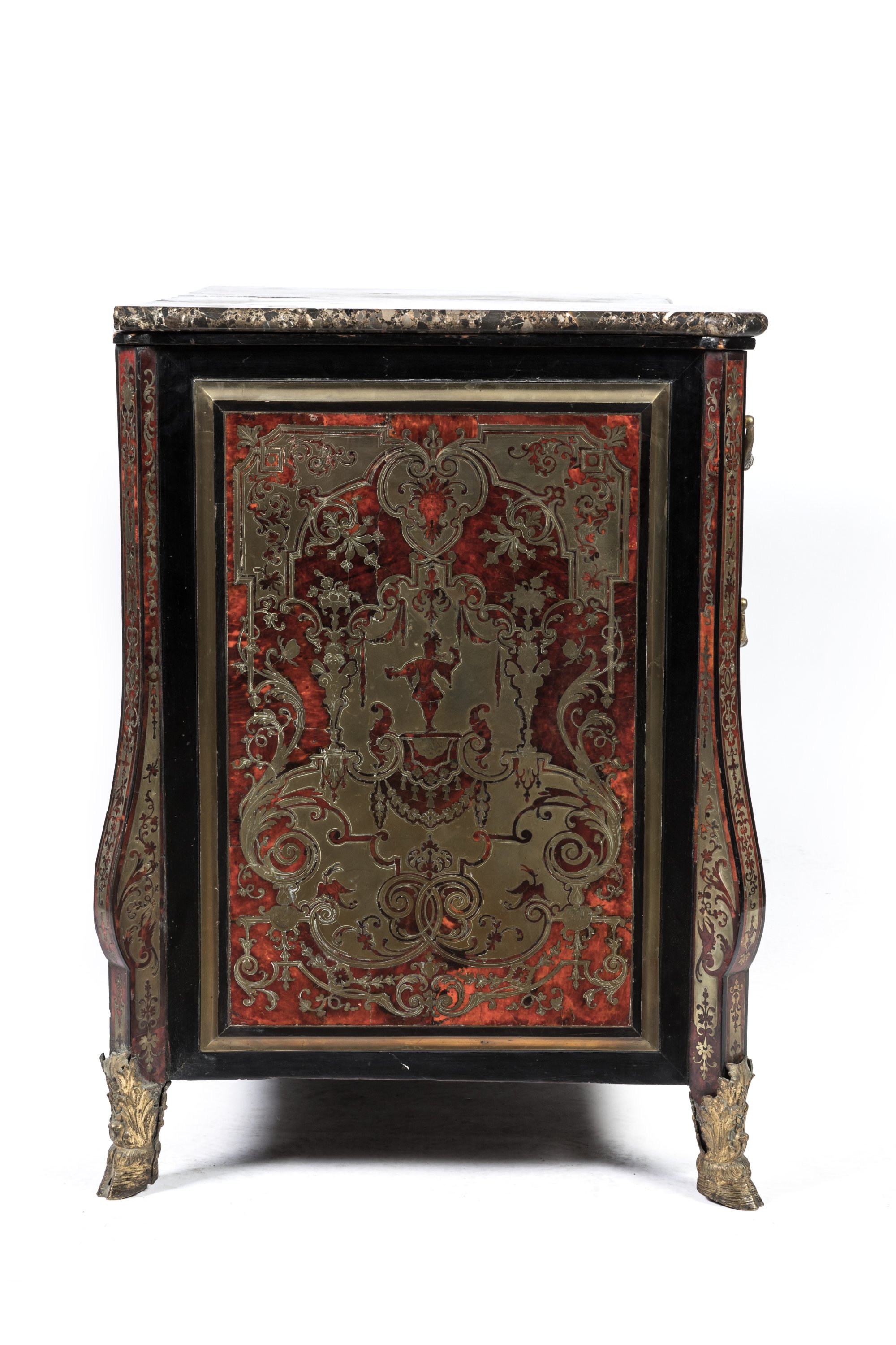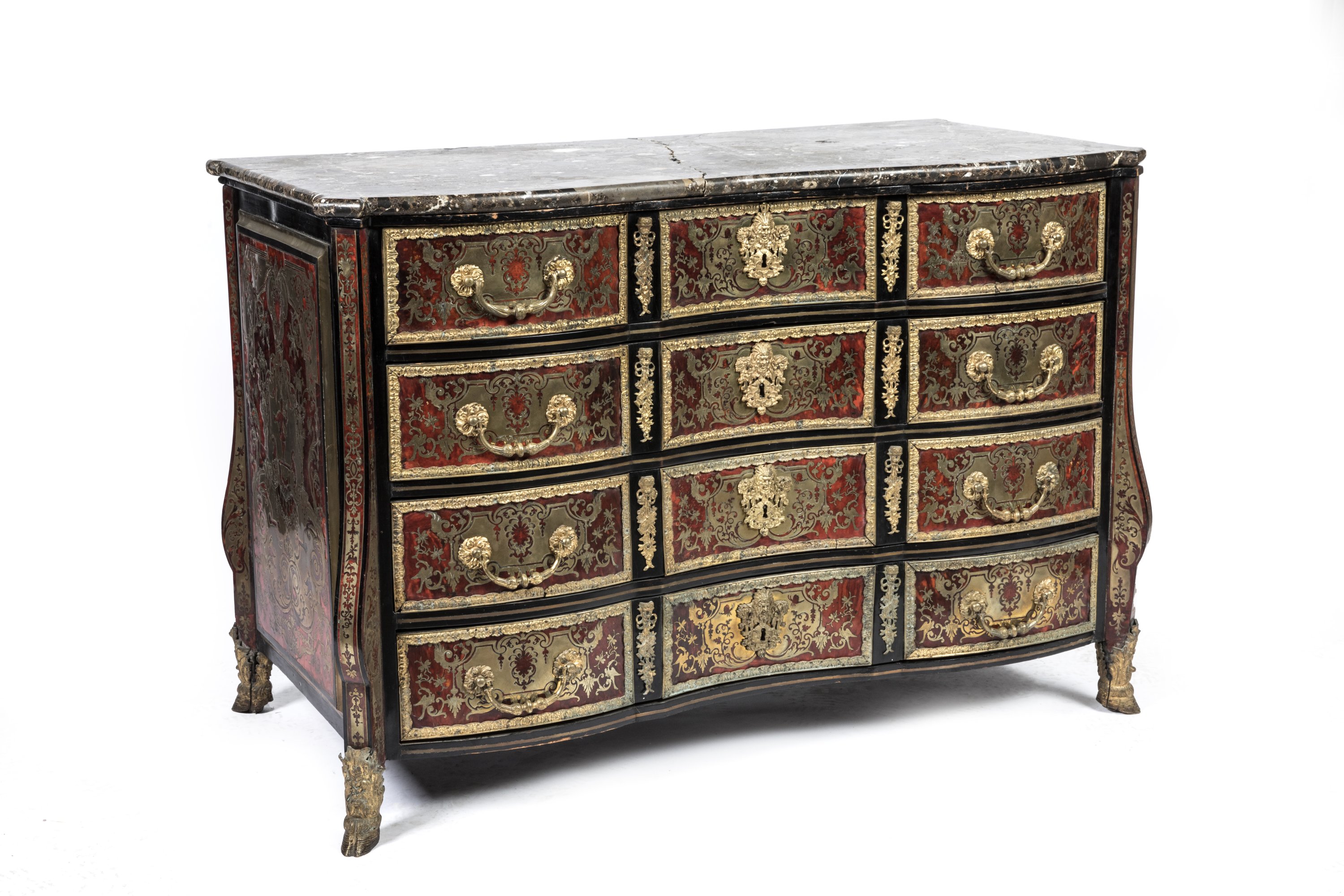 French, early 18th century. A so-called "Mazarine" commode with marquetry and red tortoiseshell inlaid with brass attributed to Nicolas Sageot. Gilt bronze ornaments, black marble top flecked with white veins and grey spots.