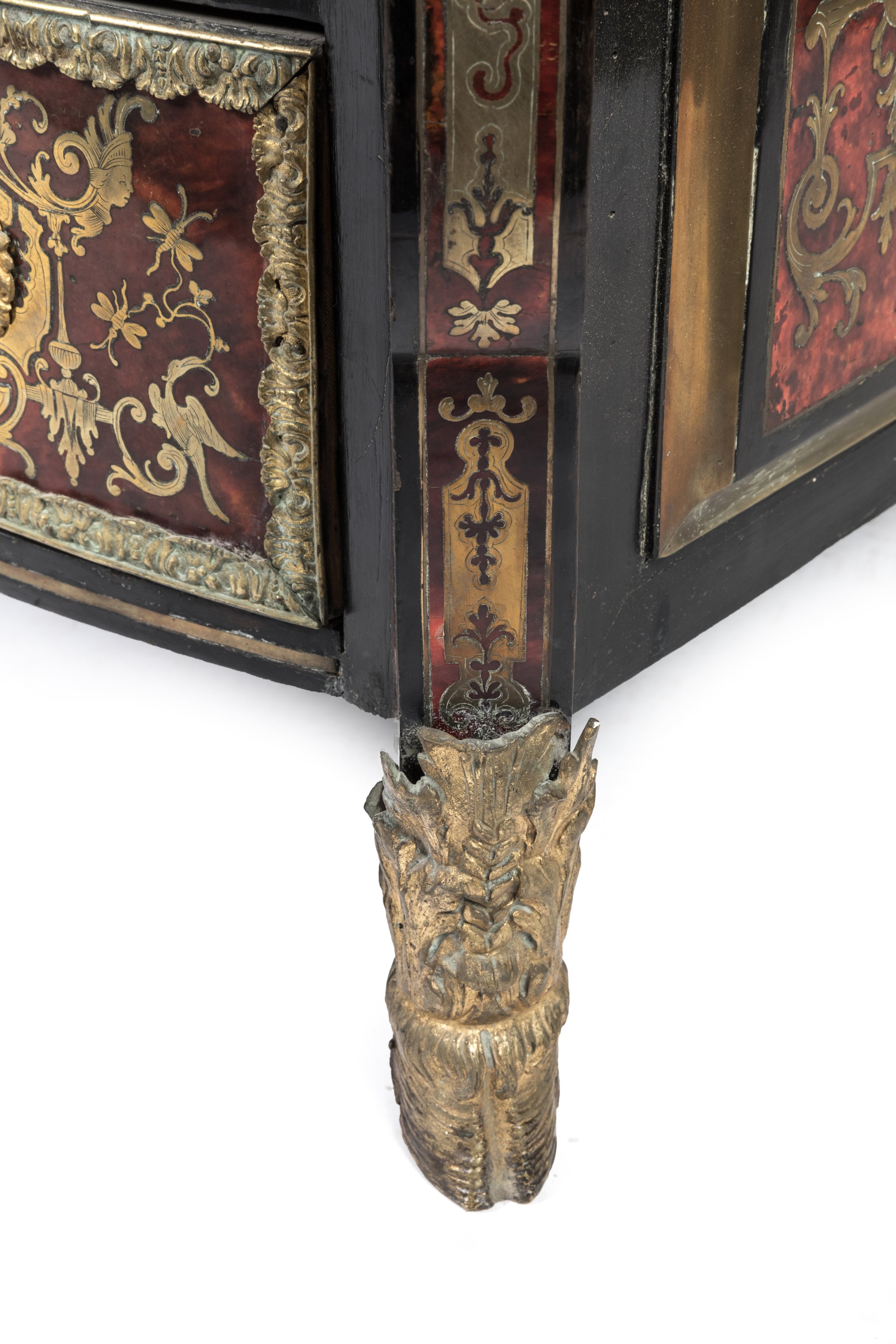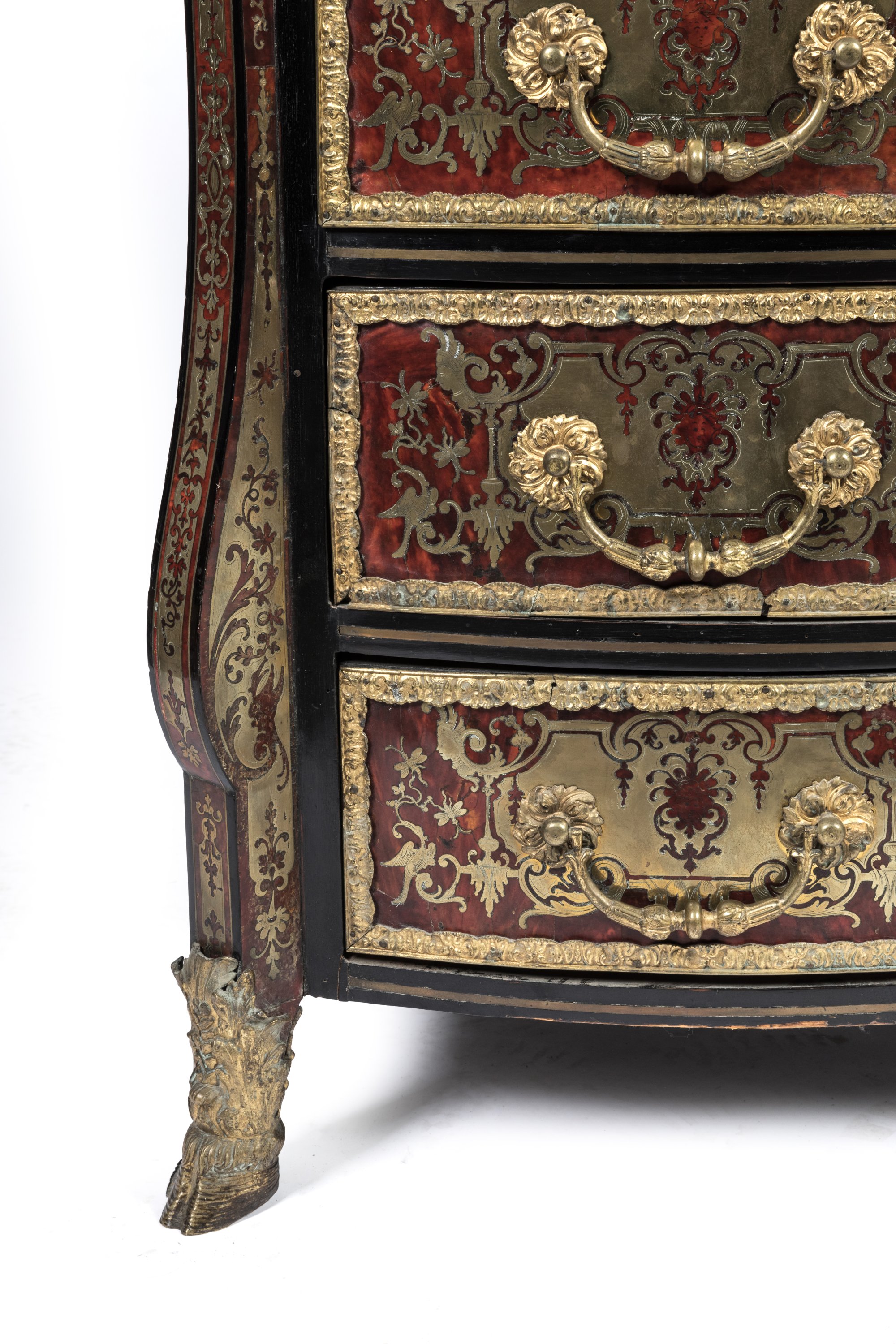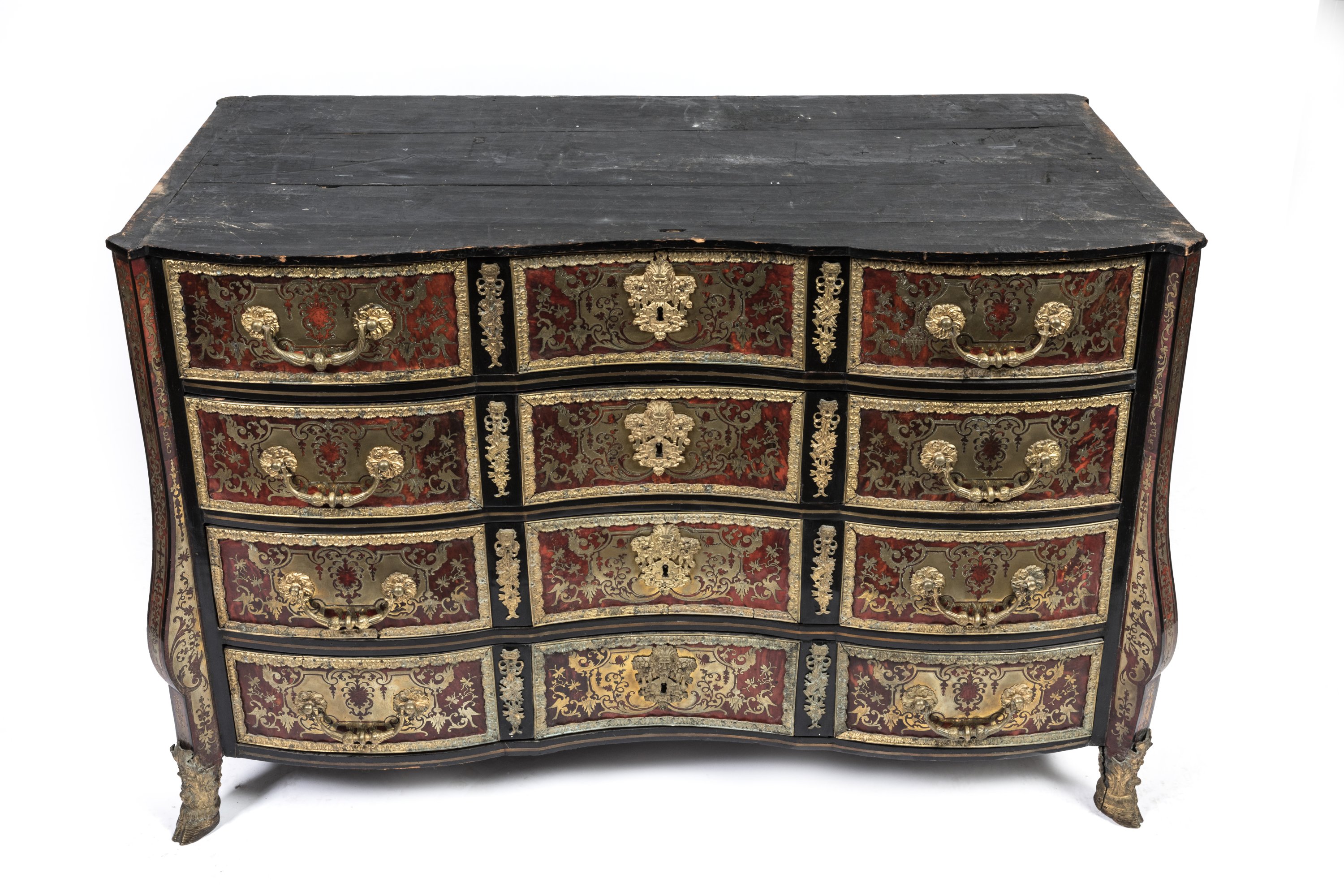 marquetée en première partie et contrepartie de laiton sur fond d'écaille de tortue teintée rouge. De forme légèrement mouvementée, les côtés en table saillantes, elle ouvre par quatre tiroirs sur quatre rangs à trois compartiments. Le décor s'épanouit sur trois faces: arabesques, rinceaux, mascarons, grotesques, coupes fleuries et insectes. Chaque réserve latérale présente un page esquissant un pas de danse dans un entourage d’entrelacs, rinceaux et volutes affrontées.