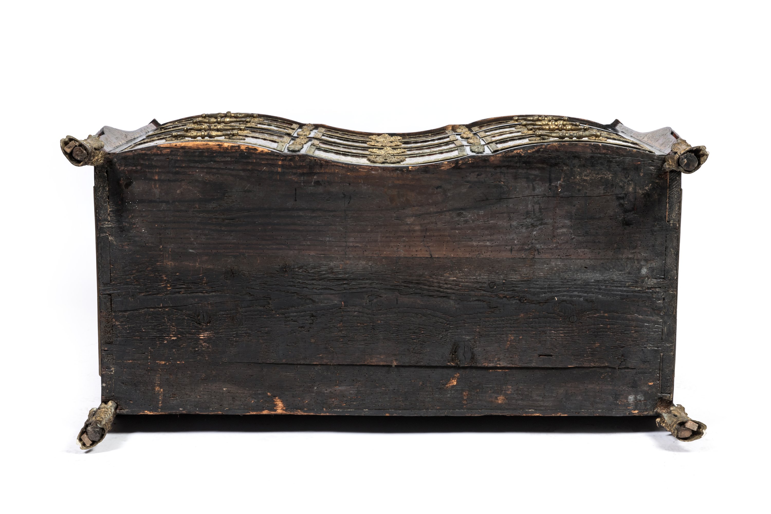 Ornementation en bronze doré: entrées de serrures à mascarons, frises feuillagées et mains à rosettes. Les montants en console renversée reposent sur quatre pieds en bronze doré en forme de sabots de biche.