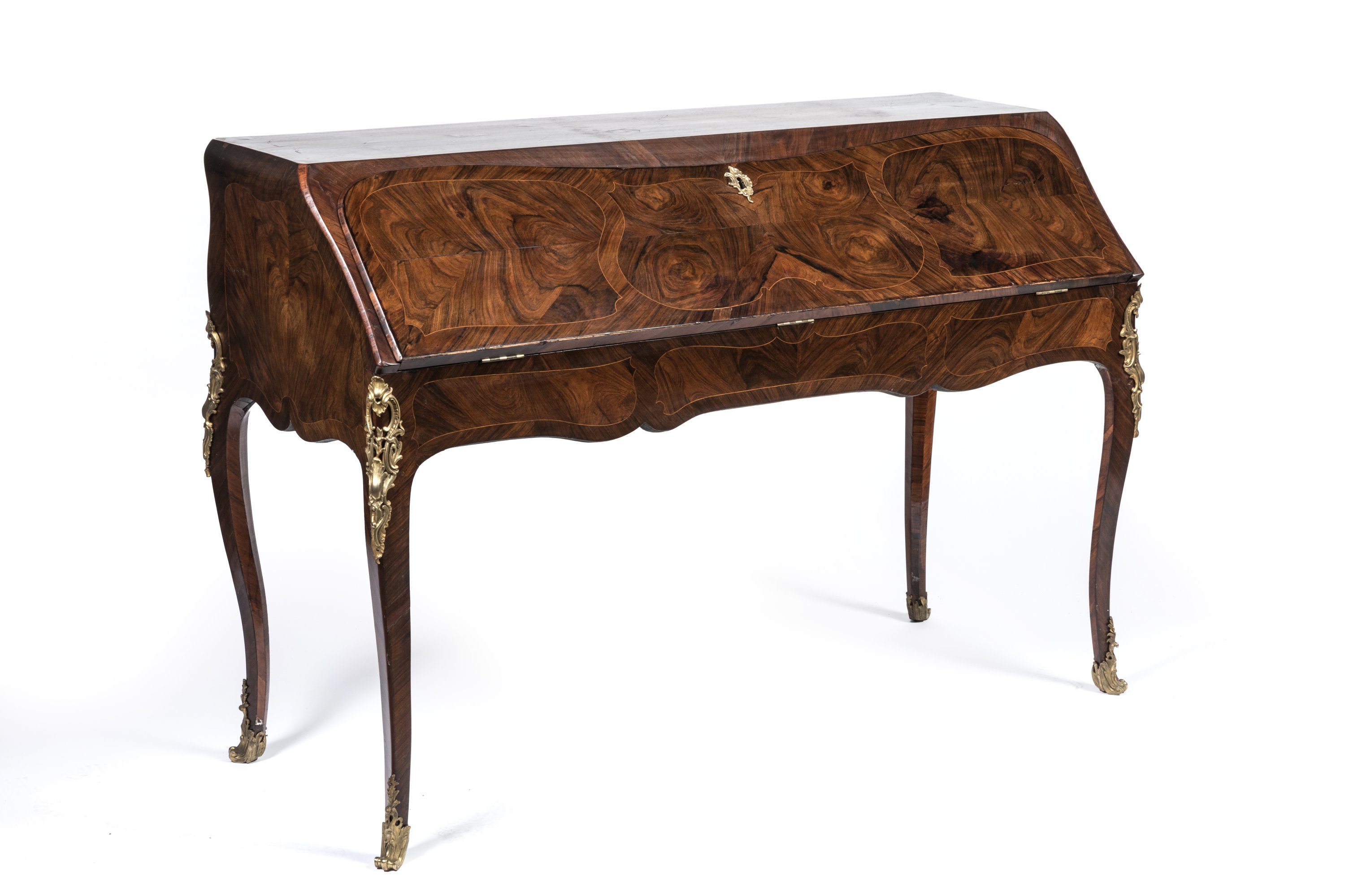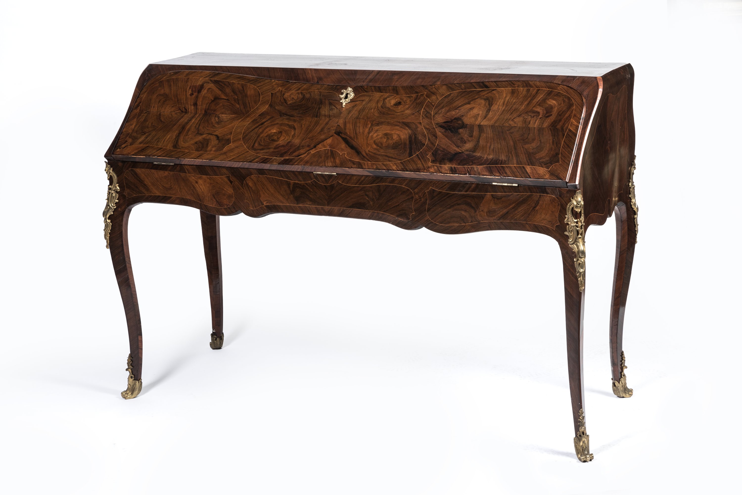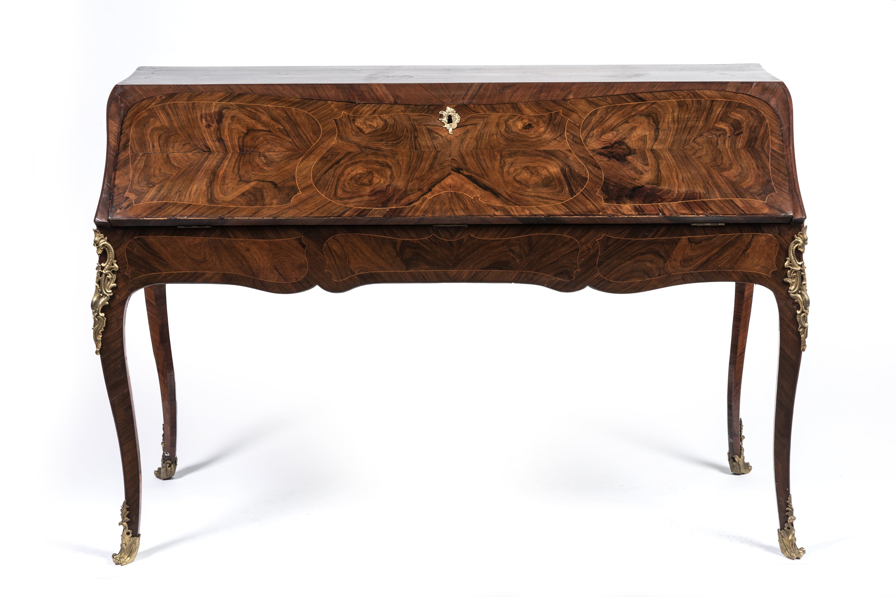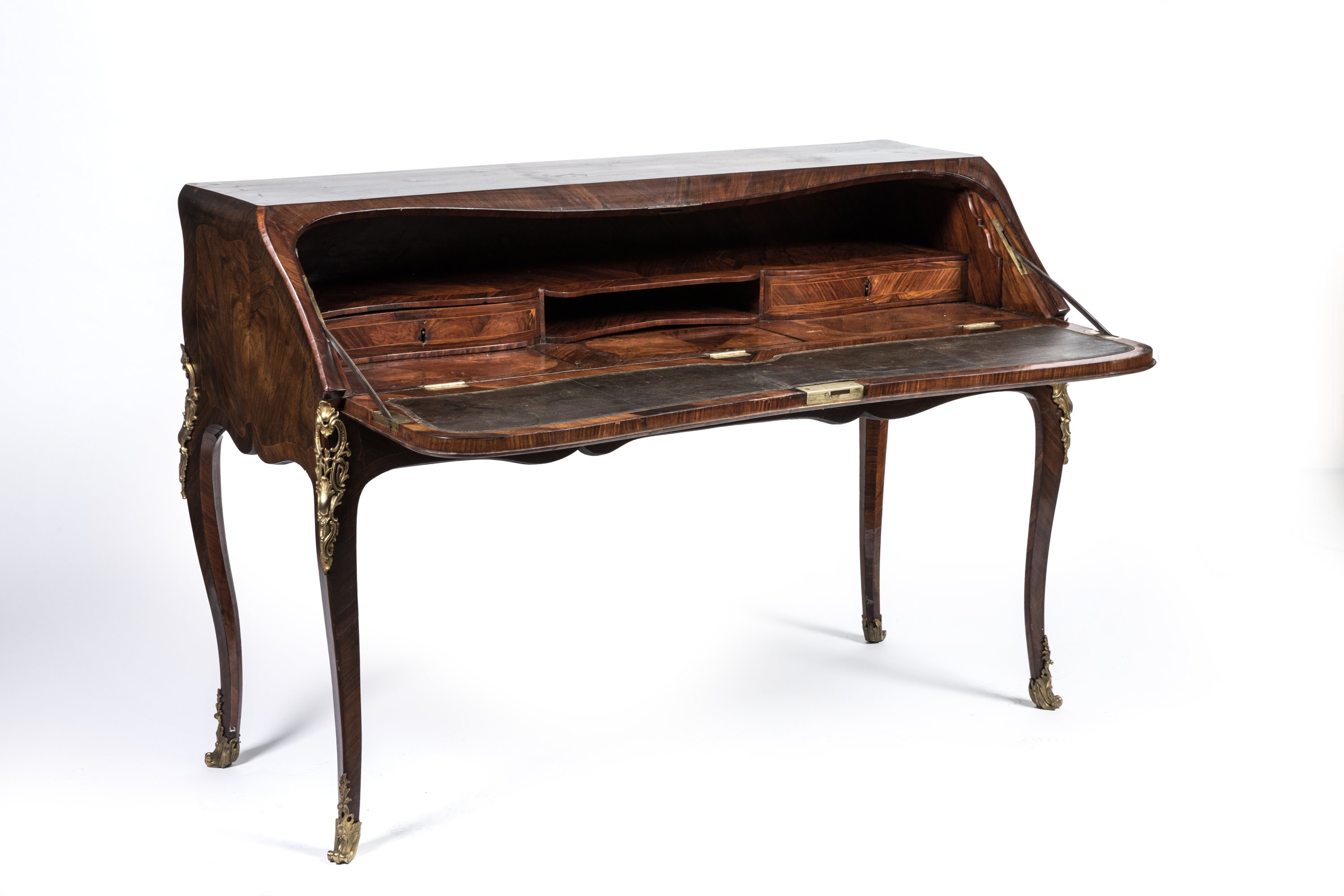 en placage de palissandre et filets de bois clair. Il ouvre en façade par un abattant décoré de trois cartouches et découvrant deux tiroirs, un retrait et trois secrets. Le plateau est gainé d'un cuir vert décoré aux petits fers de rinceaux, la ceinture chantournée. Il repose sur quatre pieds cambrés à cinq pans.