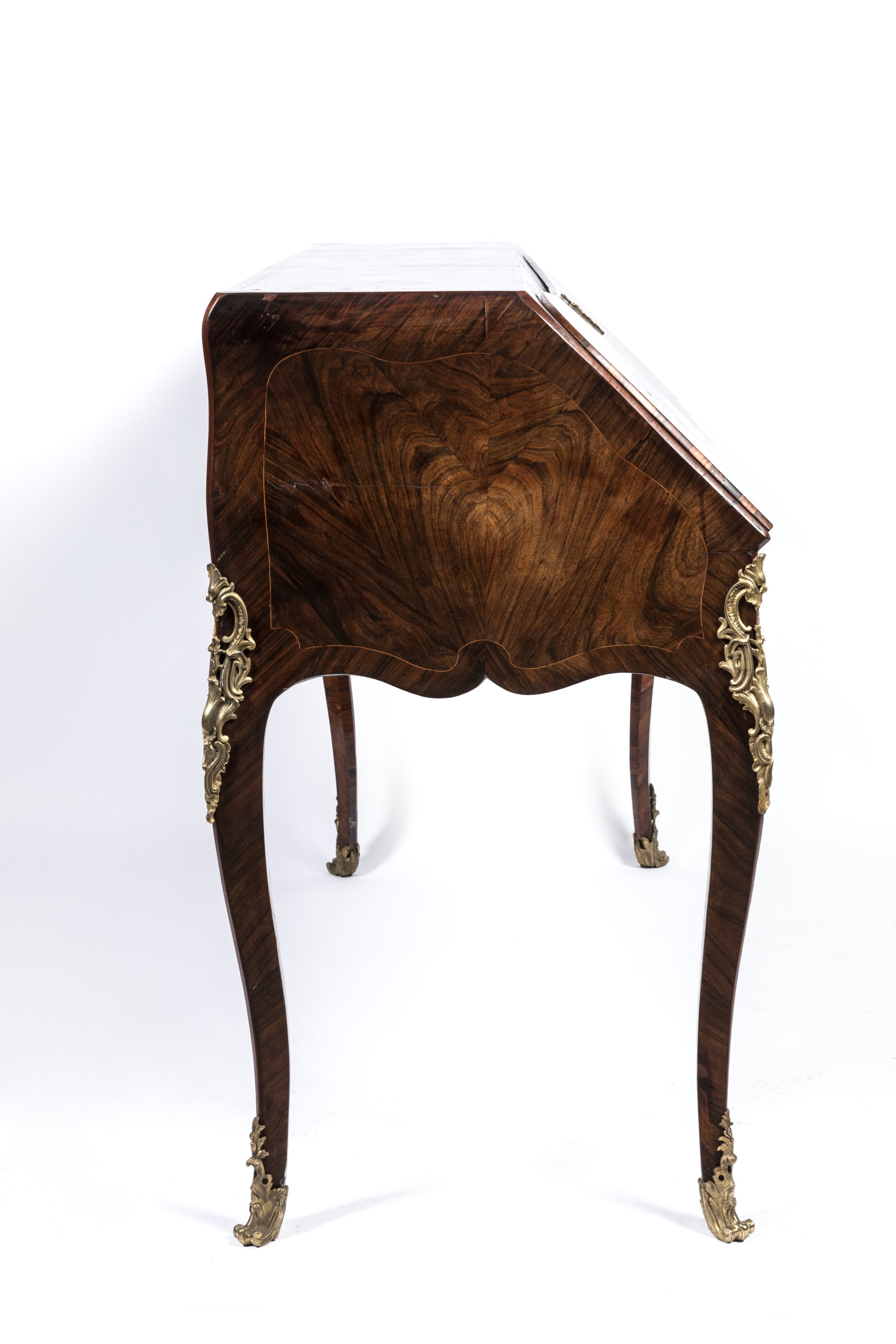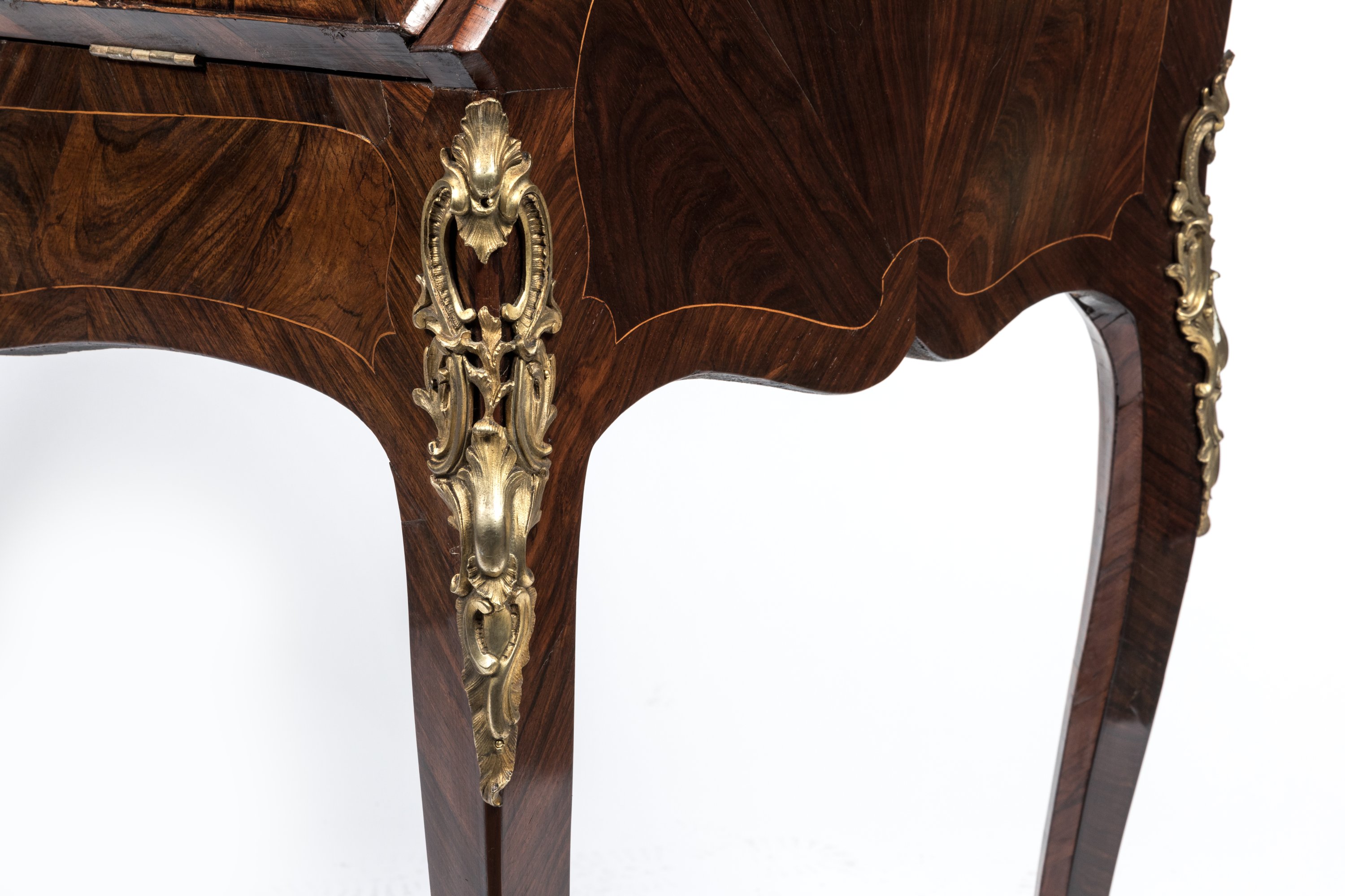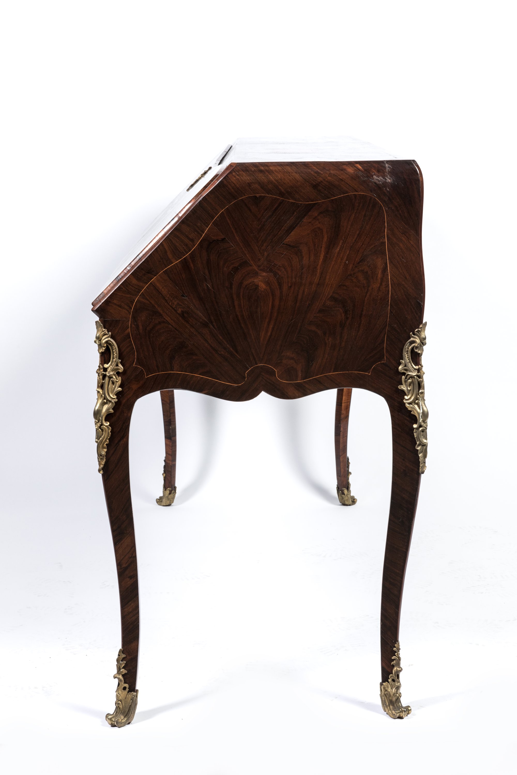 en placage de palissandre et filets de bois clair. Il ouvre en façade par un abattant décoré de trois cartouches et découvrant deux tiroirs, un retrait et trois secrets. Le plateau est gainé d'un cuir vert décoré aux petits fers de rinceaux, la ceinture chantournée. Il repose sur quatre pieds cambrés à cinq pans.