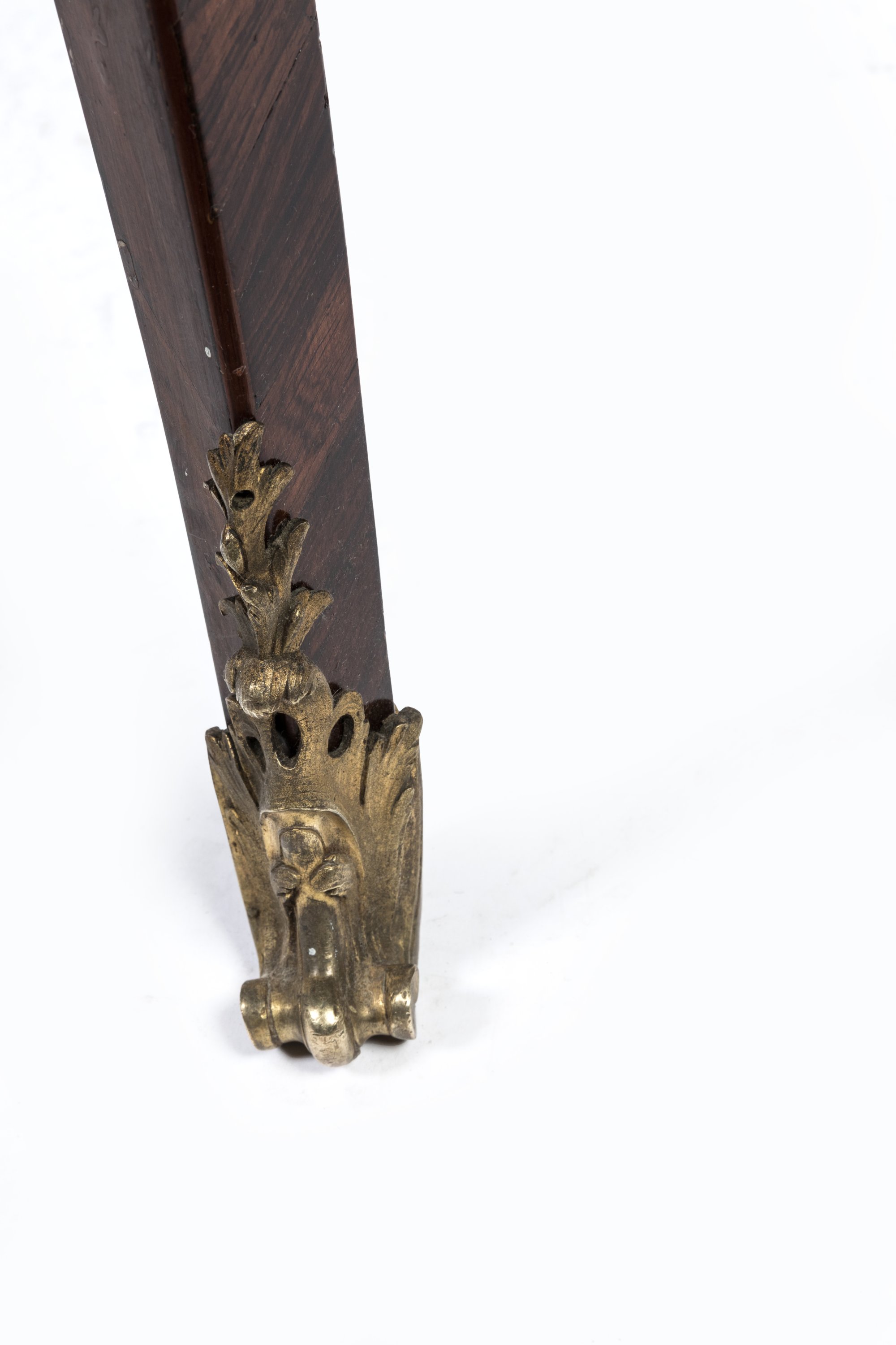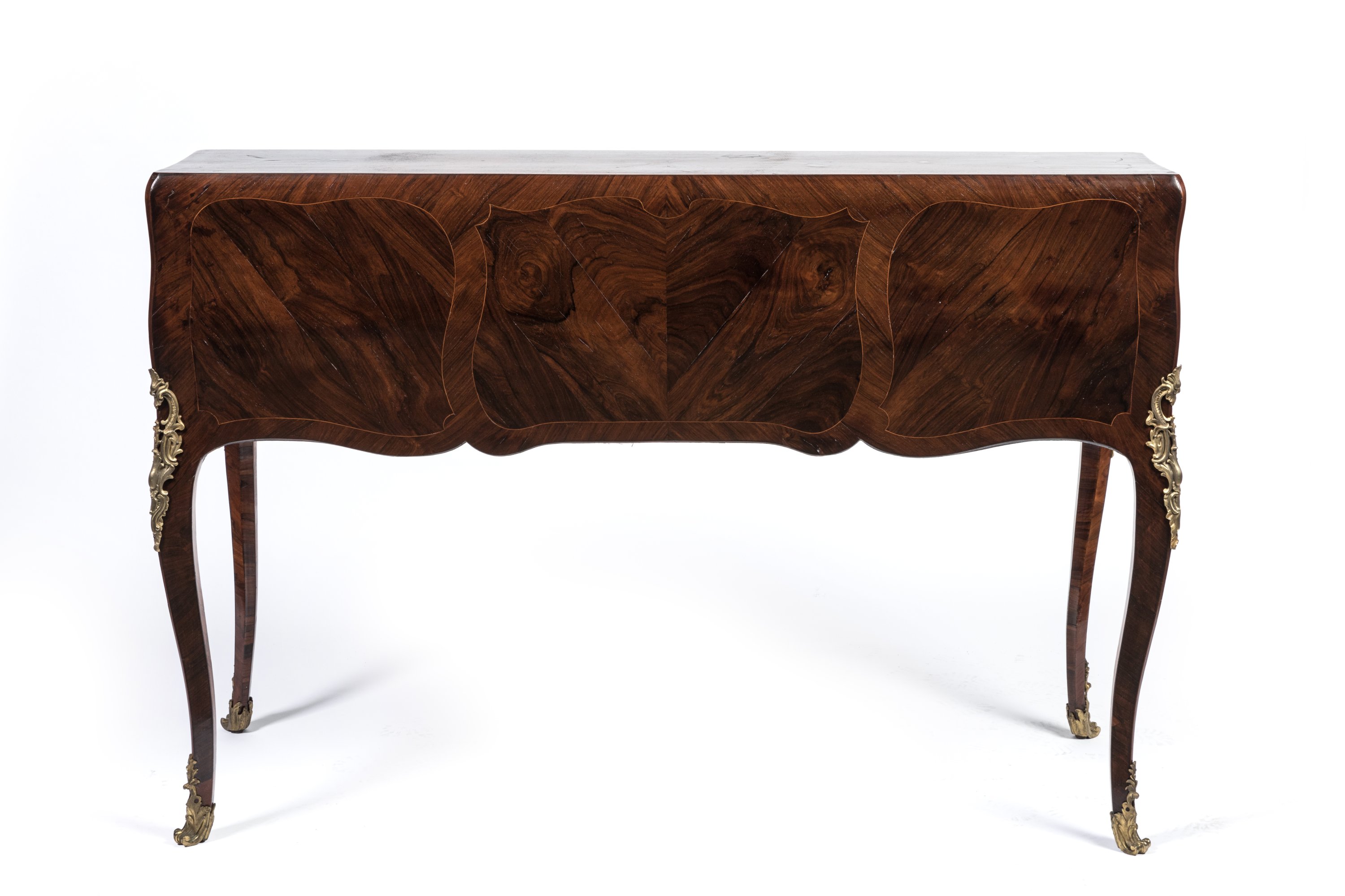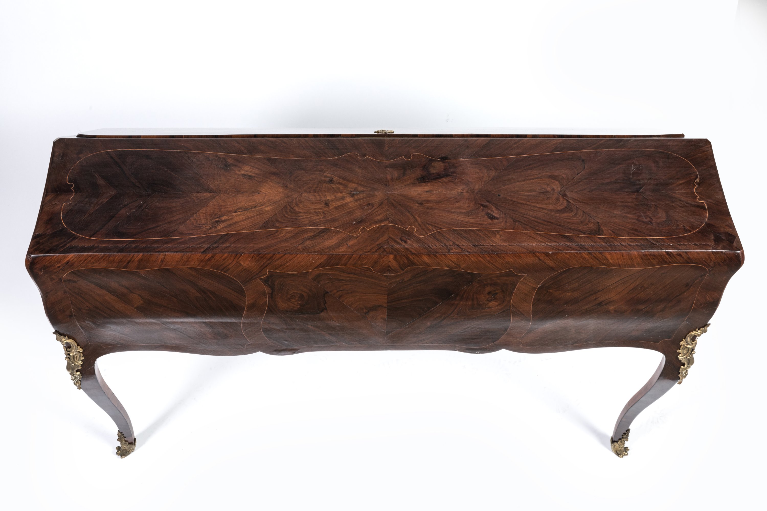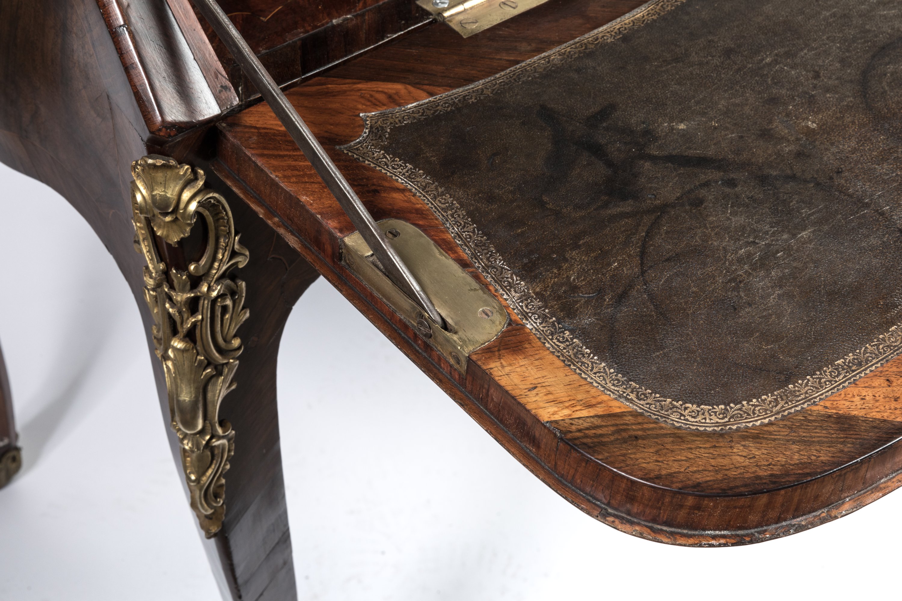 en placage de palissandre et filets de bois clair. Il ouvre en façade par un abattant décoré de trois cartouches et découvrant deux tiroirs, un retrait et trois secrets. Le plateau est gainé d'un cuir vert décoré aux petits fers de rinceaux, la ceinture chantournée. Il repose sur quatre pieds cambrés à cinq pans.