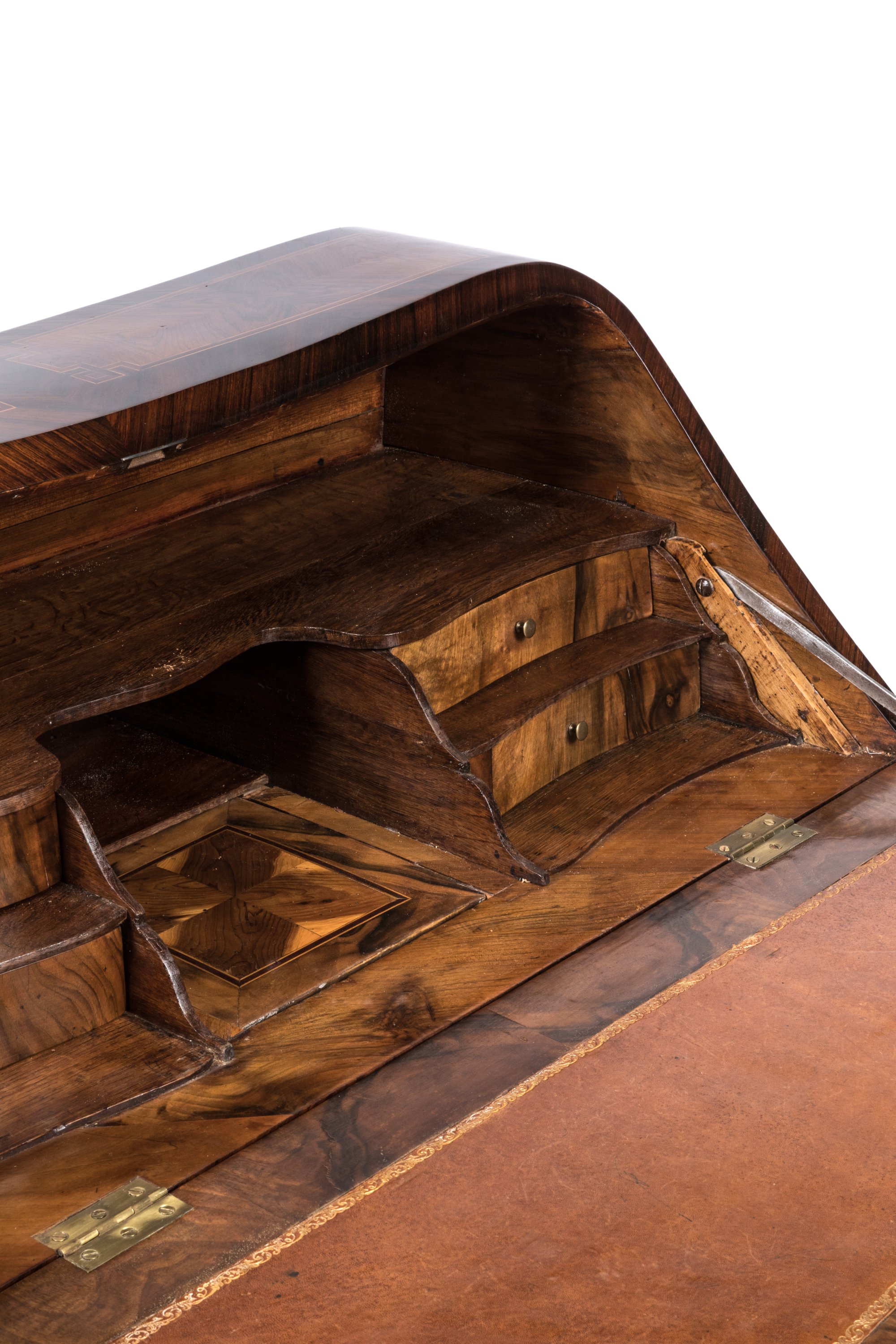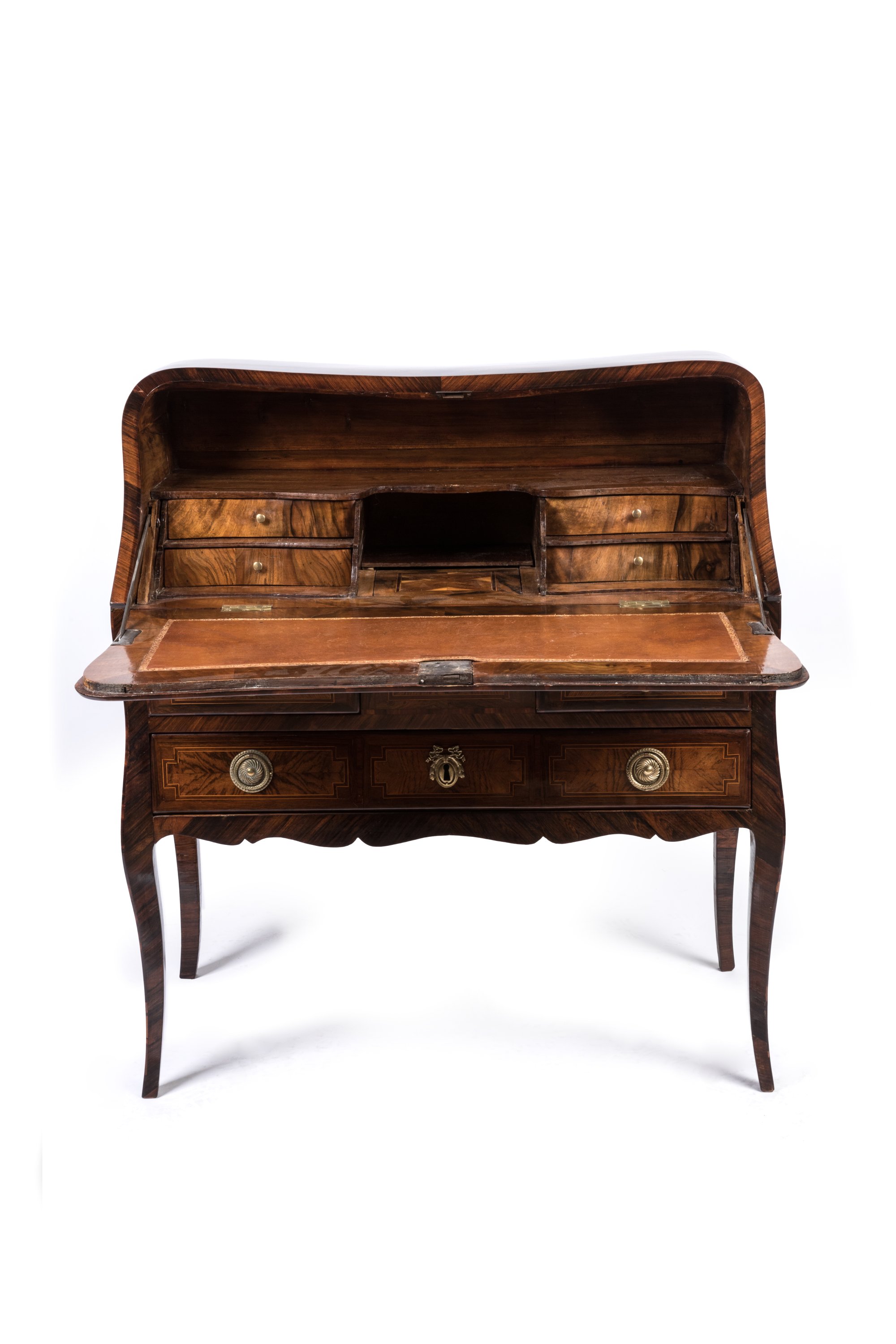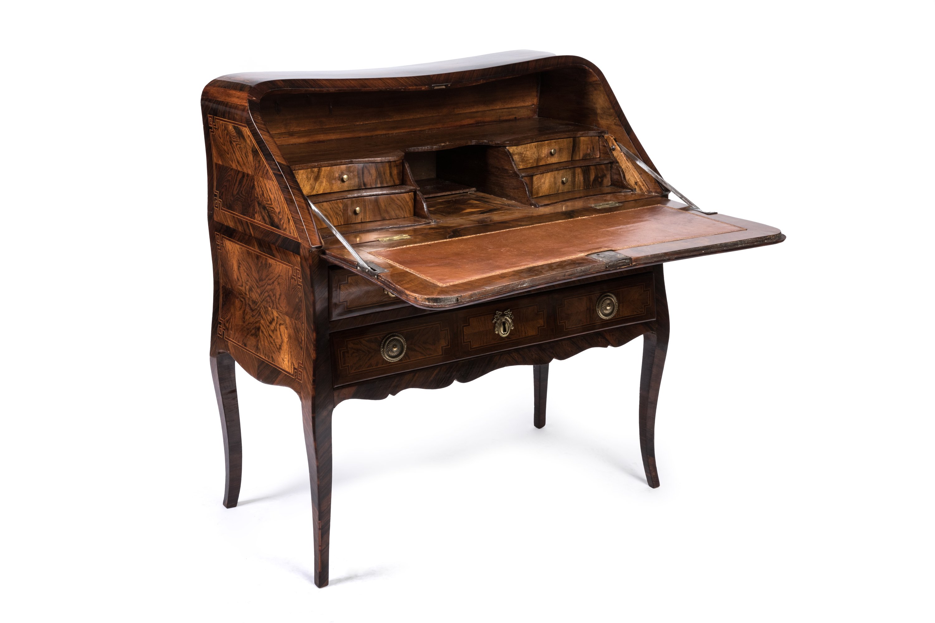 en placage d'amarante et bois de rose, ouvrant en façade par un abattant orné de deux tables à filets de bois clair aux angles rentrés et entrelacés encadrant une marqueterie en ailes de papillon. Il découvre quatre tiroirs sur deux rangs encadrant un secret. Le plateau foncé d'un cuir fauve à décor aux petits fers de rinceaux. Trois tiroirs en façade sur deux rangs, le tablier de forme chantournée, les montants pincés se prolongeant par quatre pieds cambrés.