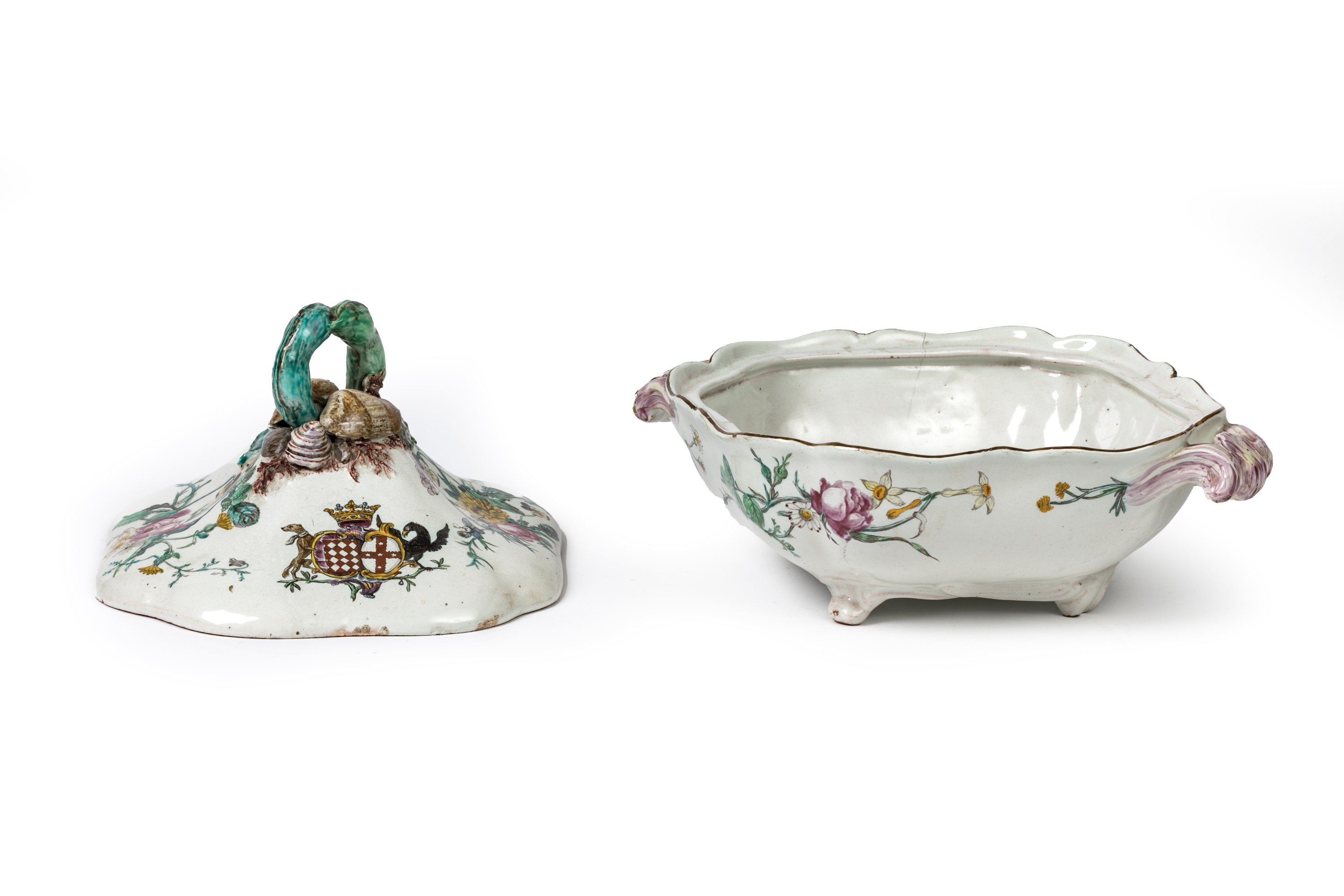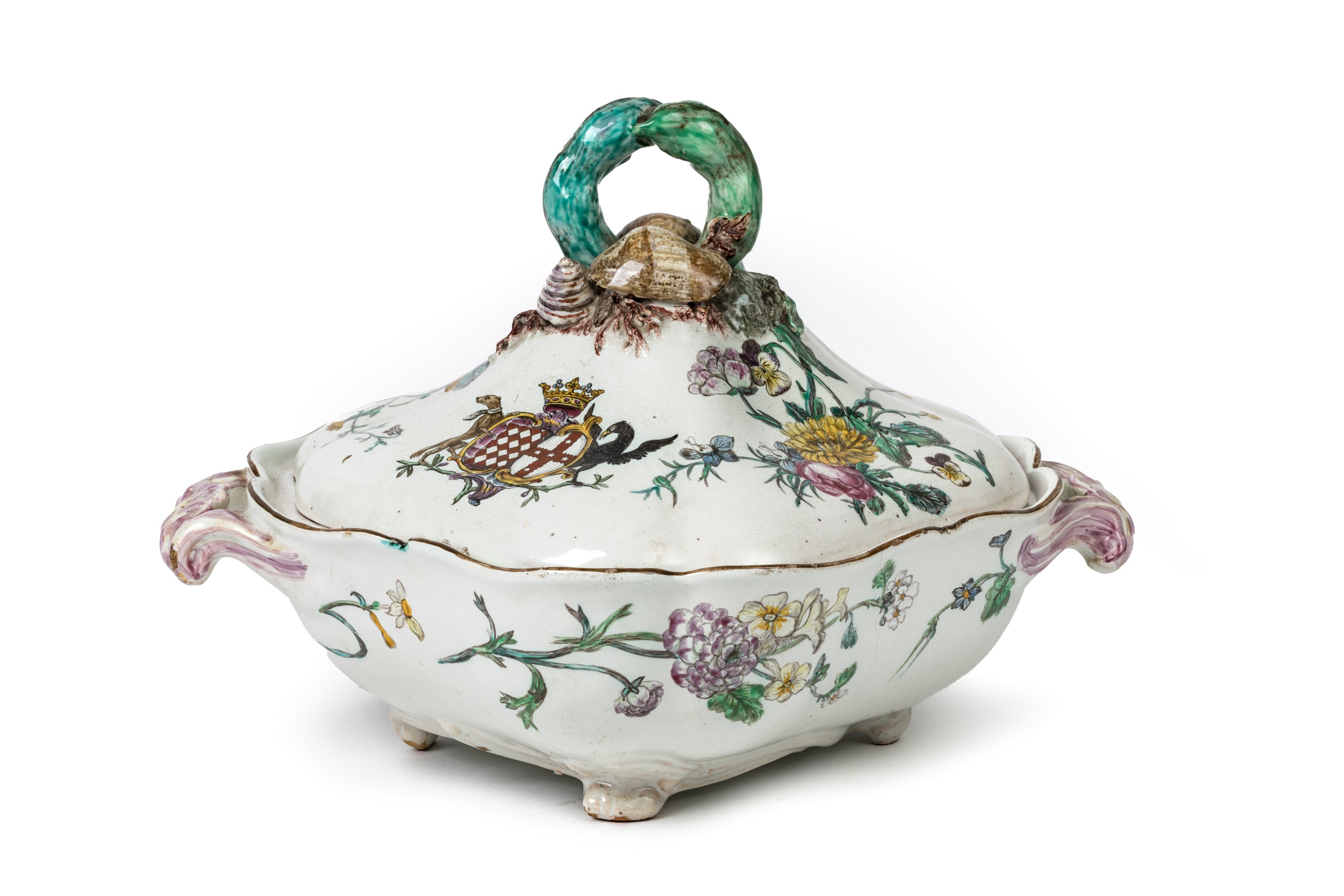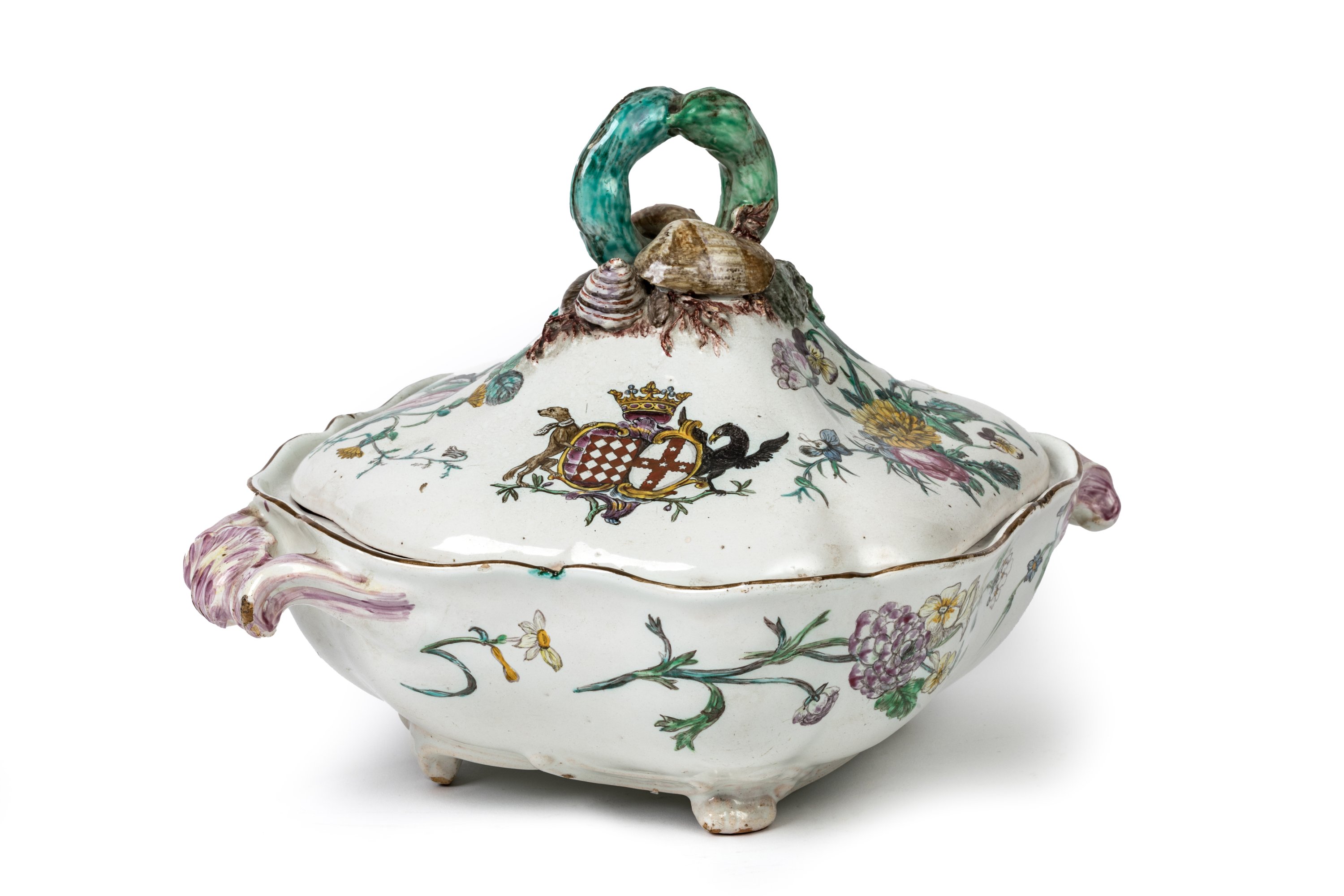 en faïence de forme losange, muni d’anses en forme de rinceaux rocaille rehaussés de peignés roses, la prise du couvercle en forme de branches, coquilles et algues à décor polychrome de bouquets de fleurs et orné des armoiries d’alliance des familles Geffrard de la Motte et Rulault de Sanois (Bretagne) dans deux écus supportés par un lévrier et un rapace sous une couronne de marquis.