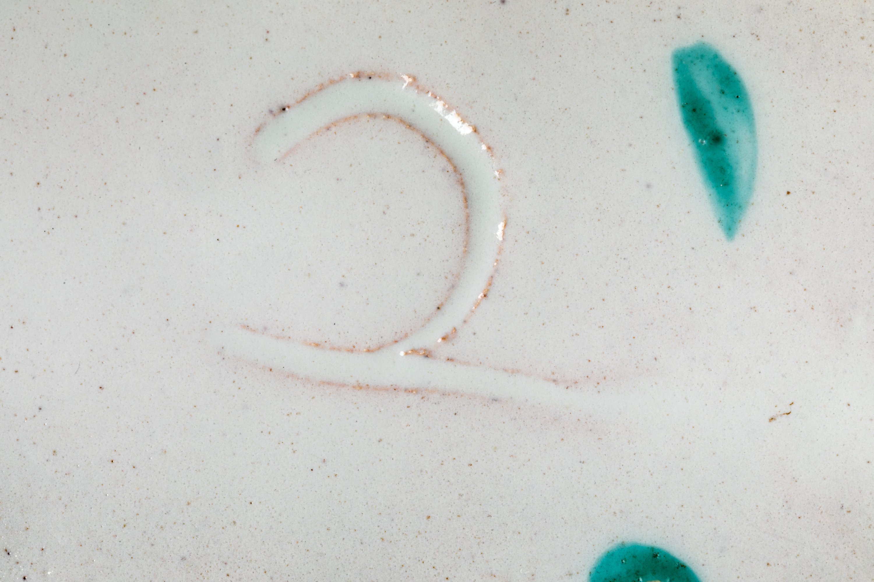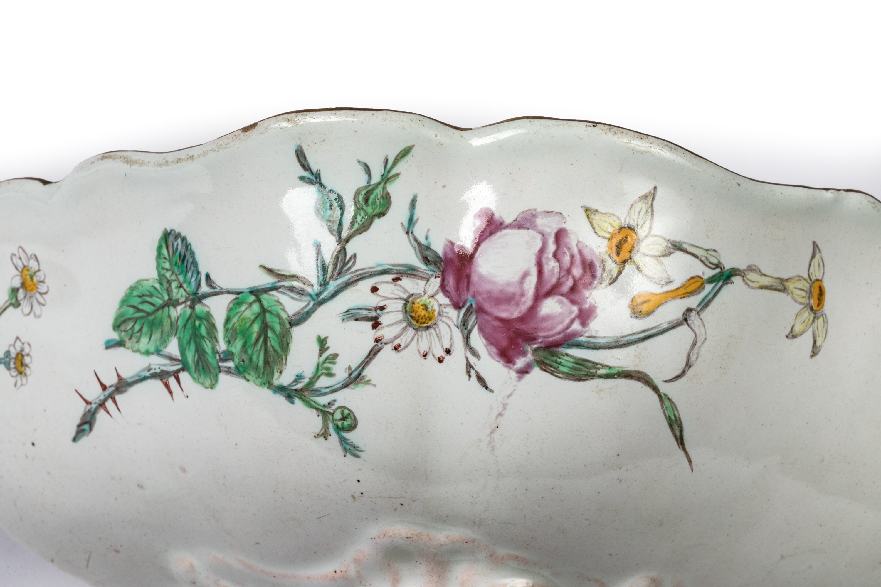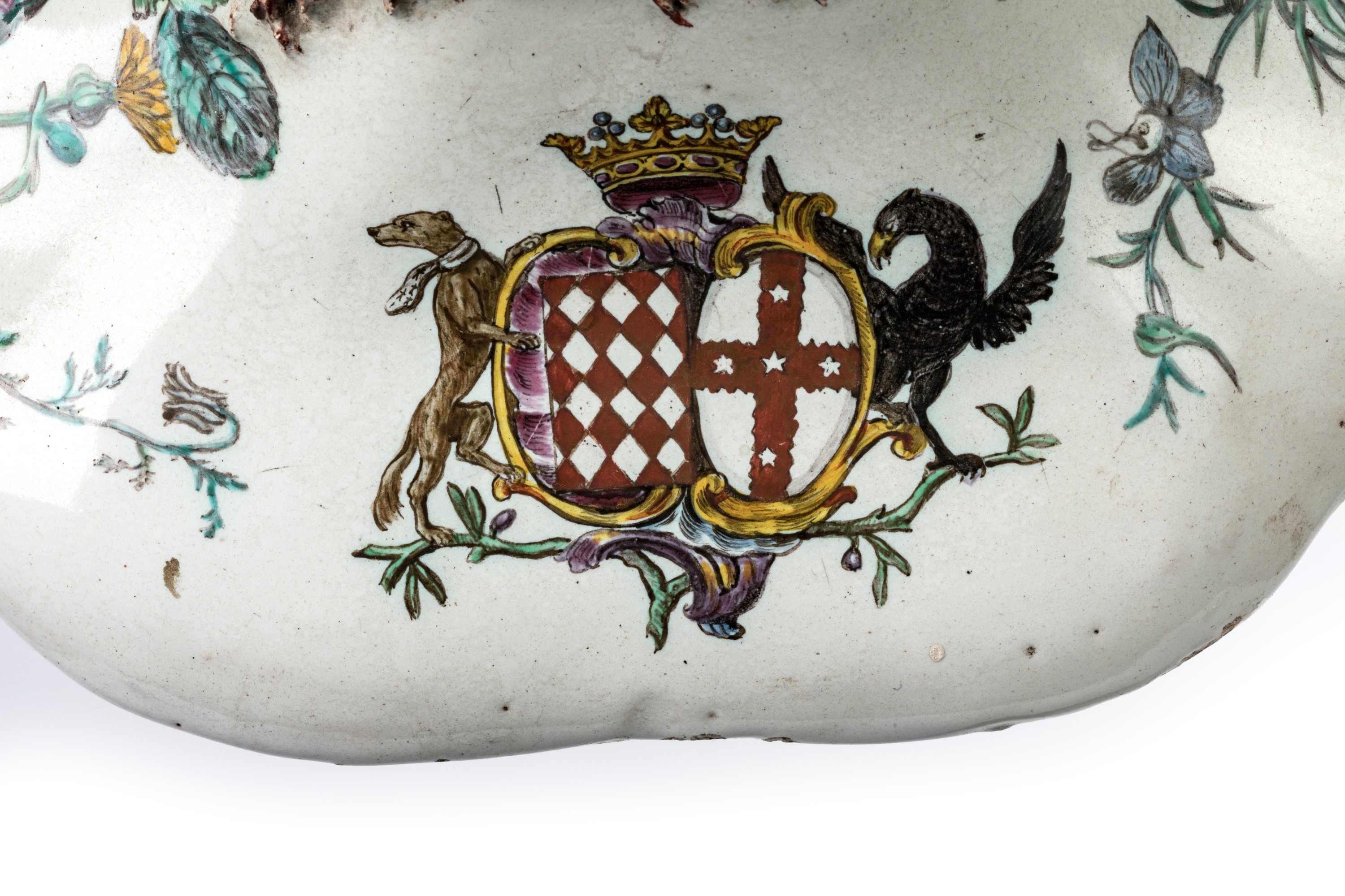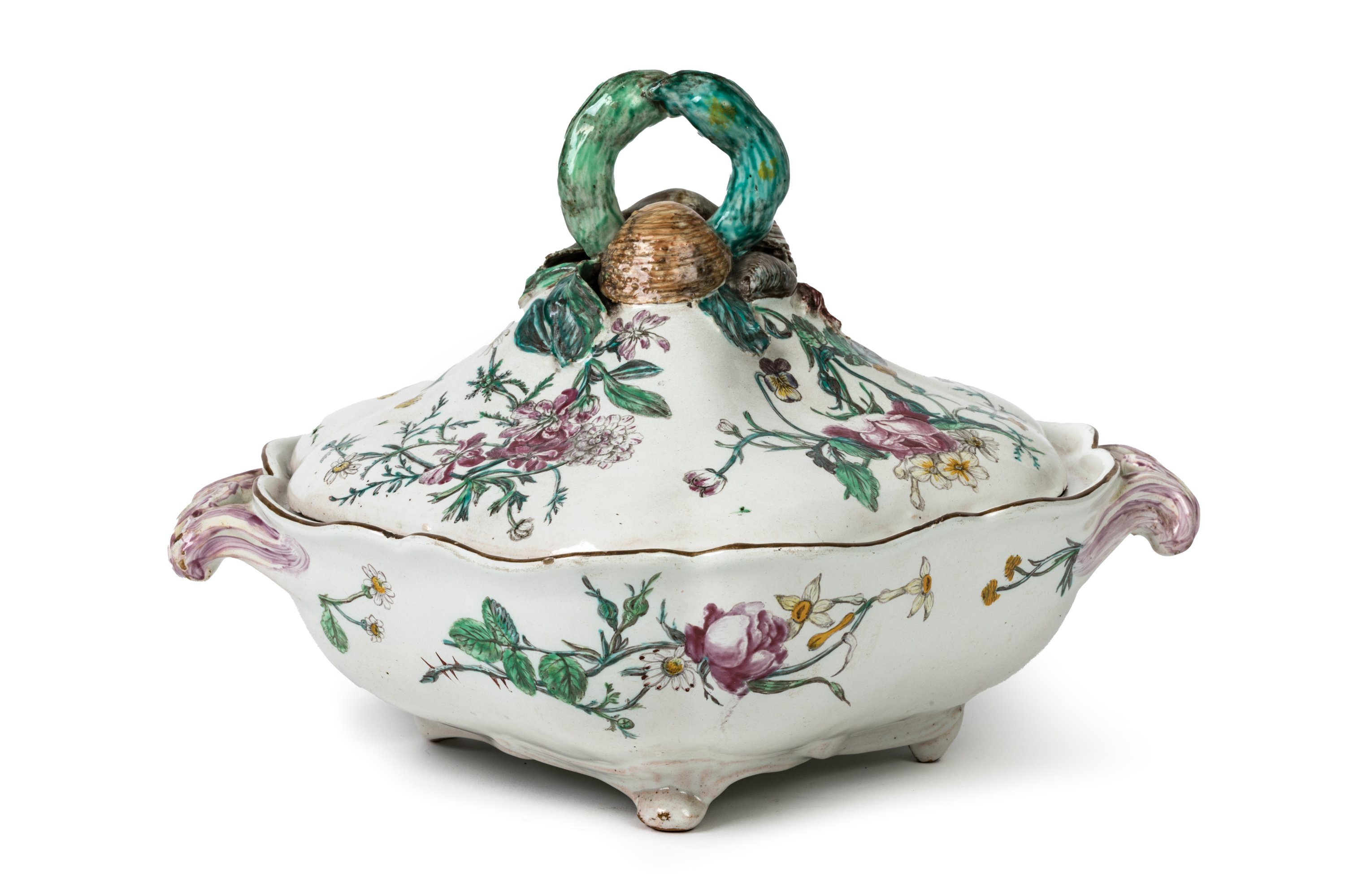 en faïence de forme losange, muni d’anses en forme de rinceaux rocaille rehaussés de peignés roses, la prise du couvercle en forme de branches, coquilles et algues à décor polychrome de bouquets de fleurs et orné des armoiries d’alliance des familles Geffrard de la Motte et Rulault de Sanois (Bretagne) dans deux écus supportés par un lévrier et un rapace sous une couronne de marquis.