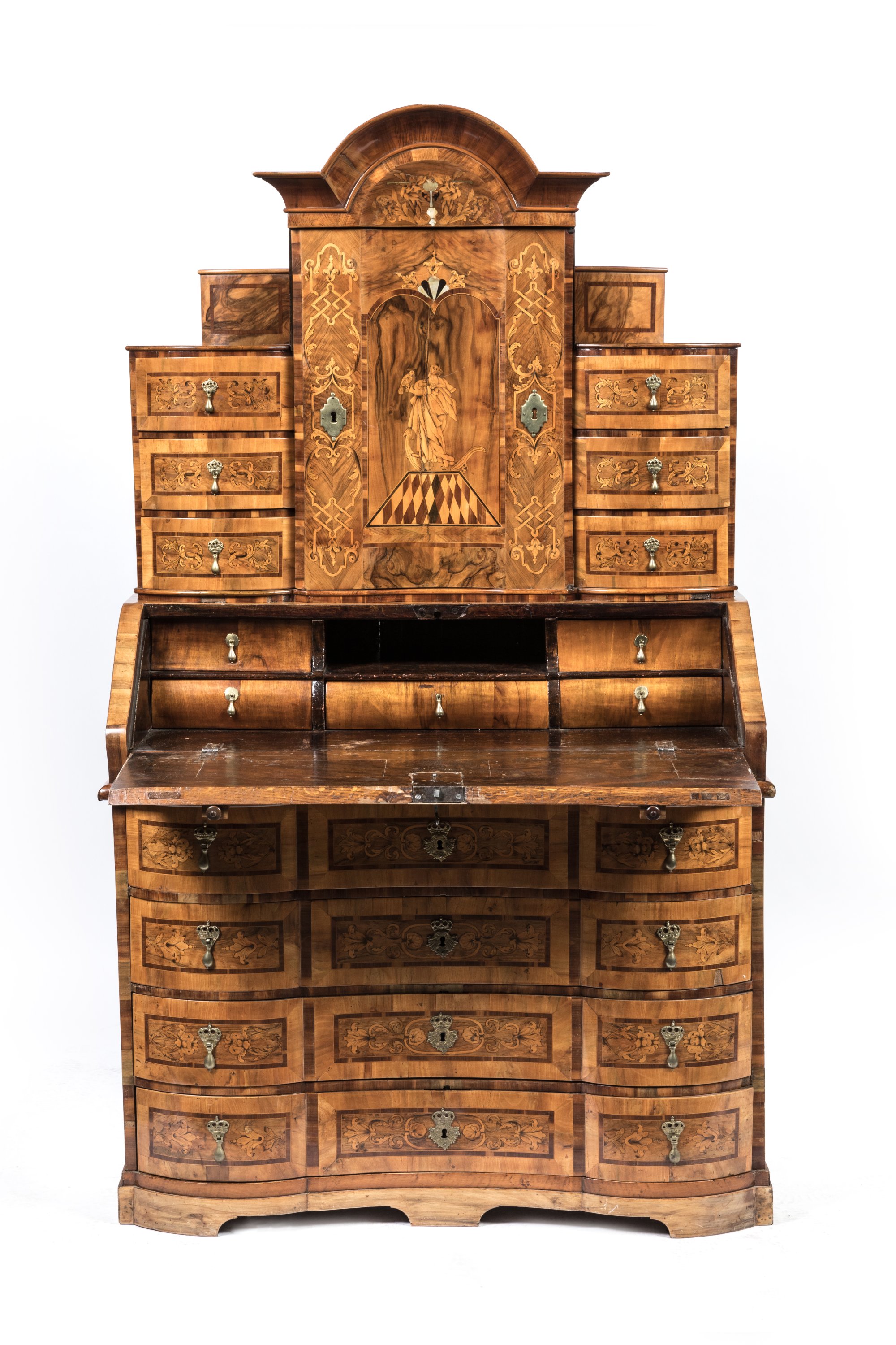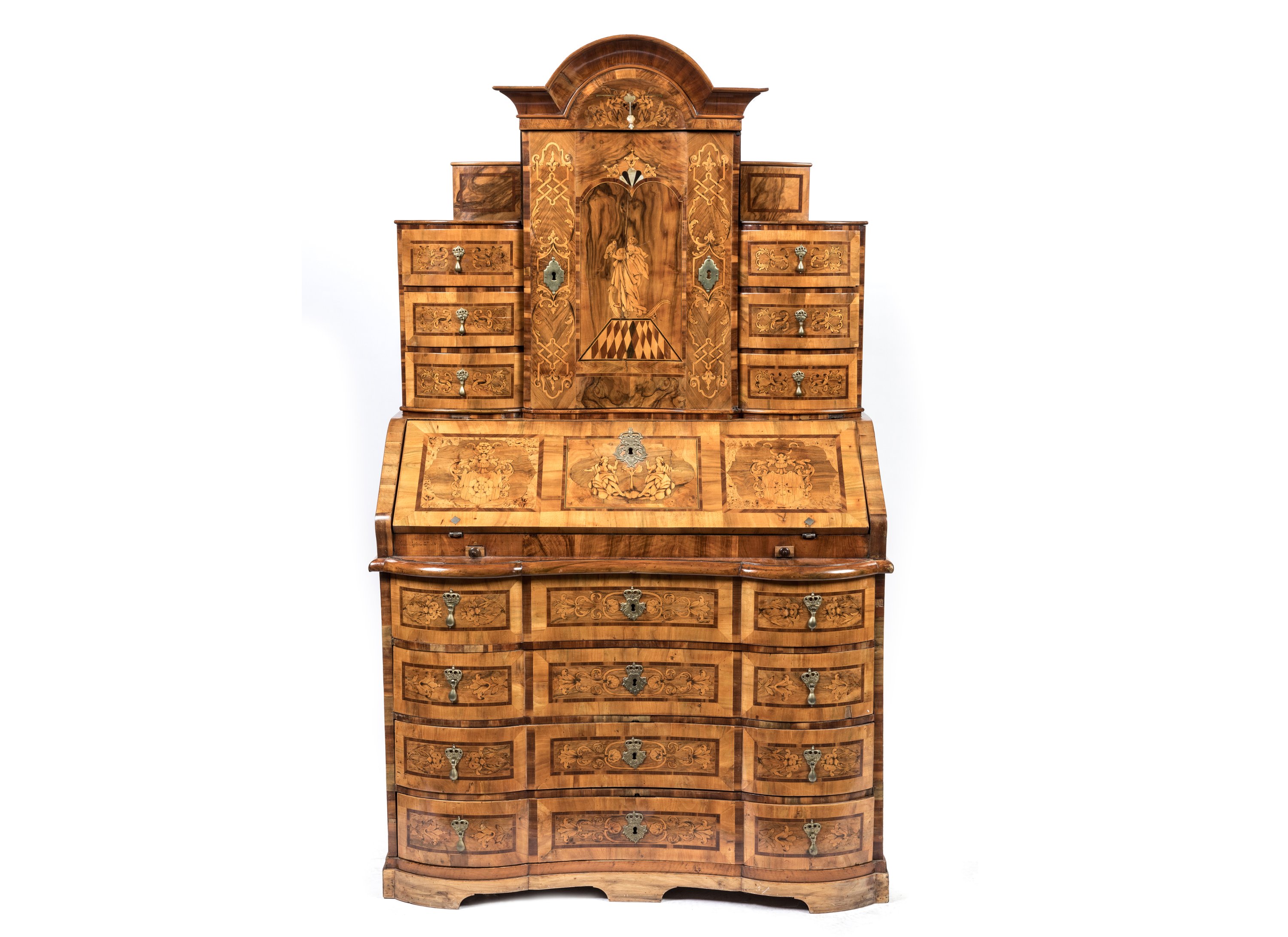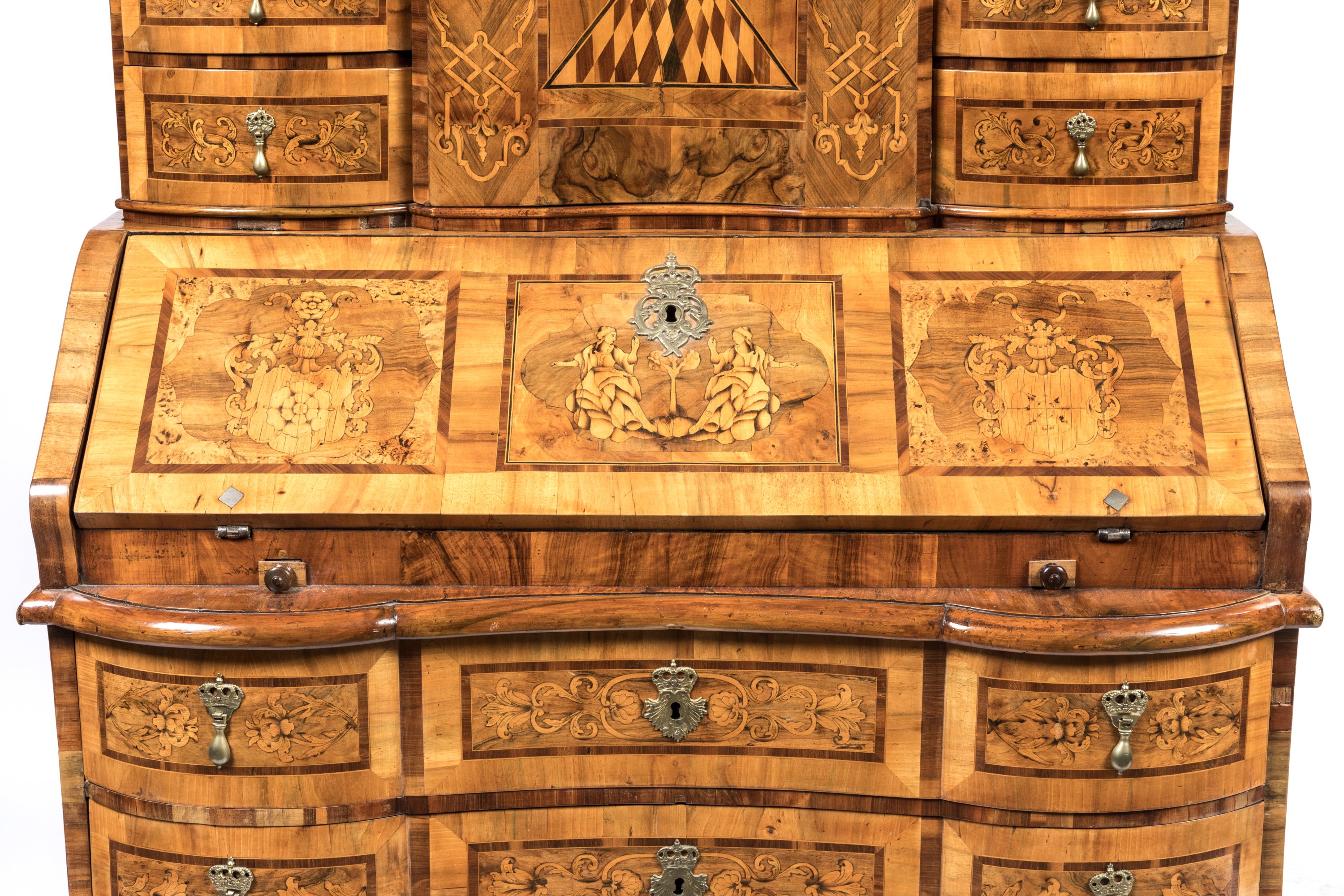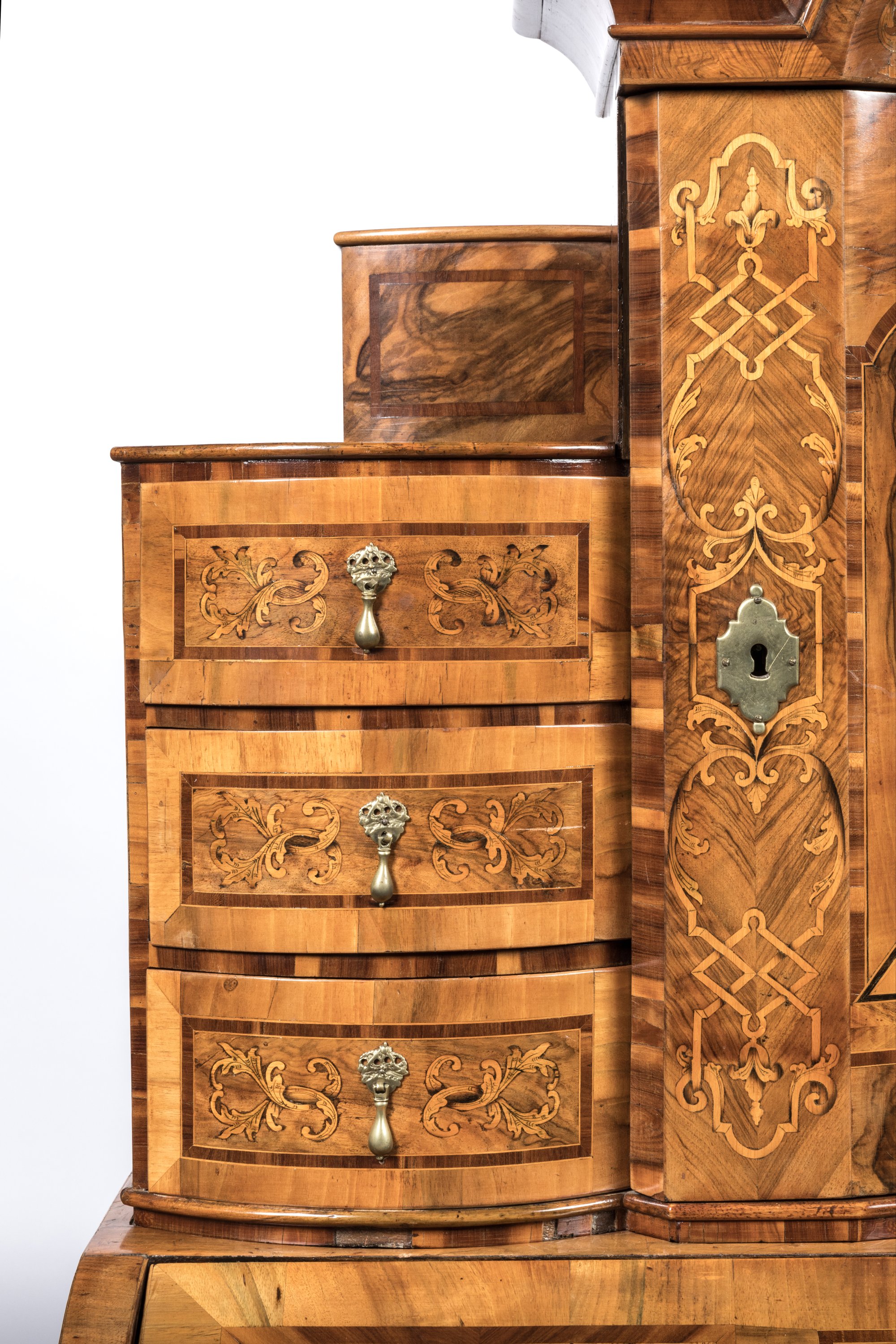 en placage et marqueterie de noyer, prunier, érable, ronce de noyer et nacre. La partie haute est coiffée d'un fronton surmontant un tabernacle décoré d'une femme à l'oiseau et d'une fleur stylisée en marqueterie de nacre. Il ouvre par un vantail entouré de chaque côté de trois tiroirs. L'abattant central est orné de blasons marquetés et découvre cinq tiroirs autour d'une niche centrale. La partie basse s'ouvre par quatre tiroirs sur quatre rangs, chacun décoré de filets et marqueté d'entrelacs et rinceaux feuillagés. Entrées de serrures et poignées en laiton doré à décor de perles baroques et couronnes royales. Serrures à gâches et à ressorts.