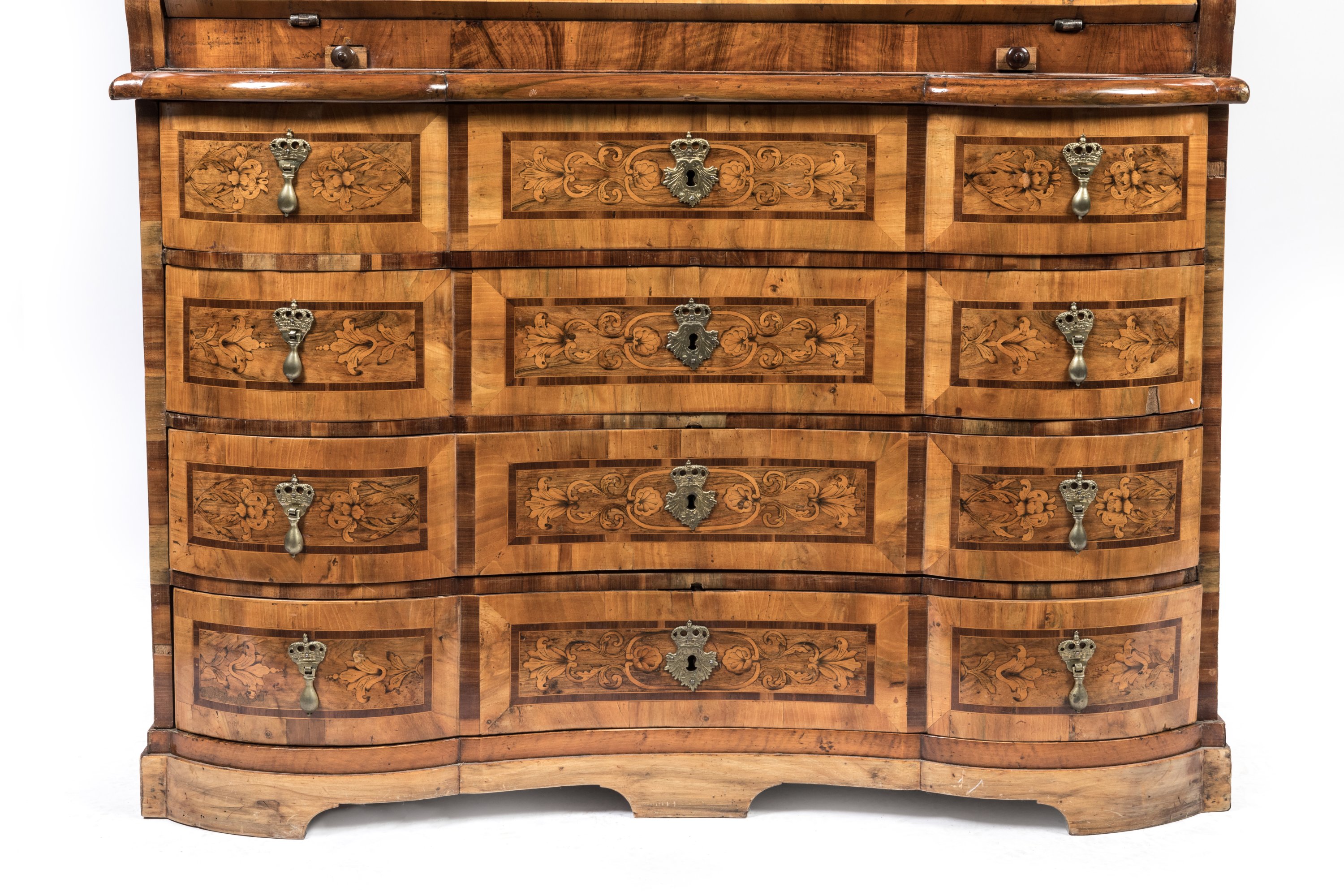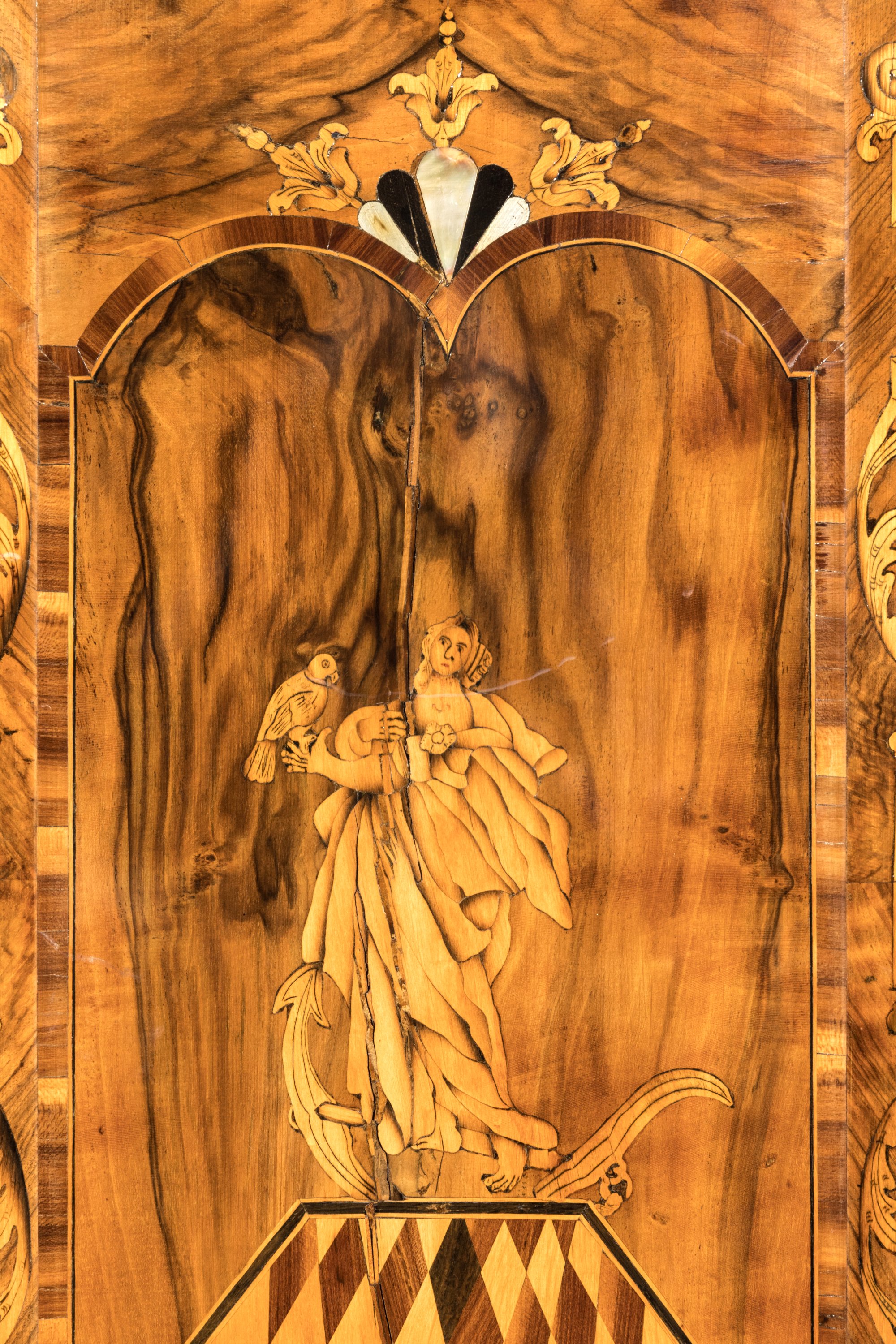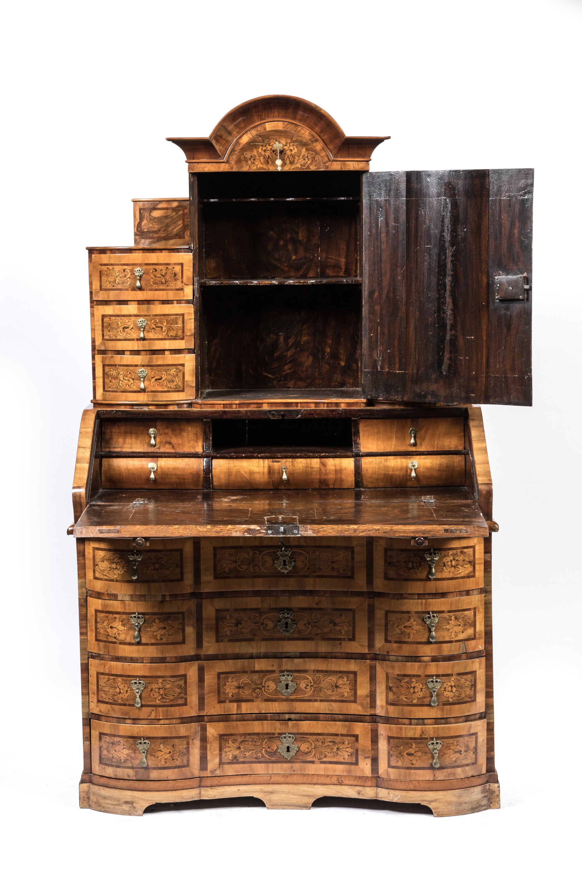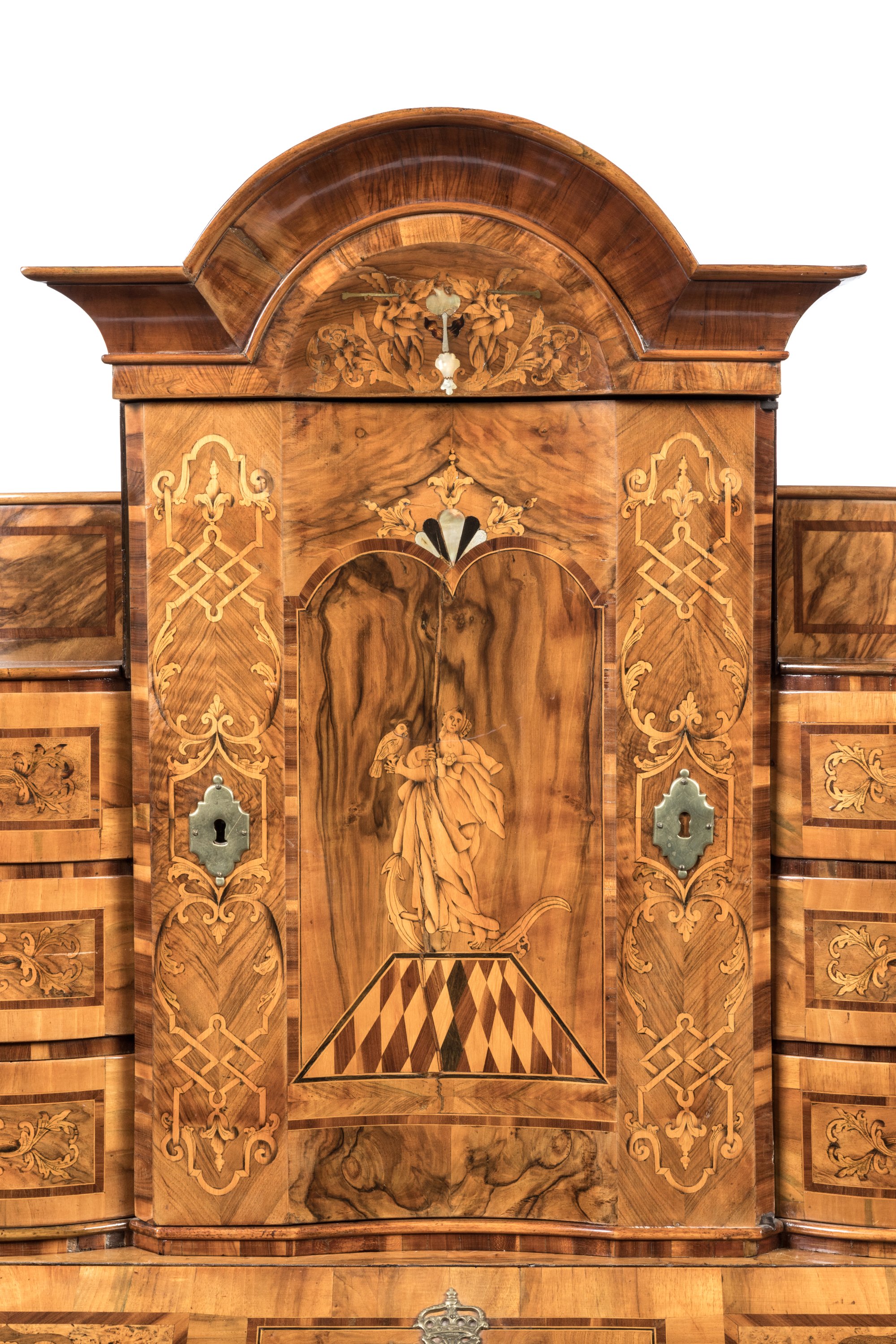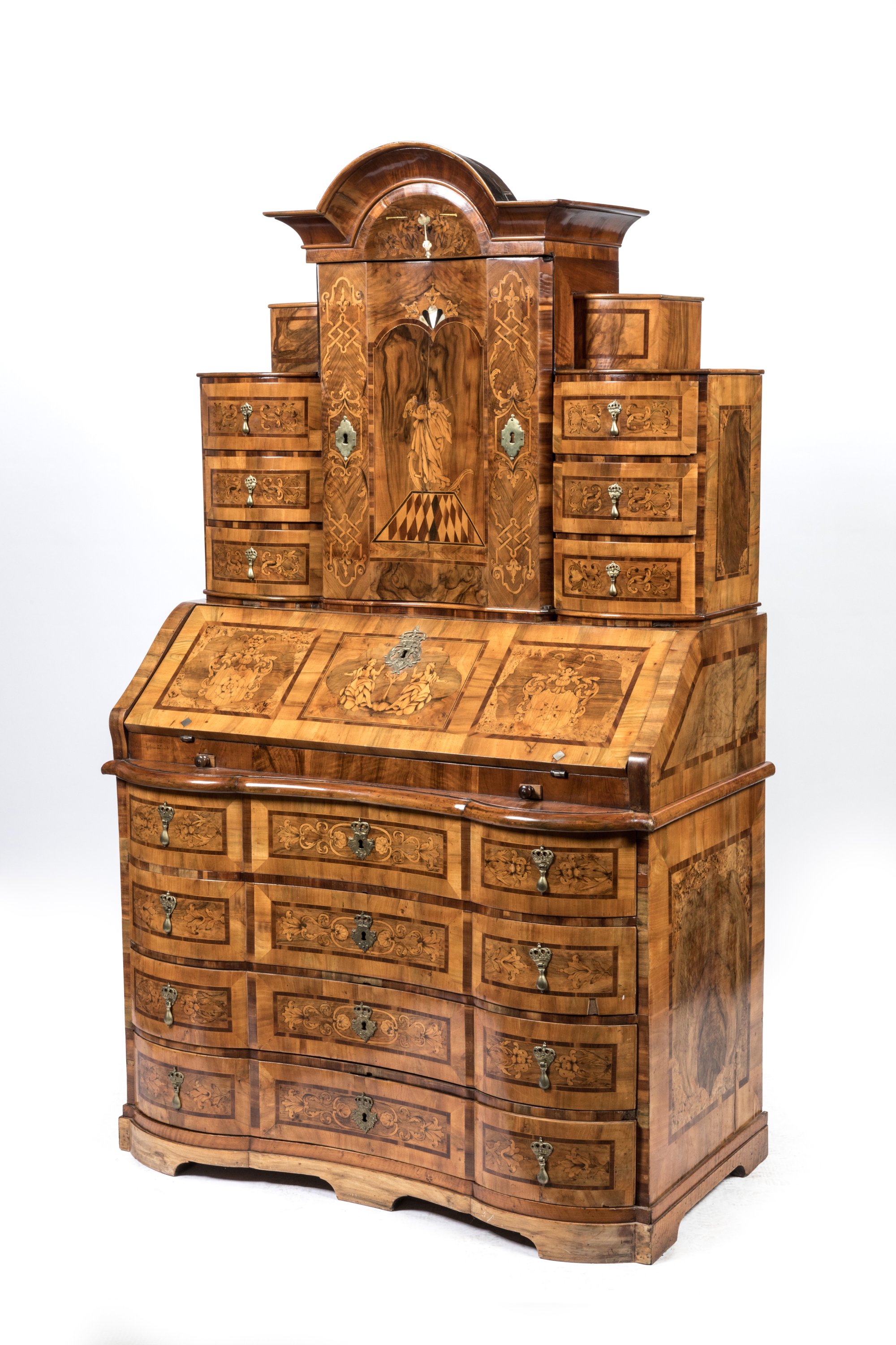 en placage et marqueterie de noyer, prunier, érable, ronce de noyer et nacre. La partie haute est coiffée d'un fronton surmontant un tabernacle décoré d'une femme à l'oiseau et d'une fleur stylisée en marqueterie de nacre. Il ouvre par un vantail entouré de chaque côté de trois tiroirs. L'abattant central est orné de blasons marquetés et découvre cinq tiroirs autour d'une niche centrale. La partie basse s'ouvre par quatre tiroirs sur quatre rangs, chacun décoré de filets et marqueté d'entrelacs et rinceaux feuillagés. Entrées de serrures et poignées en laiton doré à décor de perles baroques et couronnes royales. Serrures à gâches et à ressorts.