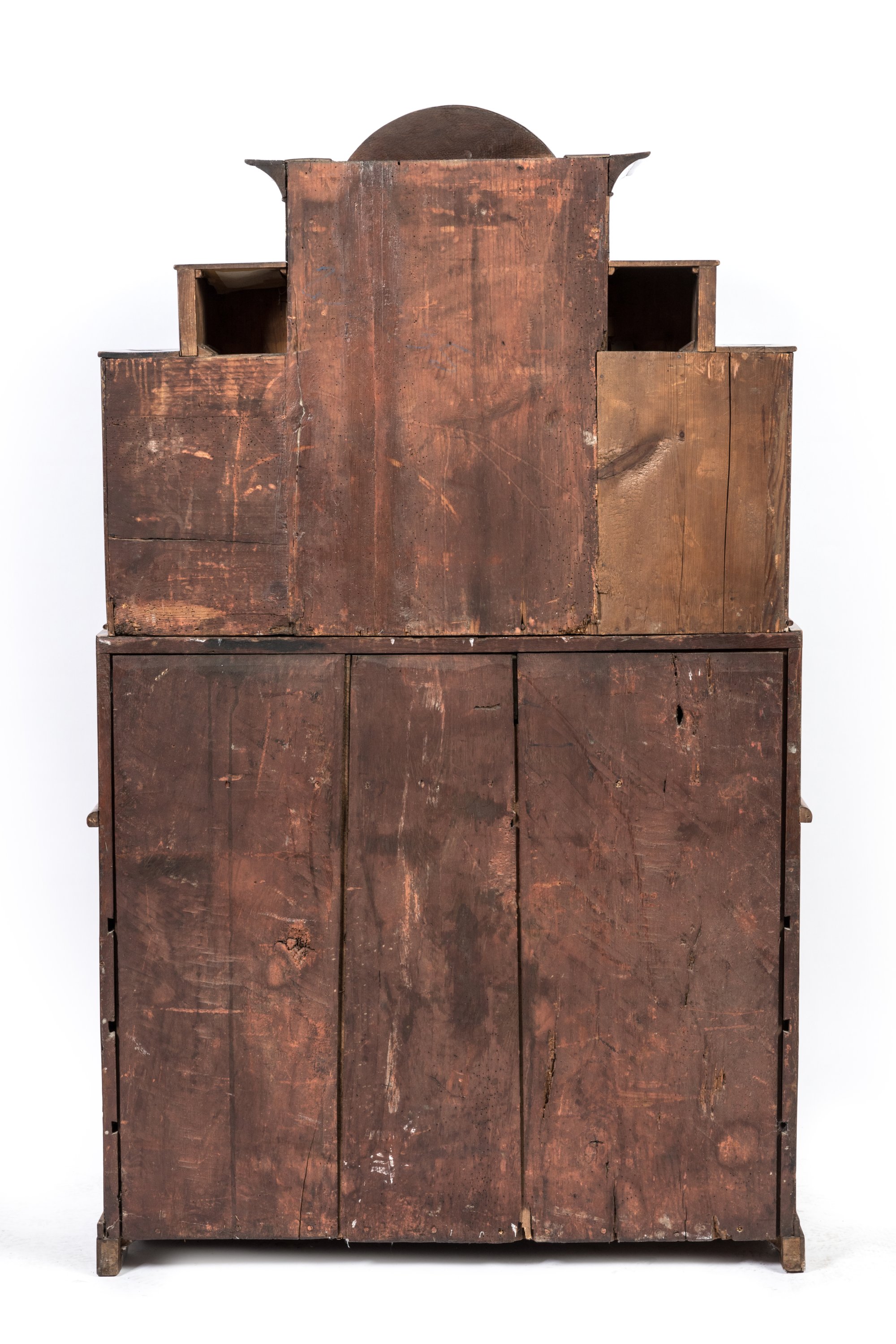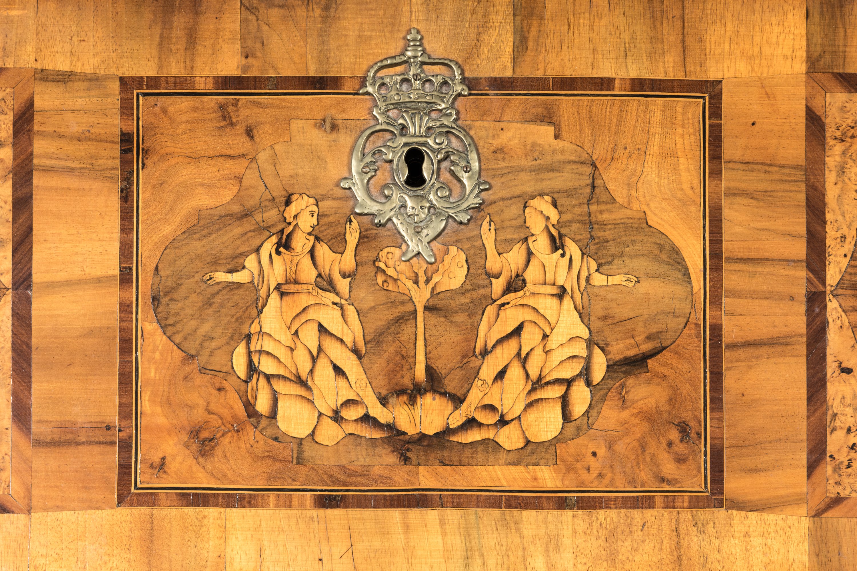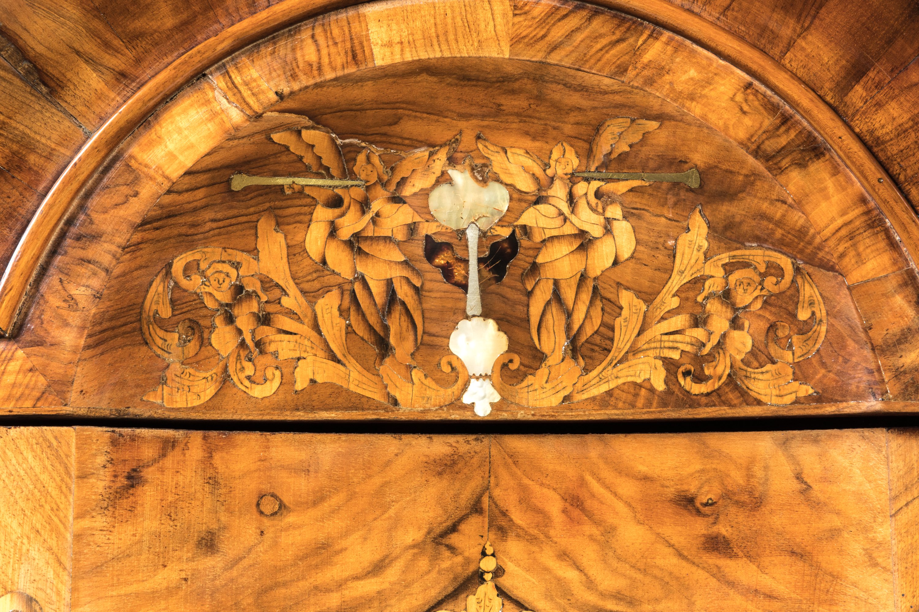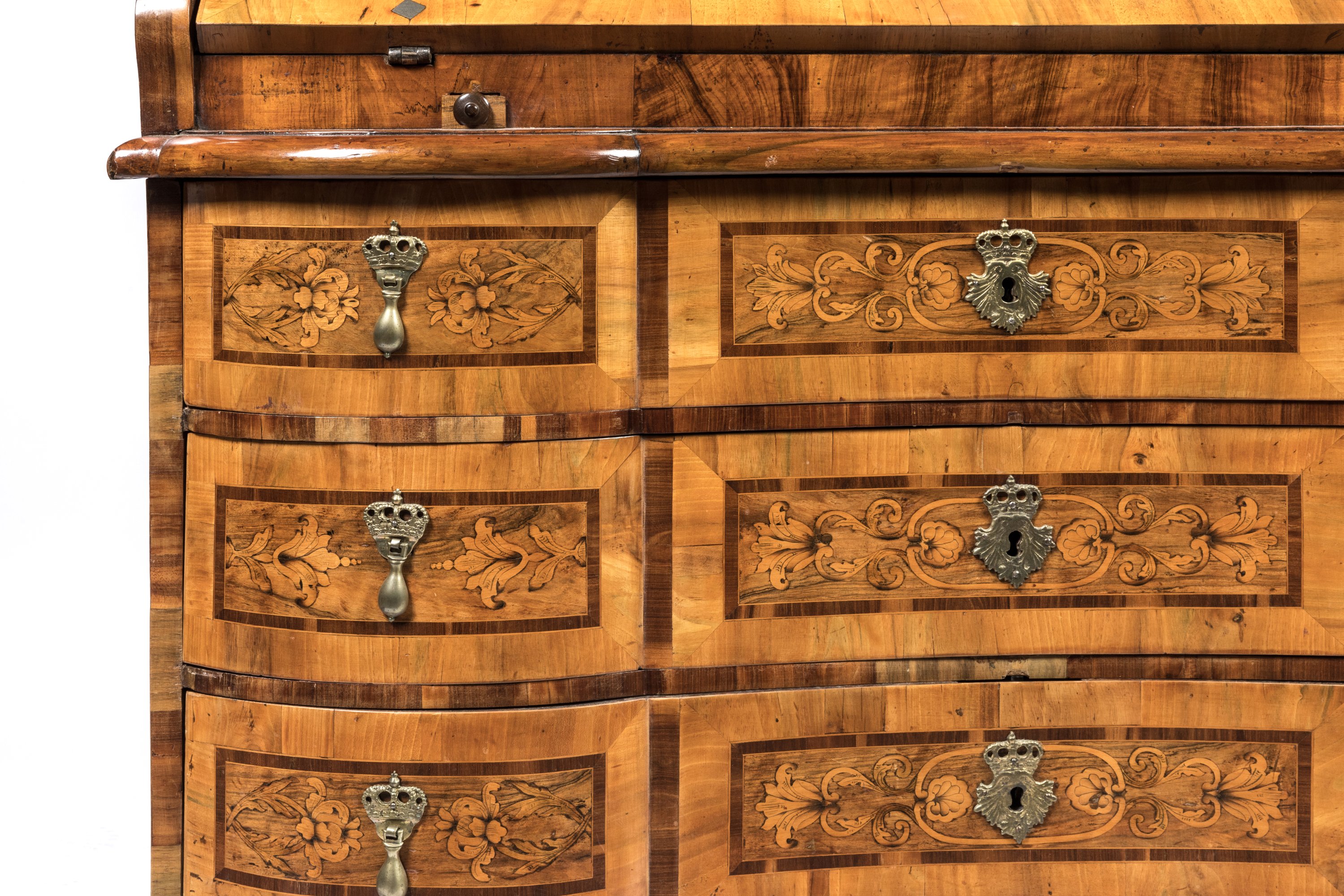 en placage et marqueterie de noyer, prunier, érable, ronce de noyer et nacre. La partie haute est coiffée d'un fronton surmontant un tabernacle décoré d'une femme à l'oiseau et d'une fleur stylisée en marqueterie de nacre. Il ouvre par un vantail entouré de chaque côté de trois tiroirs. L'abattant central est orné de blasons marquetés et découvre cinq tiroirs autour d'une niche centrale. La partie basse s'ouvre par quatre tiroirs sur quatre rangs, chacun décoré de filets et marqueté d'entrelacs et rinceaux feuillagés. Entrées de serrures et poignées en laiton doré à décor de perles baroques et couronnes royales. Serrures à gâches et à ressorts.