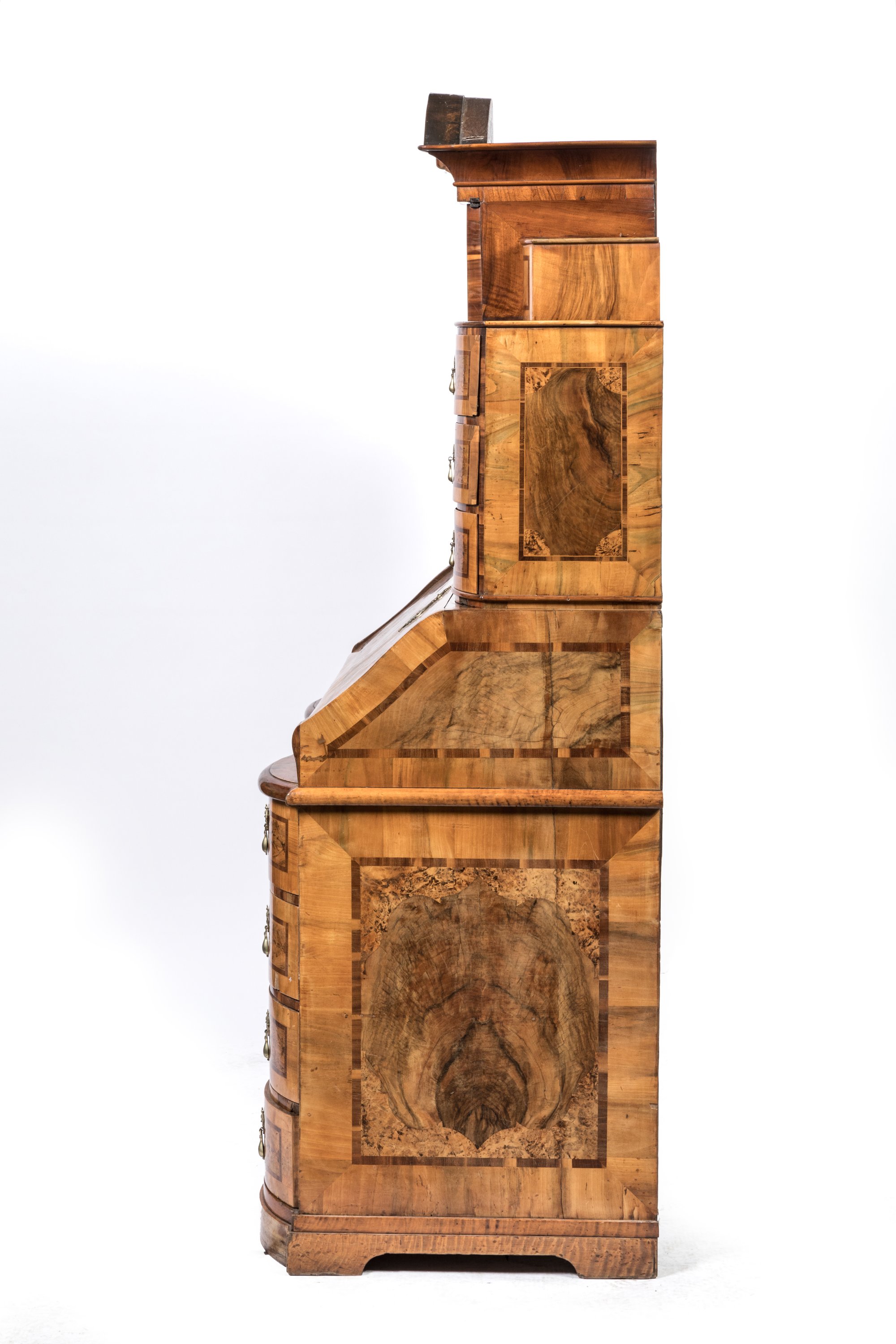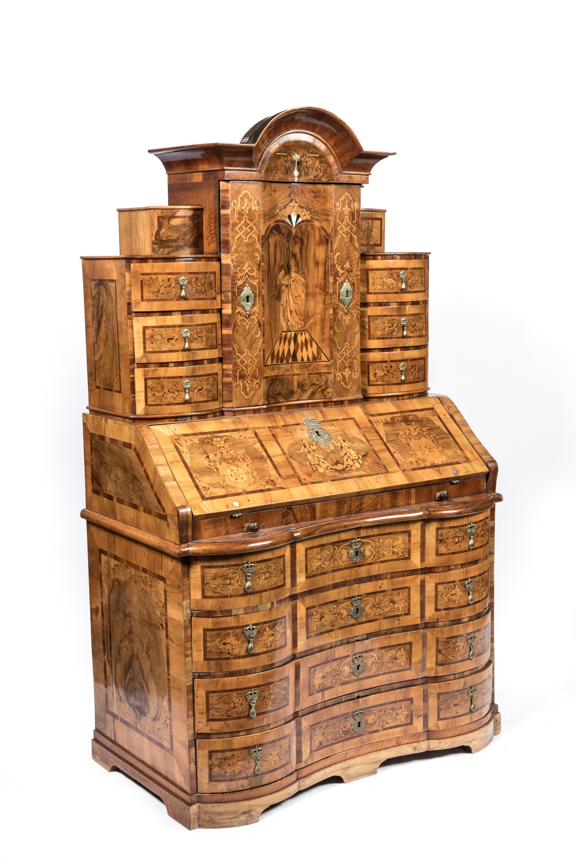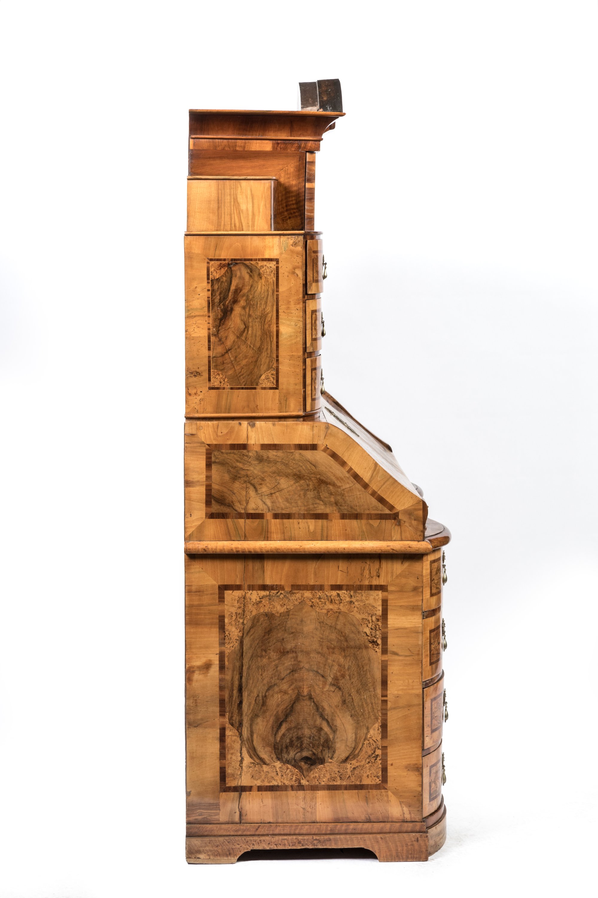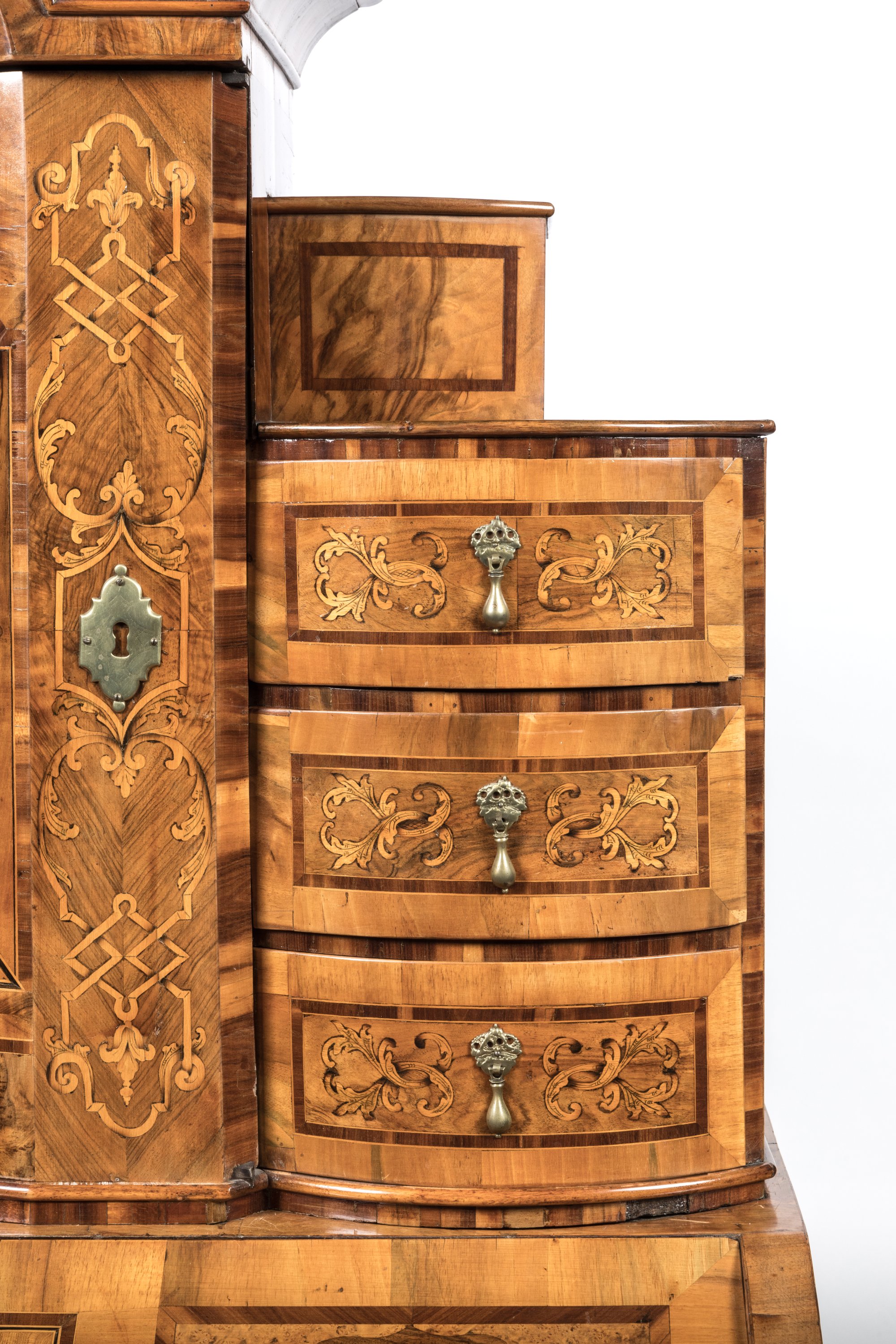 Austrian, 18th century. A two-part tabernacle secretaire with walnut, plum and maple tree veneer and mother-of-pearl inlays. Brass mounts and spring locks.