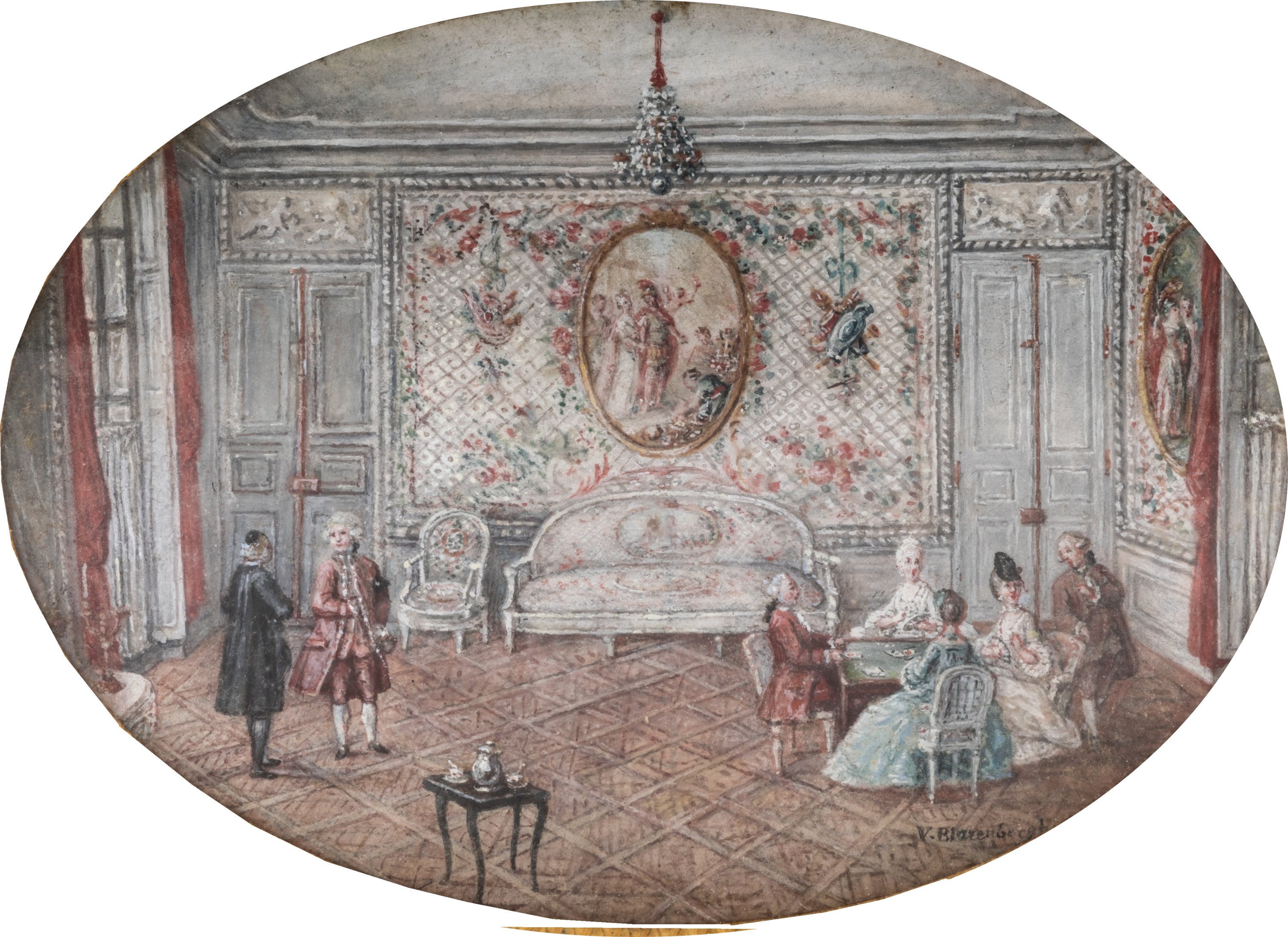 Labbé Barthélémy, auteur du Voyage du jeune Anacharsis en Grèce, pourrait être le personnage à gauche, tandis que la Duchesse de Choiseul serait représentée à la table de jeu à droite avec des amis. La tapisserie à alentours sur les murs de la pièce a probablement été tissée à la manufacture royale des Gobelins dans le troisième tiers du XVIIIe siècle. Elle présenterait un décor mythologique dans un médaillon, sur contre-fond damassé, rinceaux, guirlandes de fleurs et trophées guerriers.