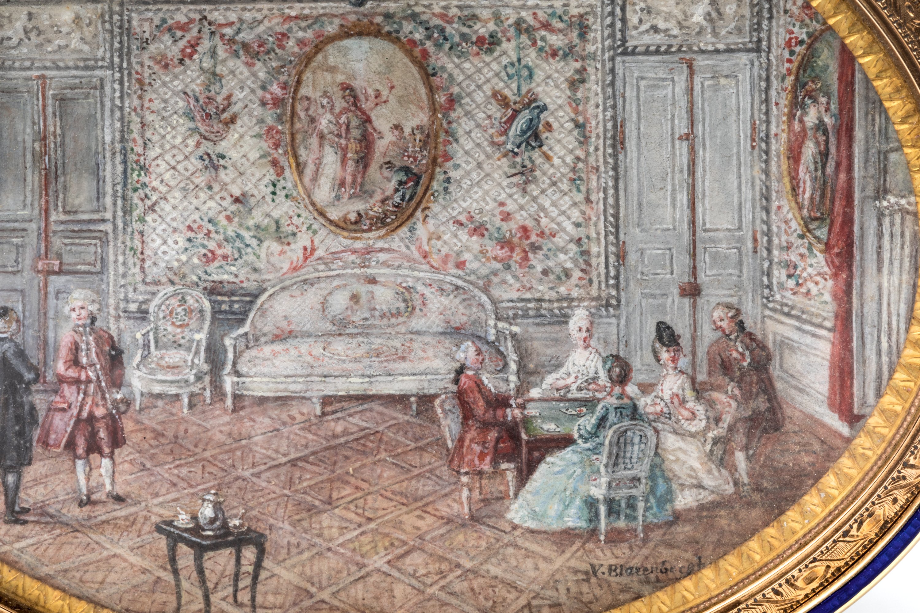 French, 18th century. A miniature painting by Louis-Nicolas Van Blarenberghe depicting gentlemen and ladies playing cards.