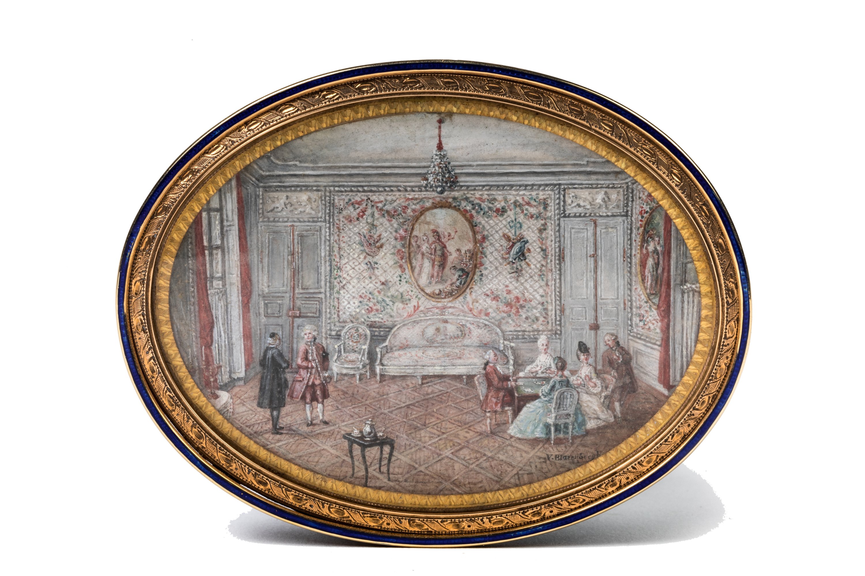 On peut rapprocher notre miniature, probable ancien couvercle dune boite ou tabatière, de celle représentant la chambre dapparat du Duc de Choiseul à lhôtel Crozat à Paris (musée du Louvre, OA 2281), notamment pour sa représentation du parquet de Versailles, que lon retrouve également sur la vue de lappartement ministériel du Duc sur la tabatière récemment acquise par le Louvre.