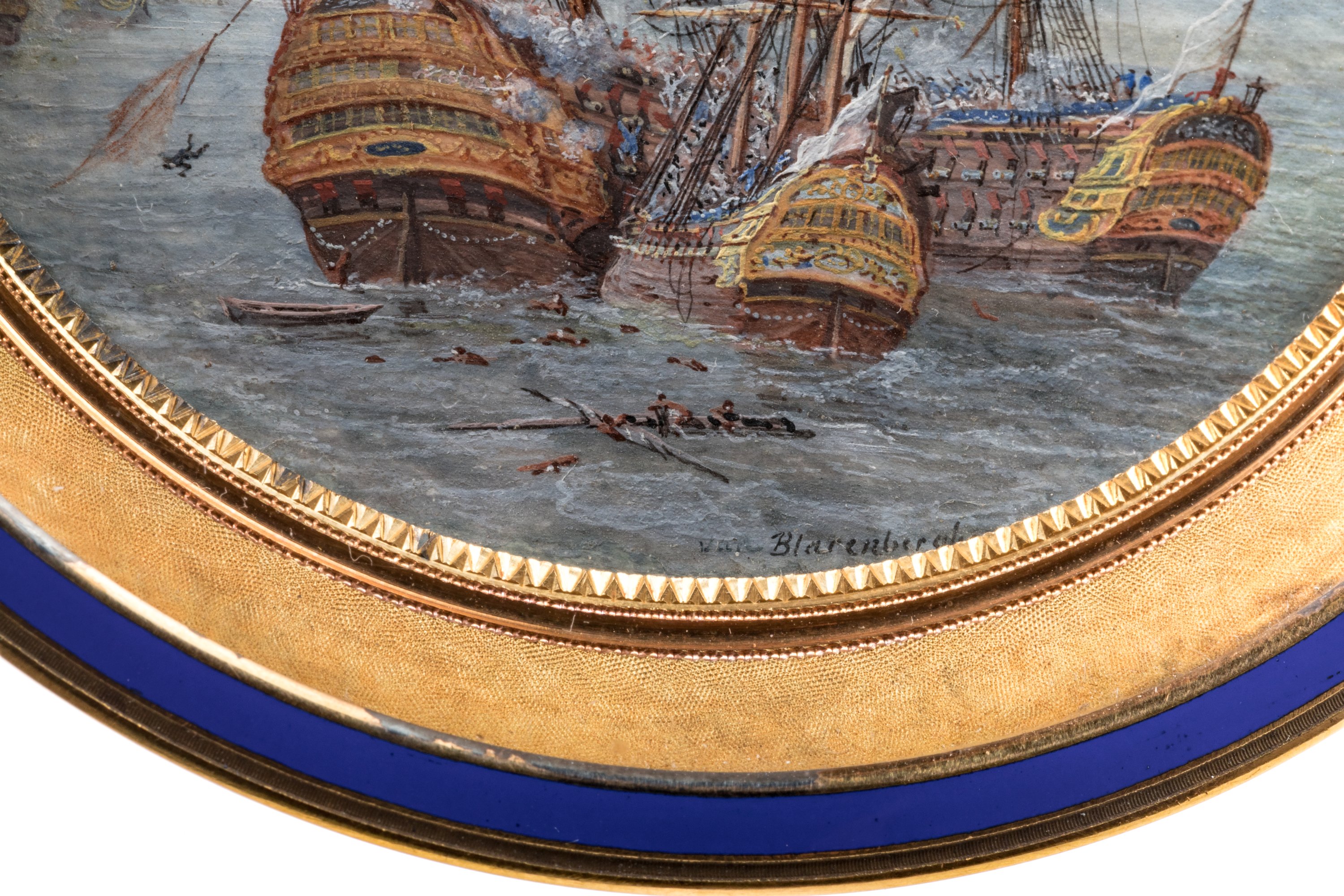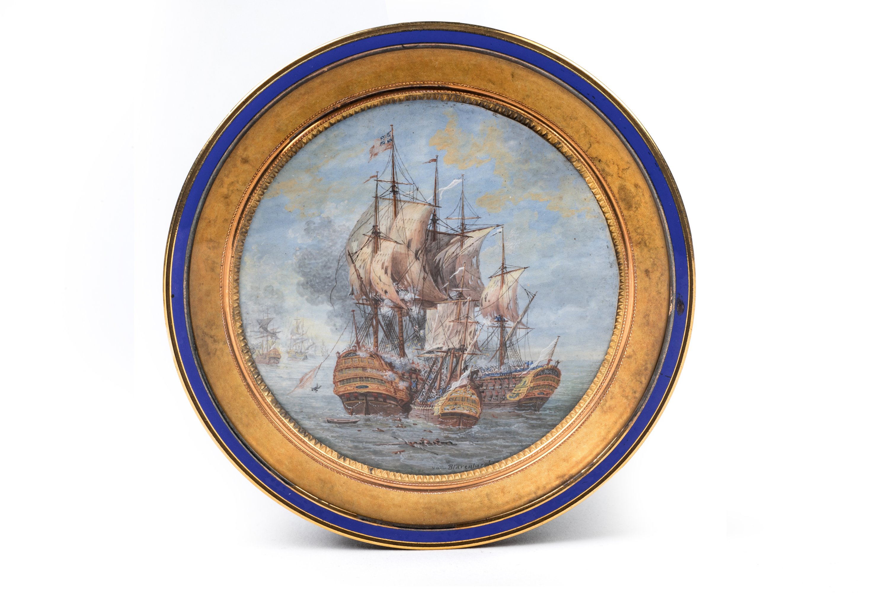 A gouache and watercolor tondo by Louis-Nicolas Van Blarenberghe depicting a sea battle. In a fine enameled frame.
