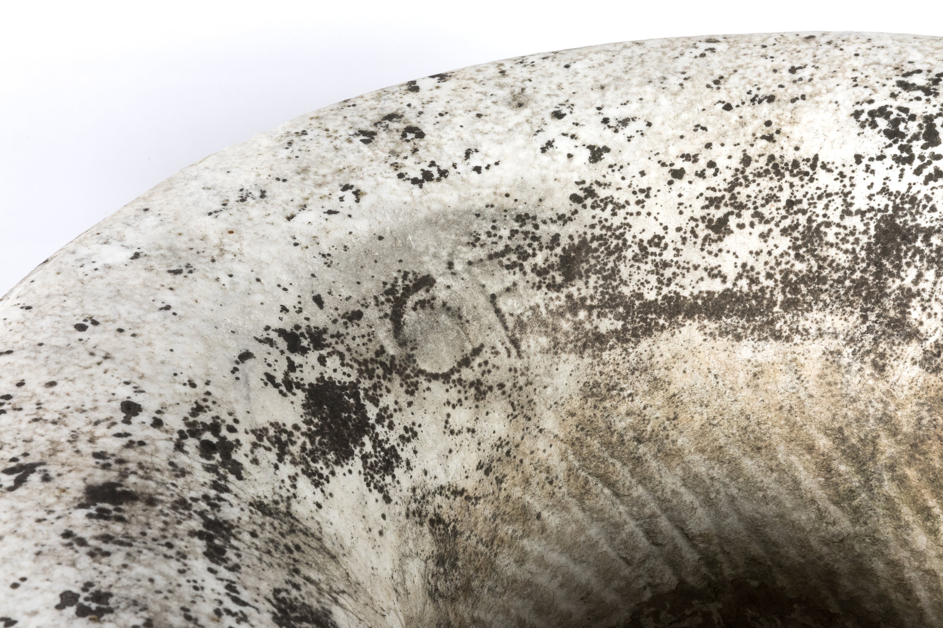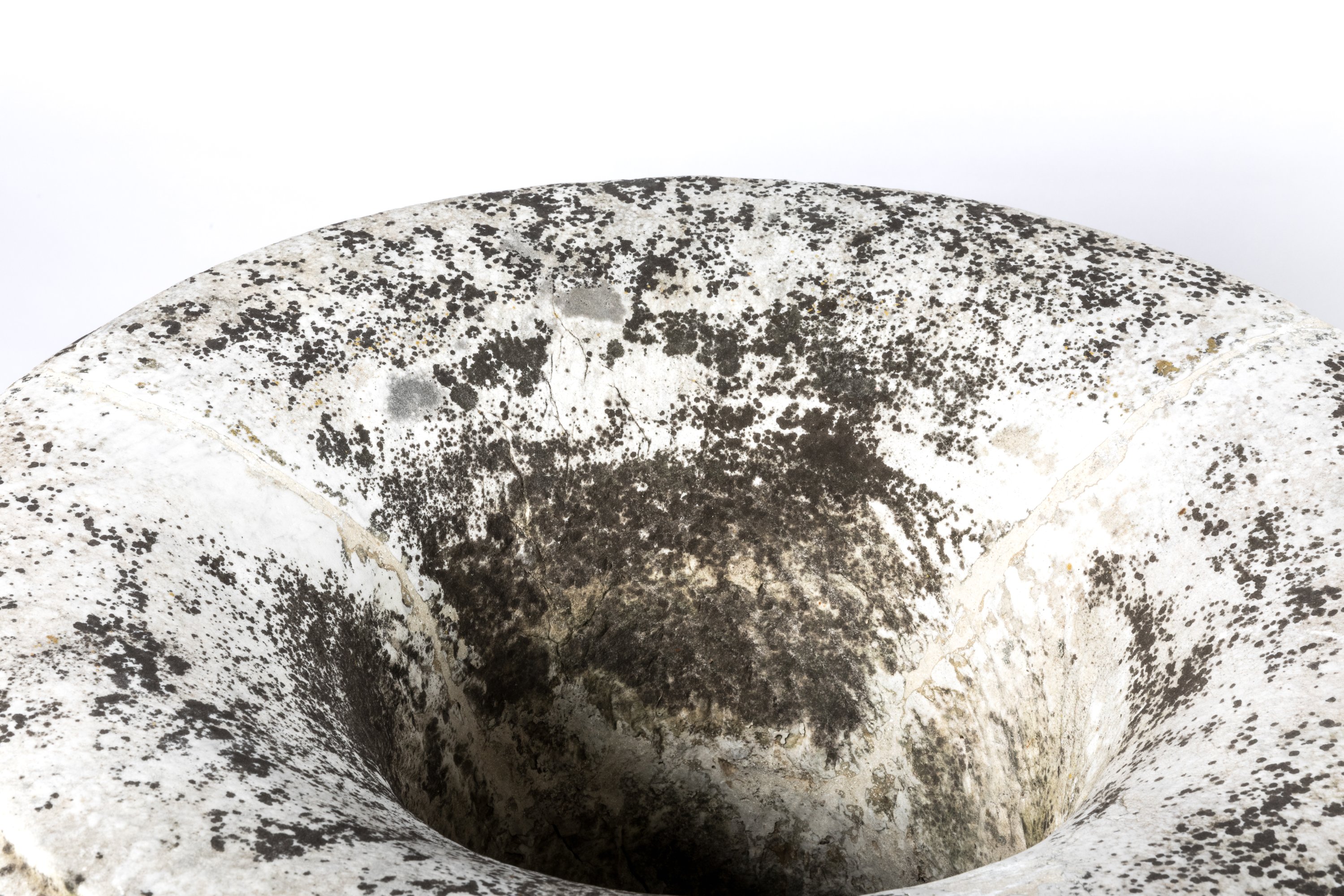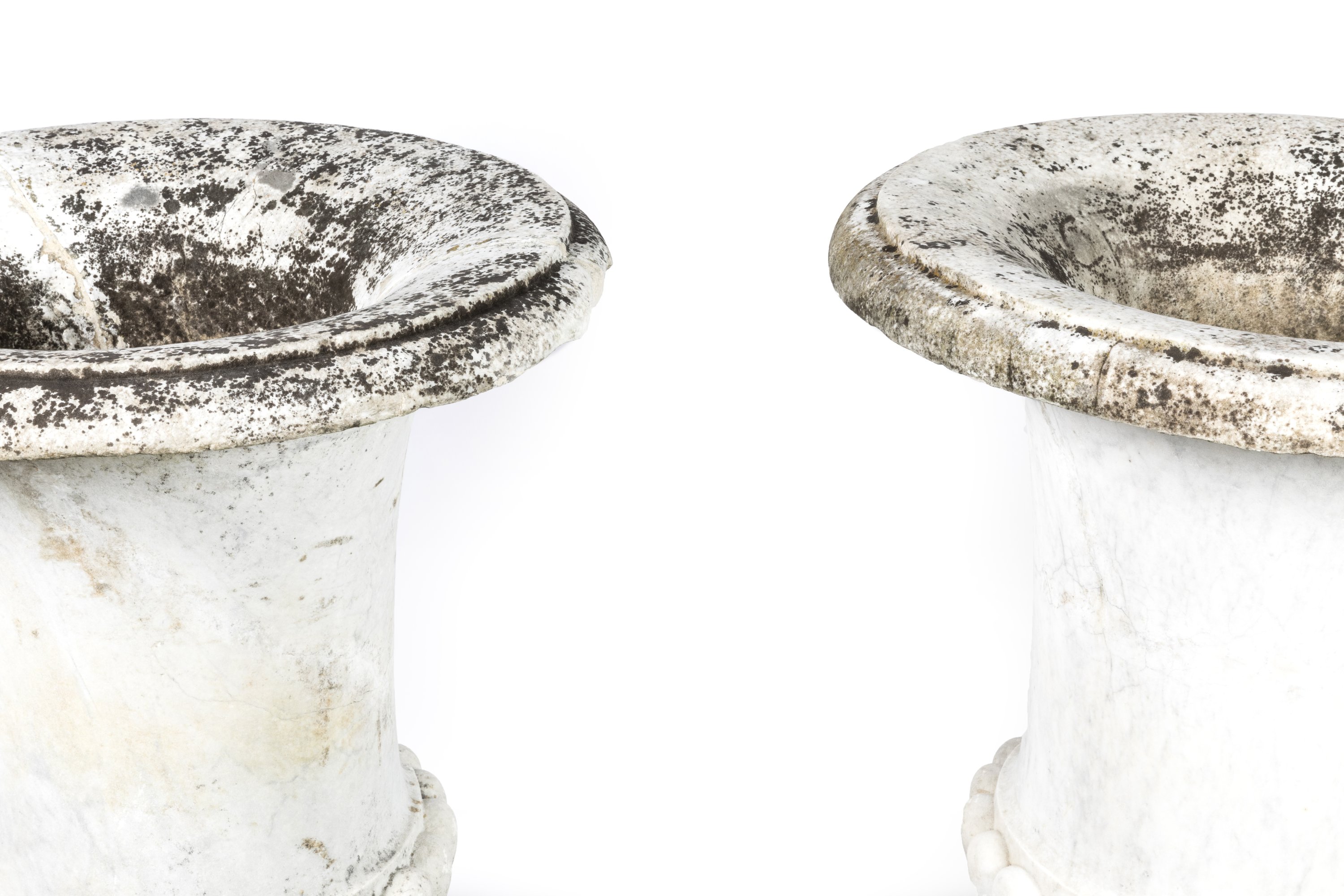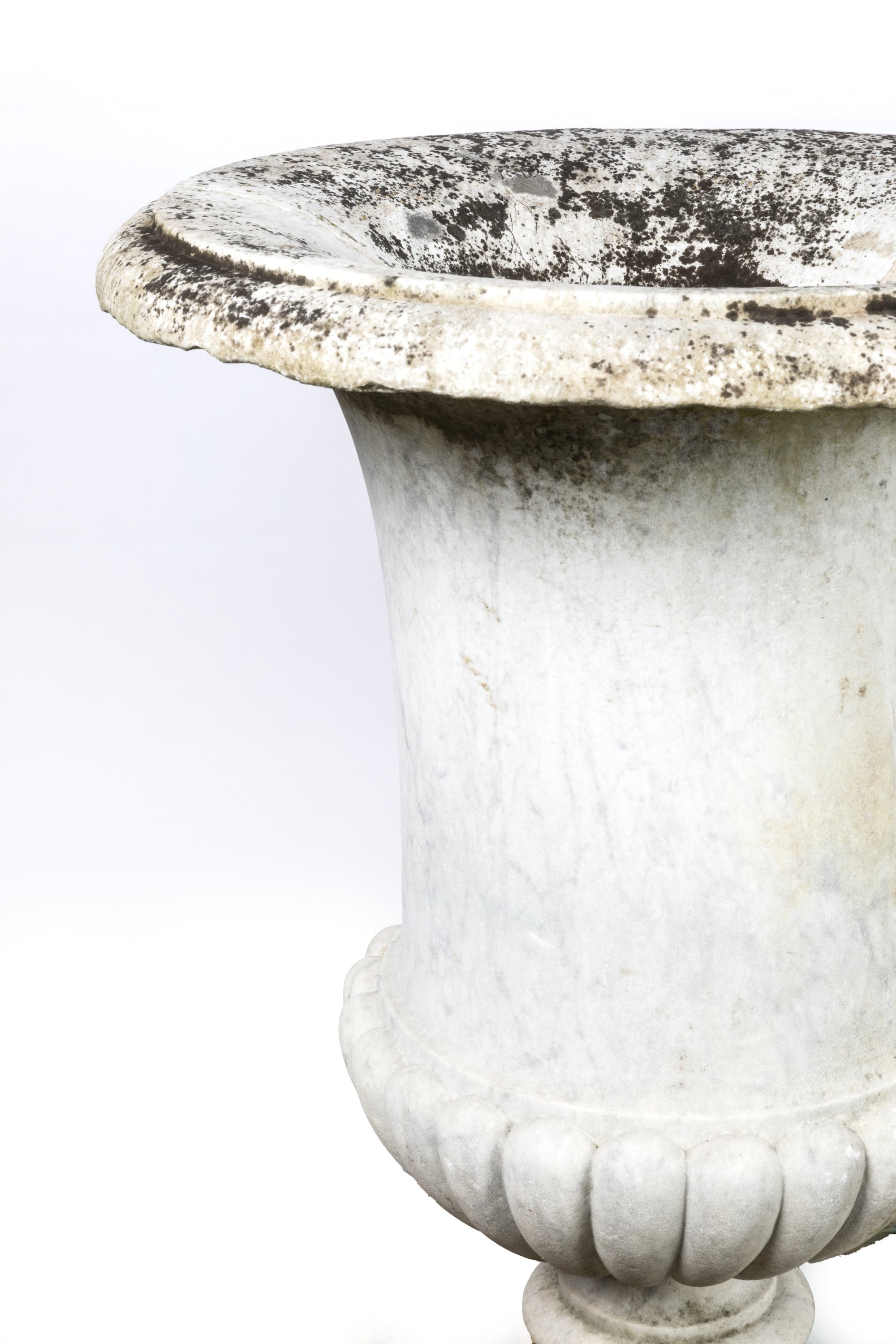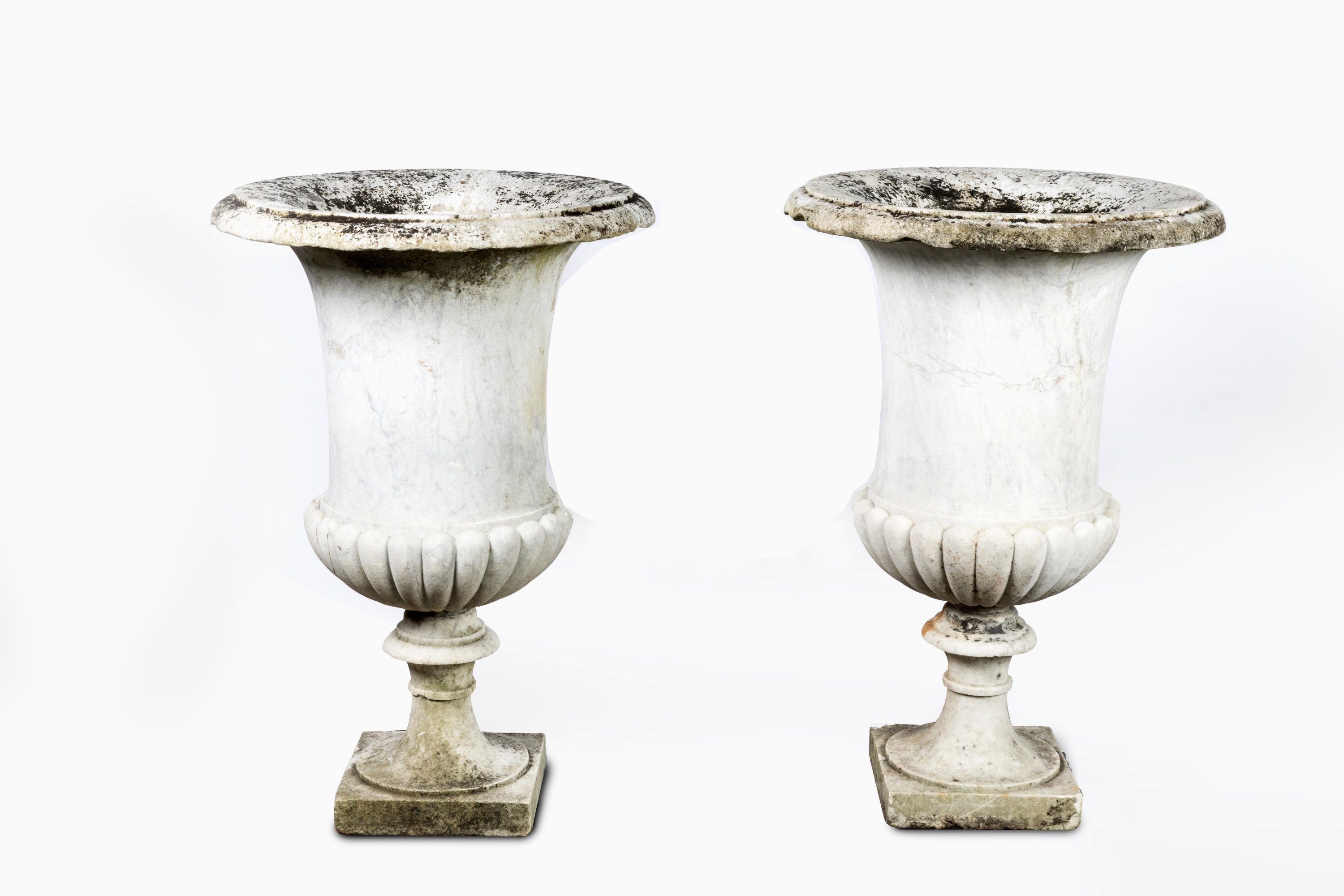 en marbre sculpté en ronde bosse. La lèvre évasée coiffant une panse cintrée décorée de godrons en partie inférieure. Chacun repose sur un piédouche mouluré complété par des socles carrés.