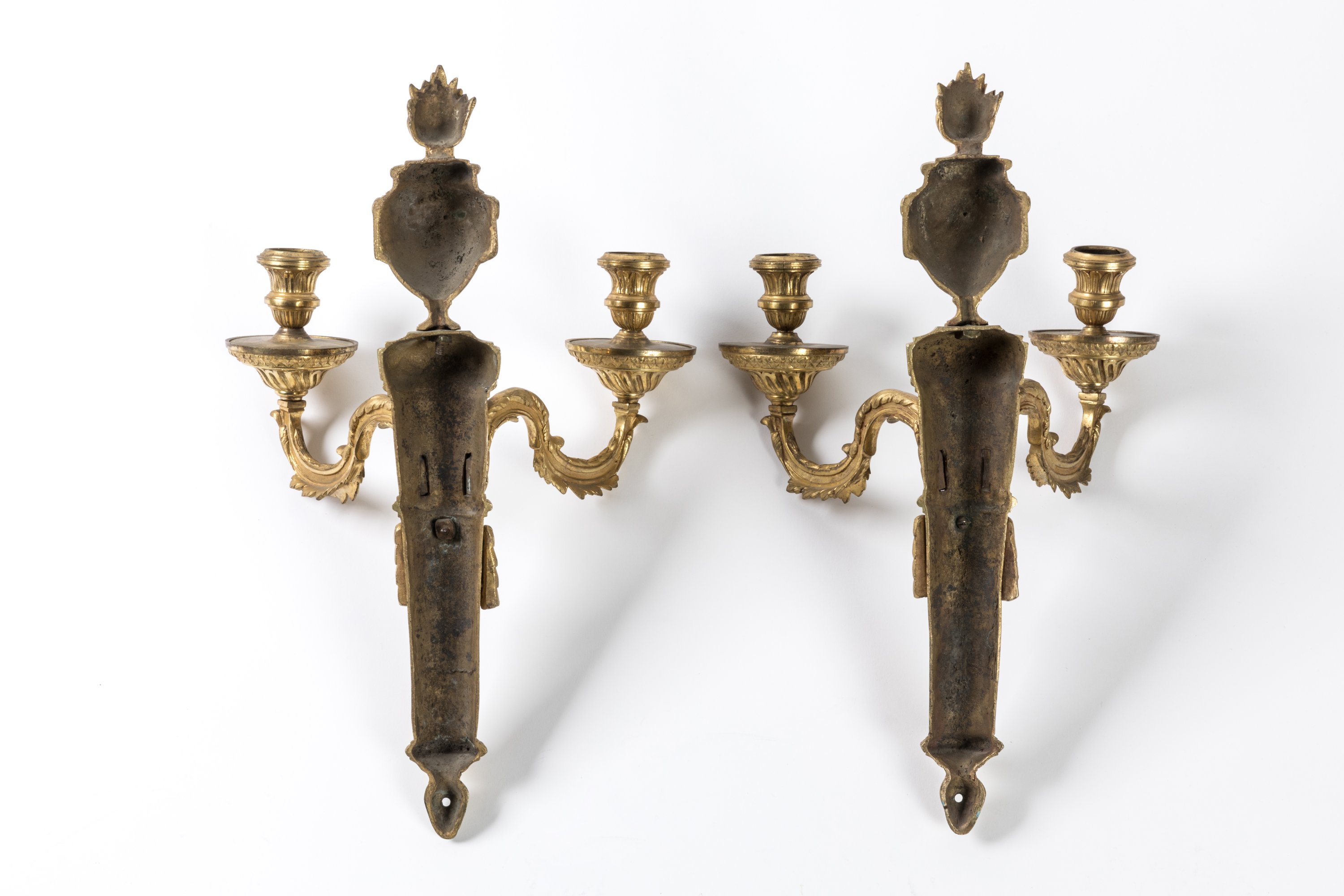en bronze doré, ciselé, bruni et amati à deux bras de lumière. Elles sont coiffées de pots à feu décorés de draperies reposant sur une frise d'entrelacs de feuilles d'eau. Les deux bras de lumière mouvementés décorés de feuilles d'acanthe, le fût en forme de carquois fuselé, cannelé et rudenté est orné d'une guirlande de feuilles. L'ensemble est terminé par une graine.