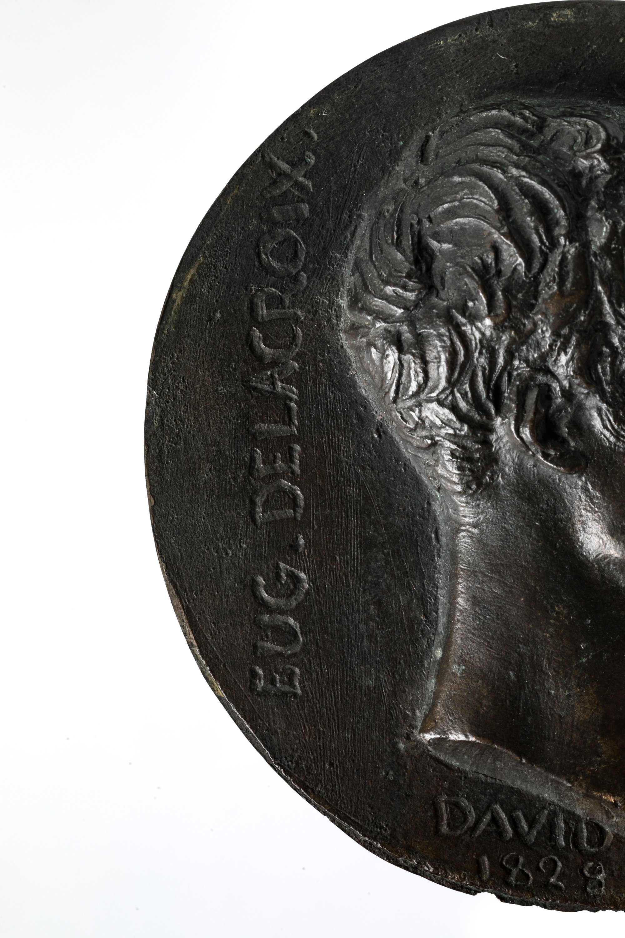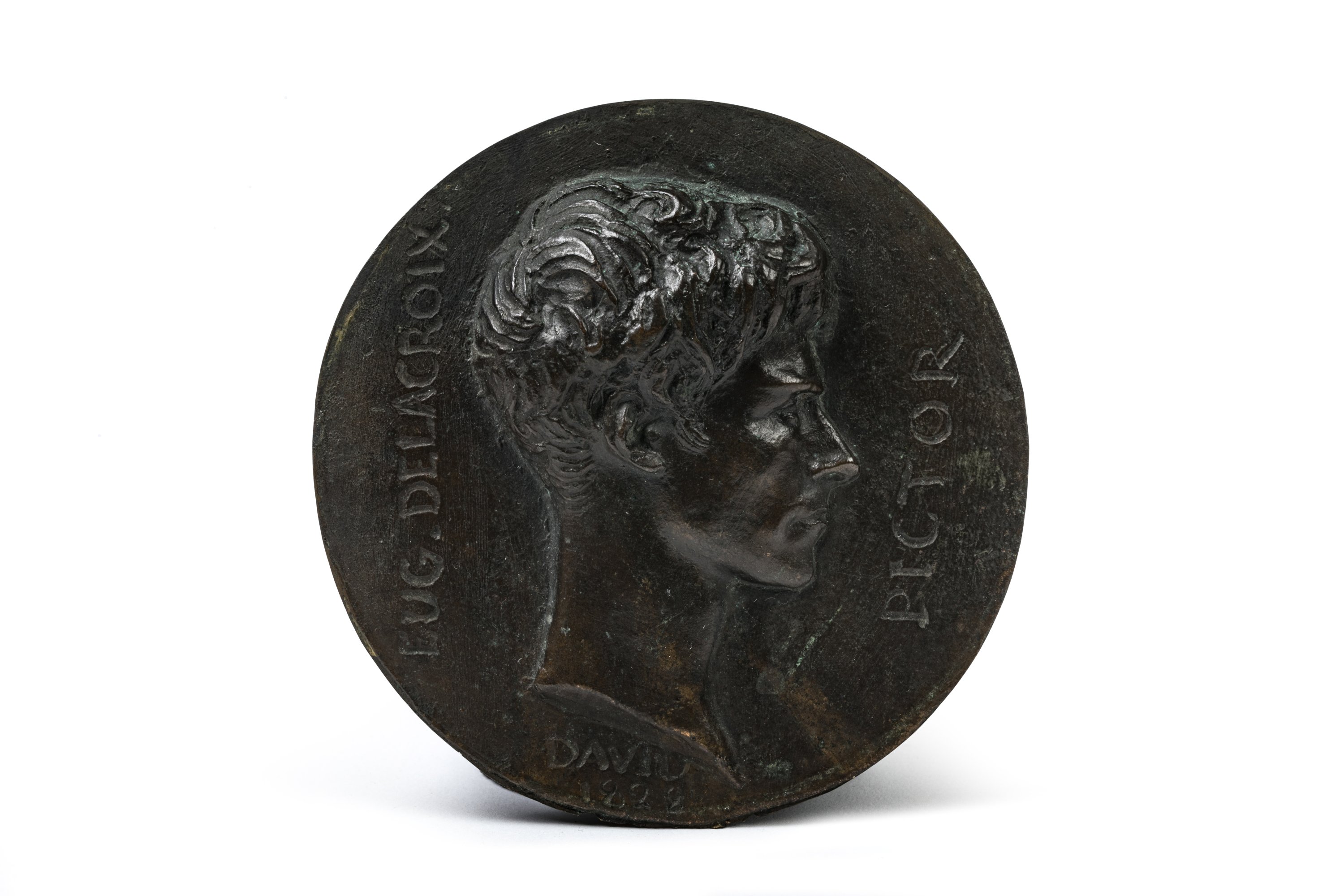 An 1828 bronze medal by Pierre Jean David d'Angers depicting Eugene Delacroix. Signed and dated.
