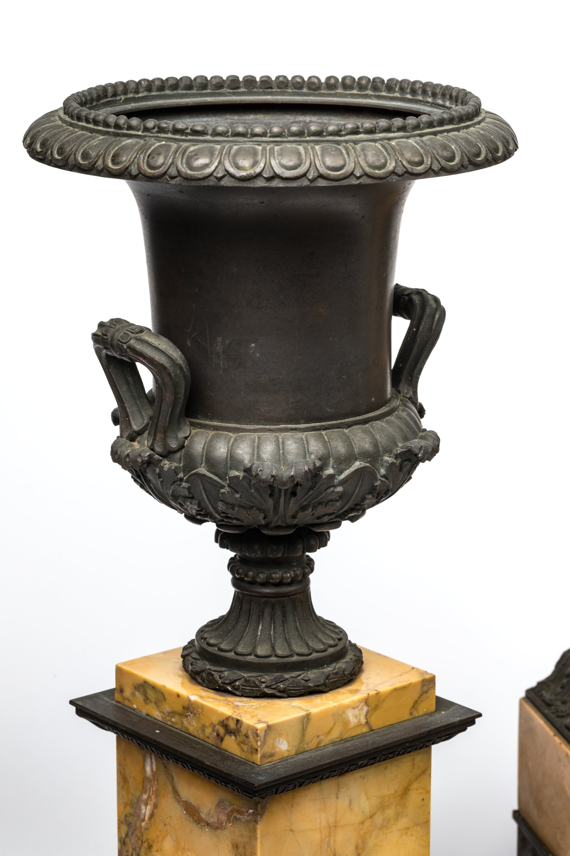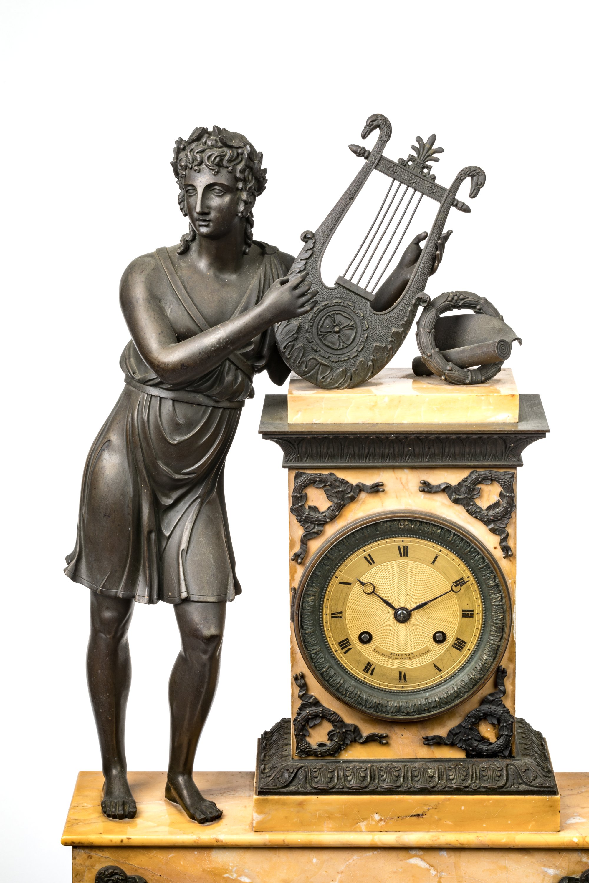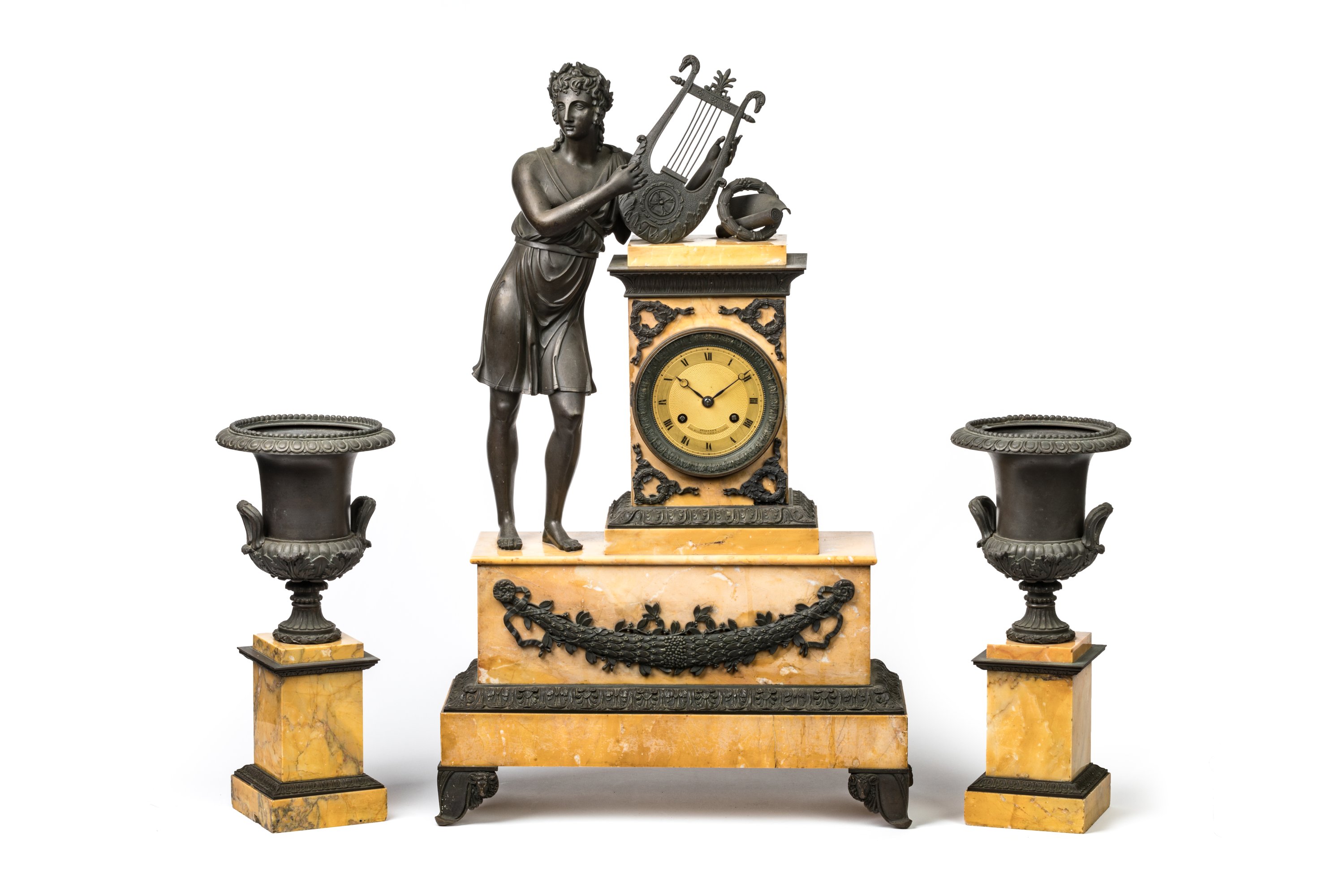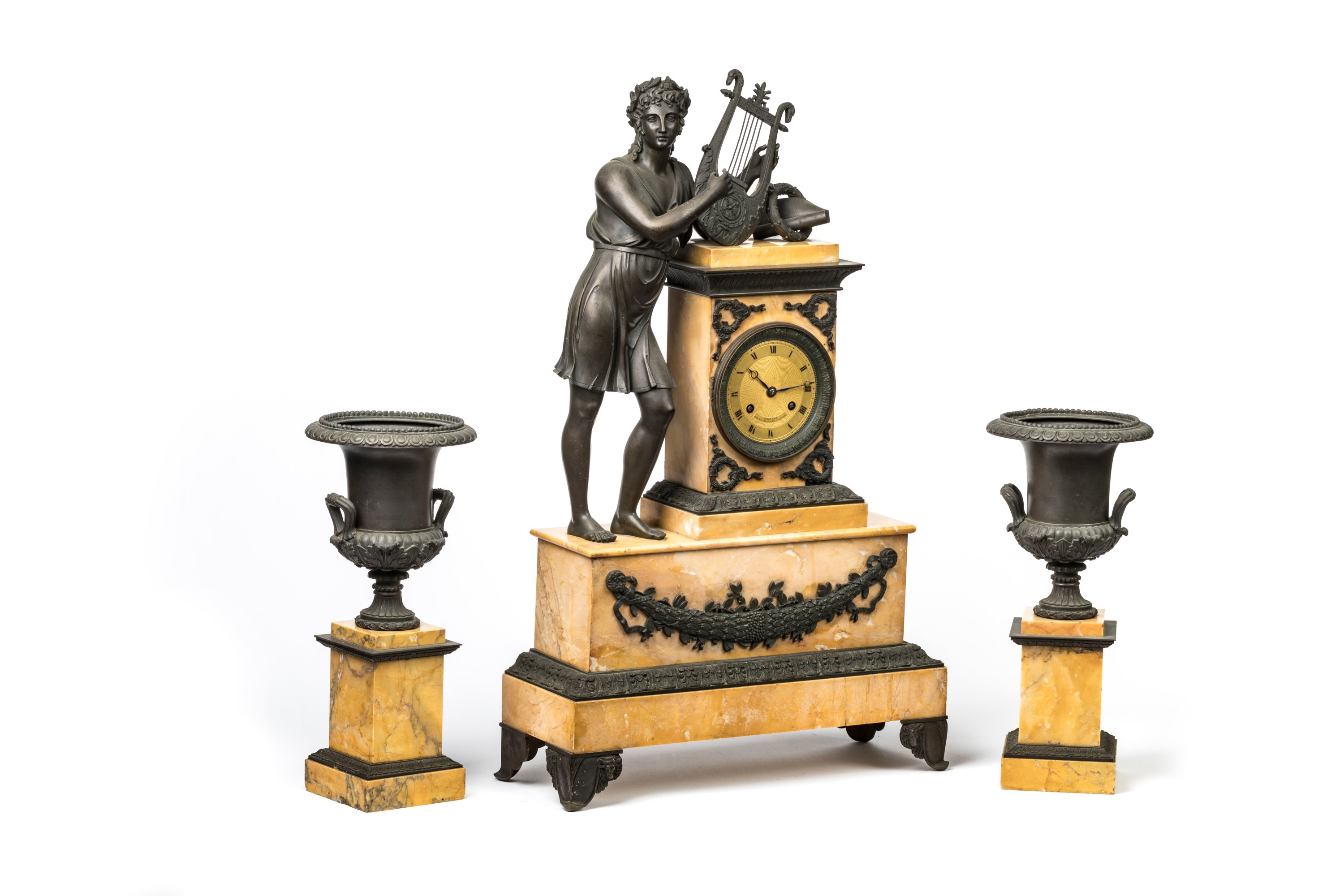 Restauration period. A French bronze and yellow marble garniture by François Xavier Stiennon comprised of a mantel clock decorated with a figure of Greek god Apollo and a pair of Medici vases.