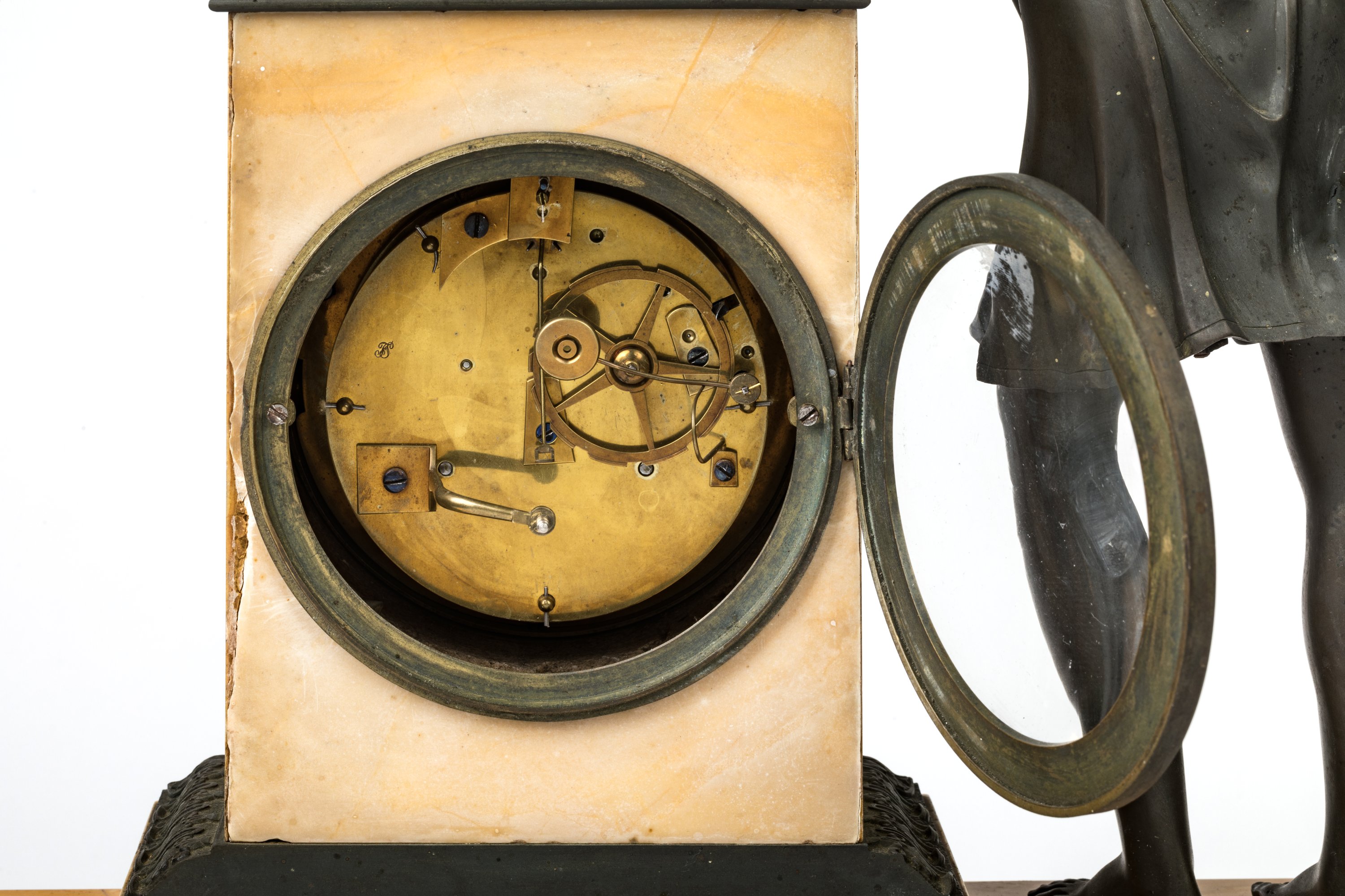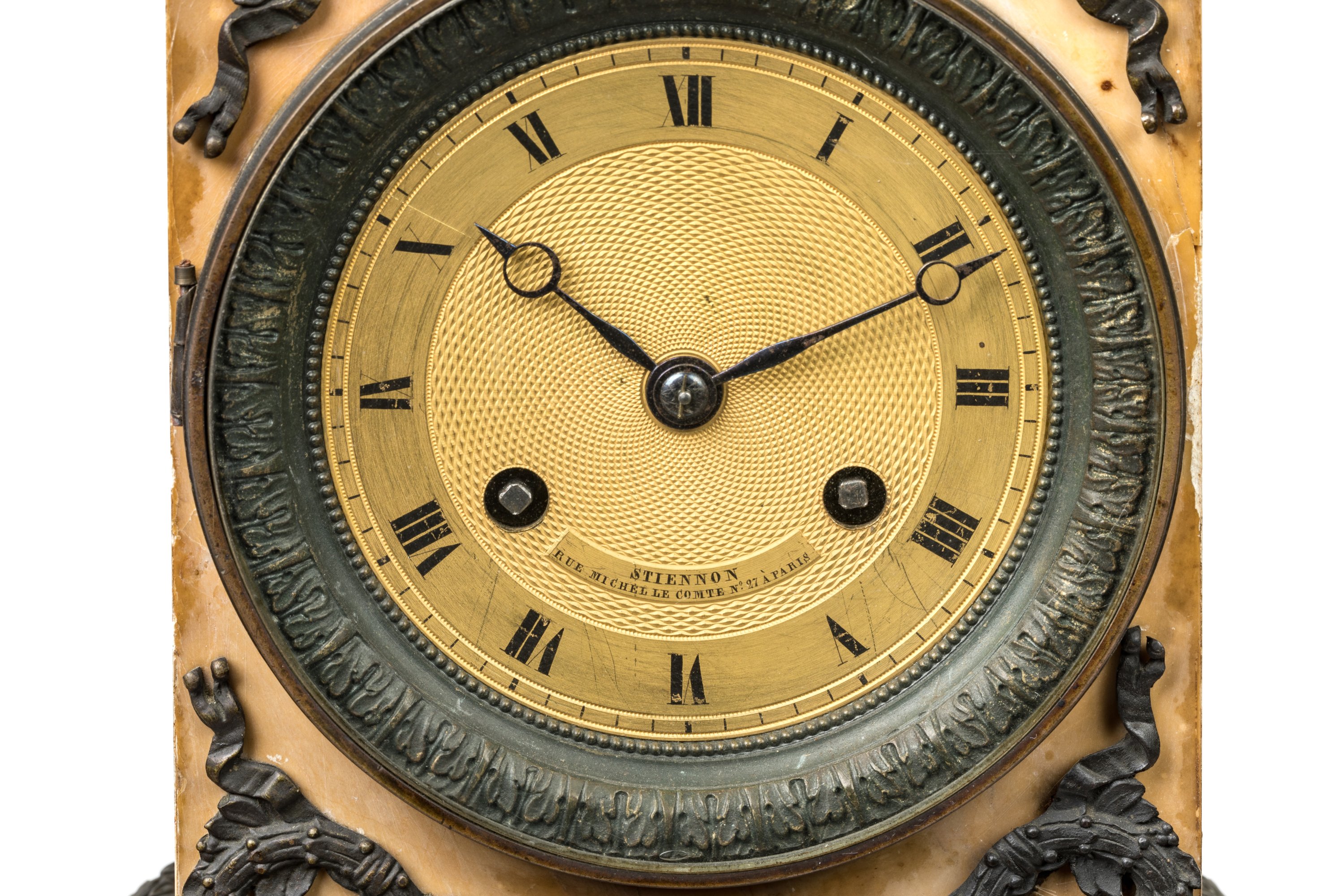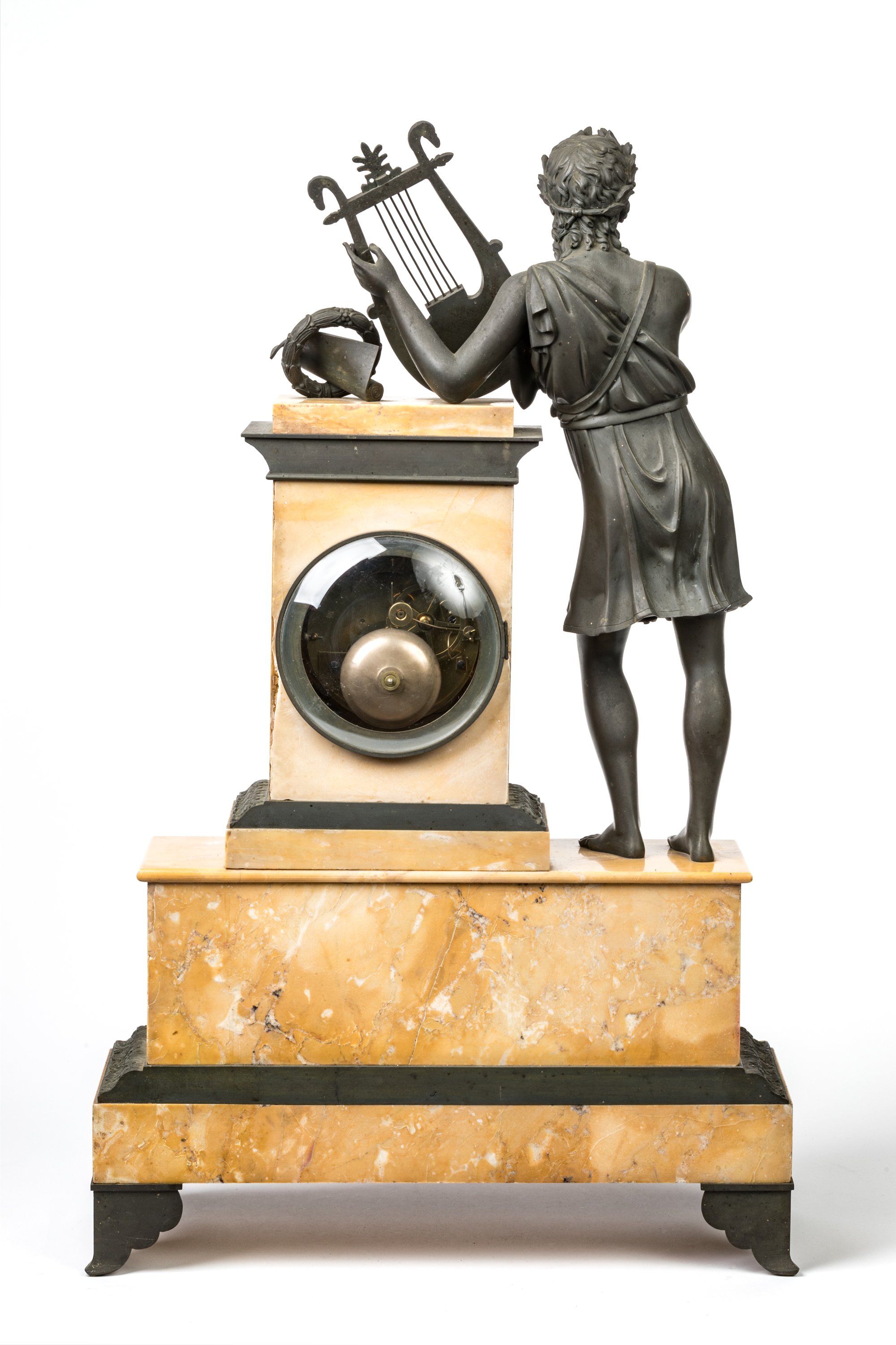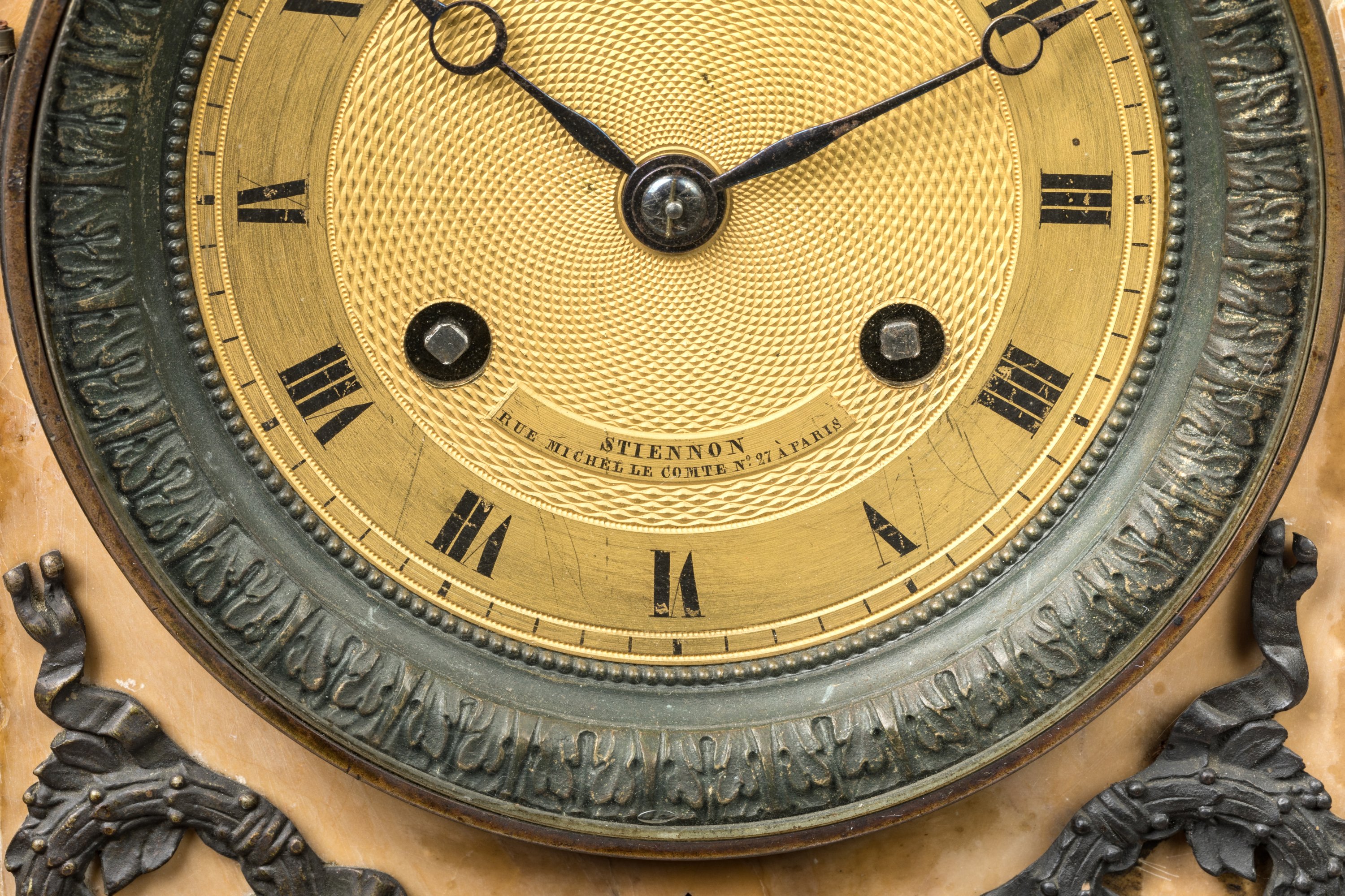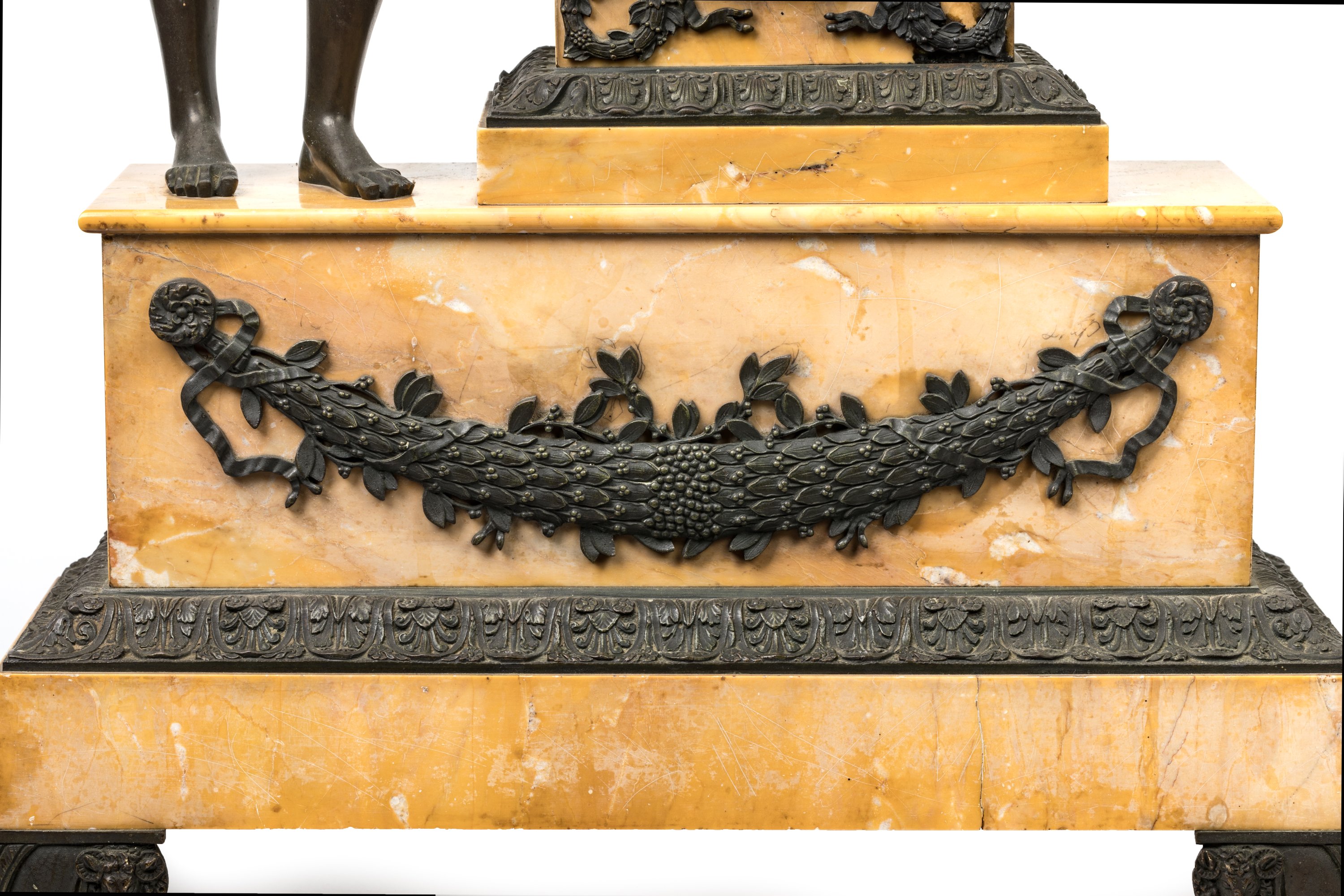 en bronze patiné et marbre jaune Sienne, comprenant une paire de vases Médicis et une pendule. Le dieu en pied est accoudé à un chapiteau corinthien dans lequel s'inscrit le cadran d'une pendule signée "STIENNON, rue Michel Le Compe n°27 à Paris".