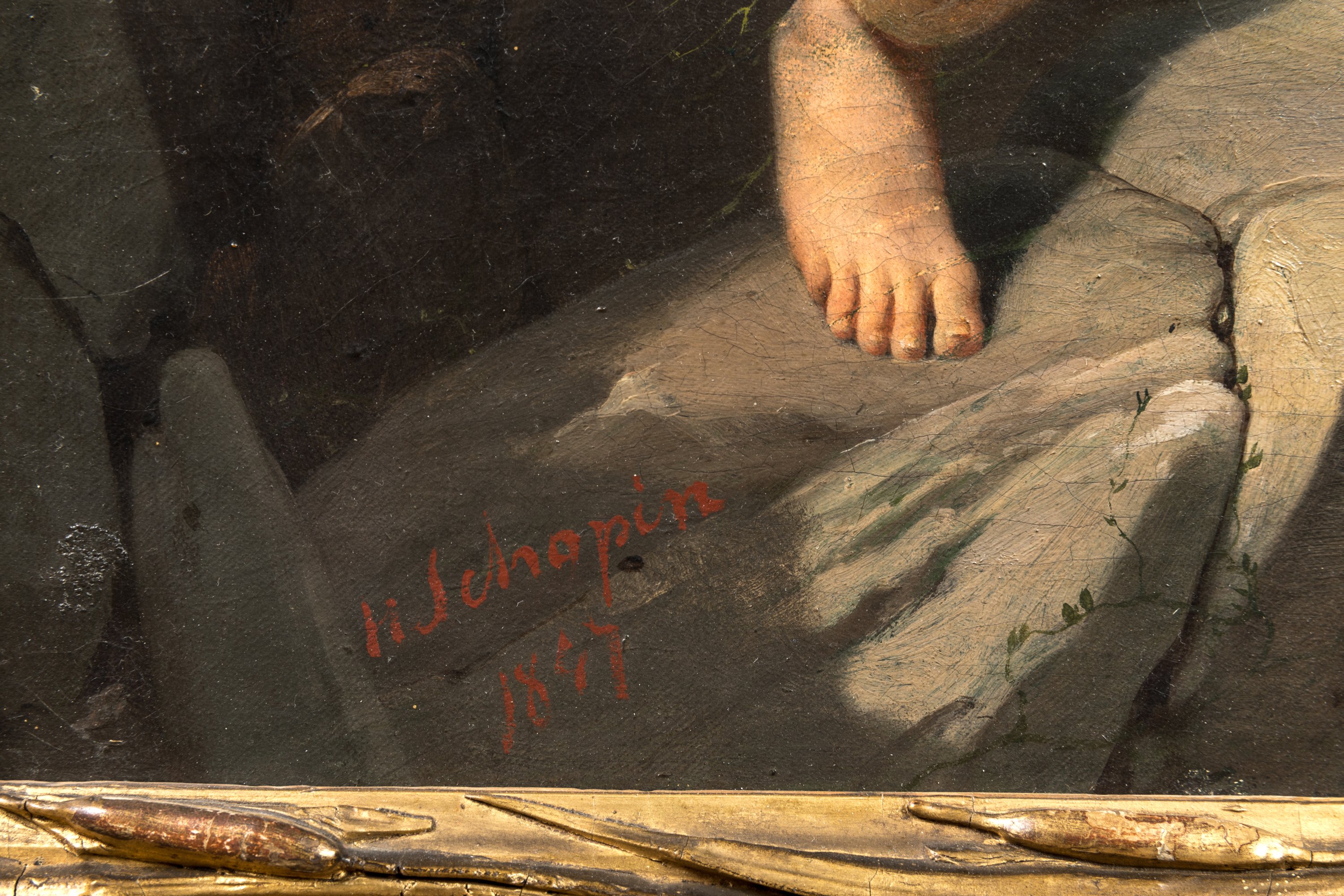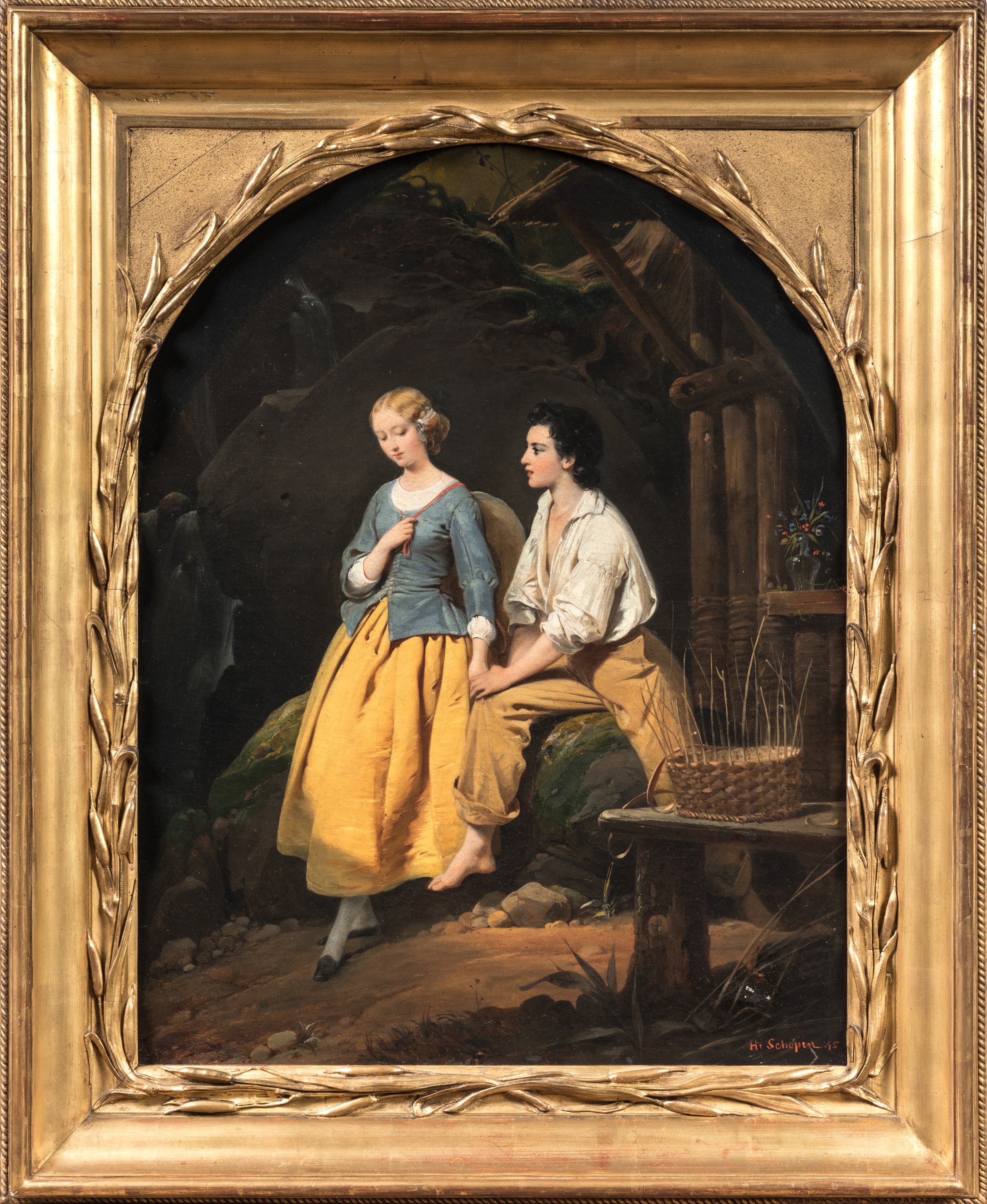 A pair of paintings by Henri Frédéric Schopin, one depicting Paul & Virginie (1845) and the other, Paul (1847), title characters of a novel by Bernardin de Saint-Pierre. In lavish carved giltwood frames.